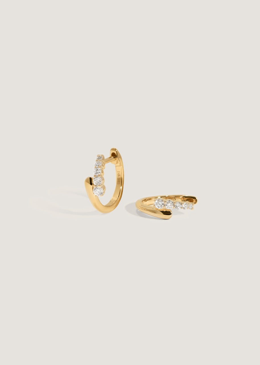 A sculptural take on your everyday diamond huggie—featuring five round diamonds that taper in size, mirroring the shape of its solid gold counterpart. We love it styled with classic huggies, your favorite studs, or worn alone.