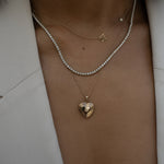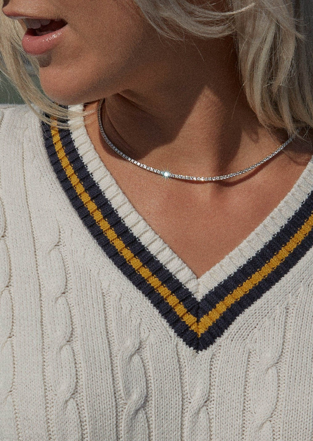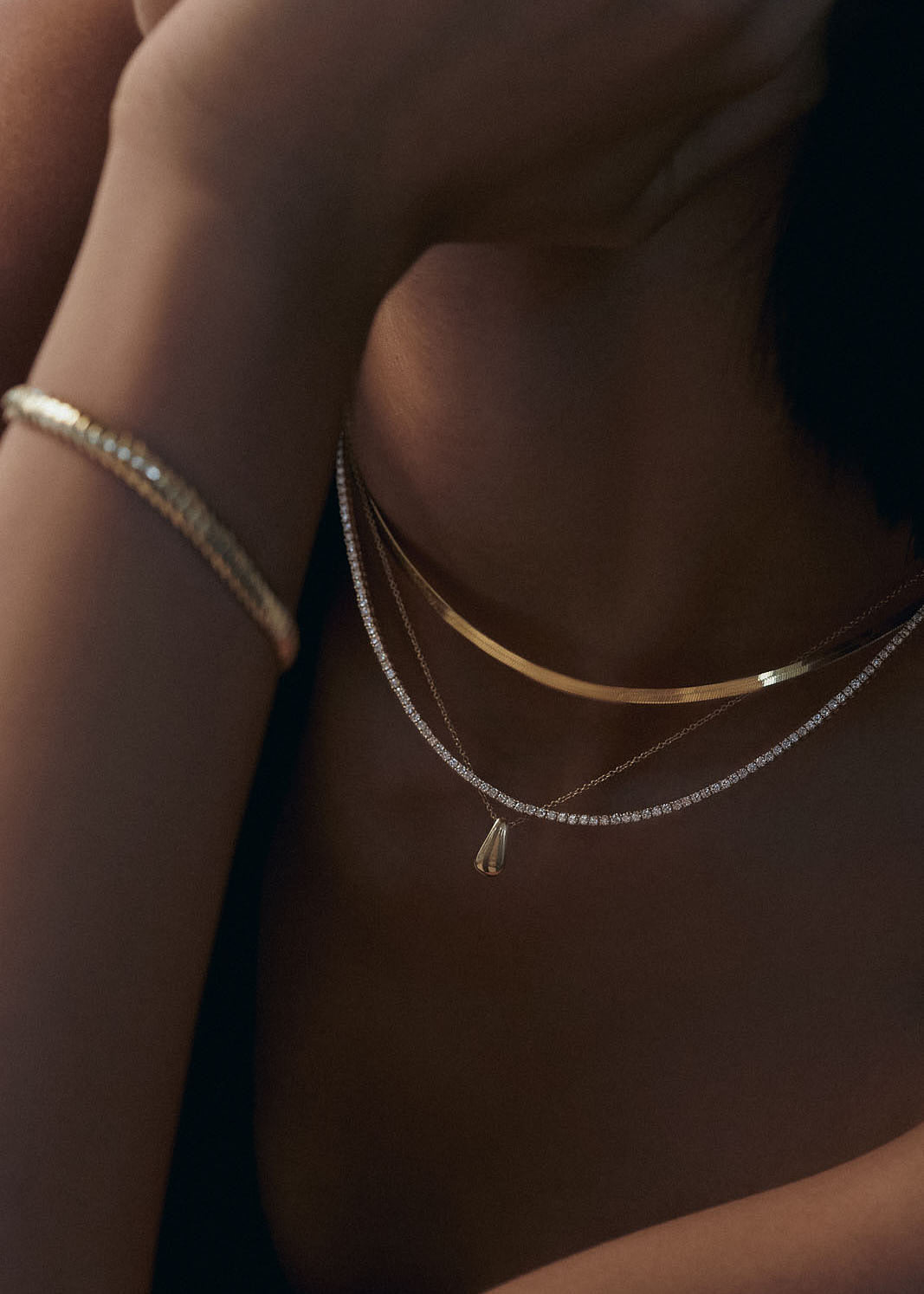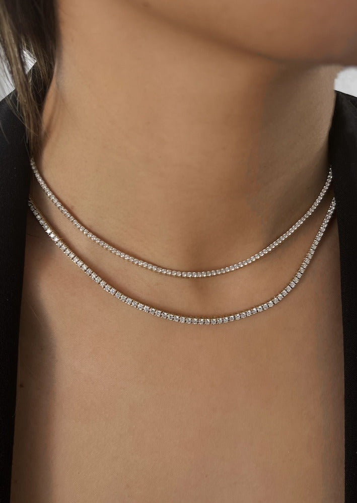This classic tennis necklace features 2mm natural round diamonds four-prong set in 14k gold. Make a statement and wear Diana without anything else.