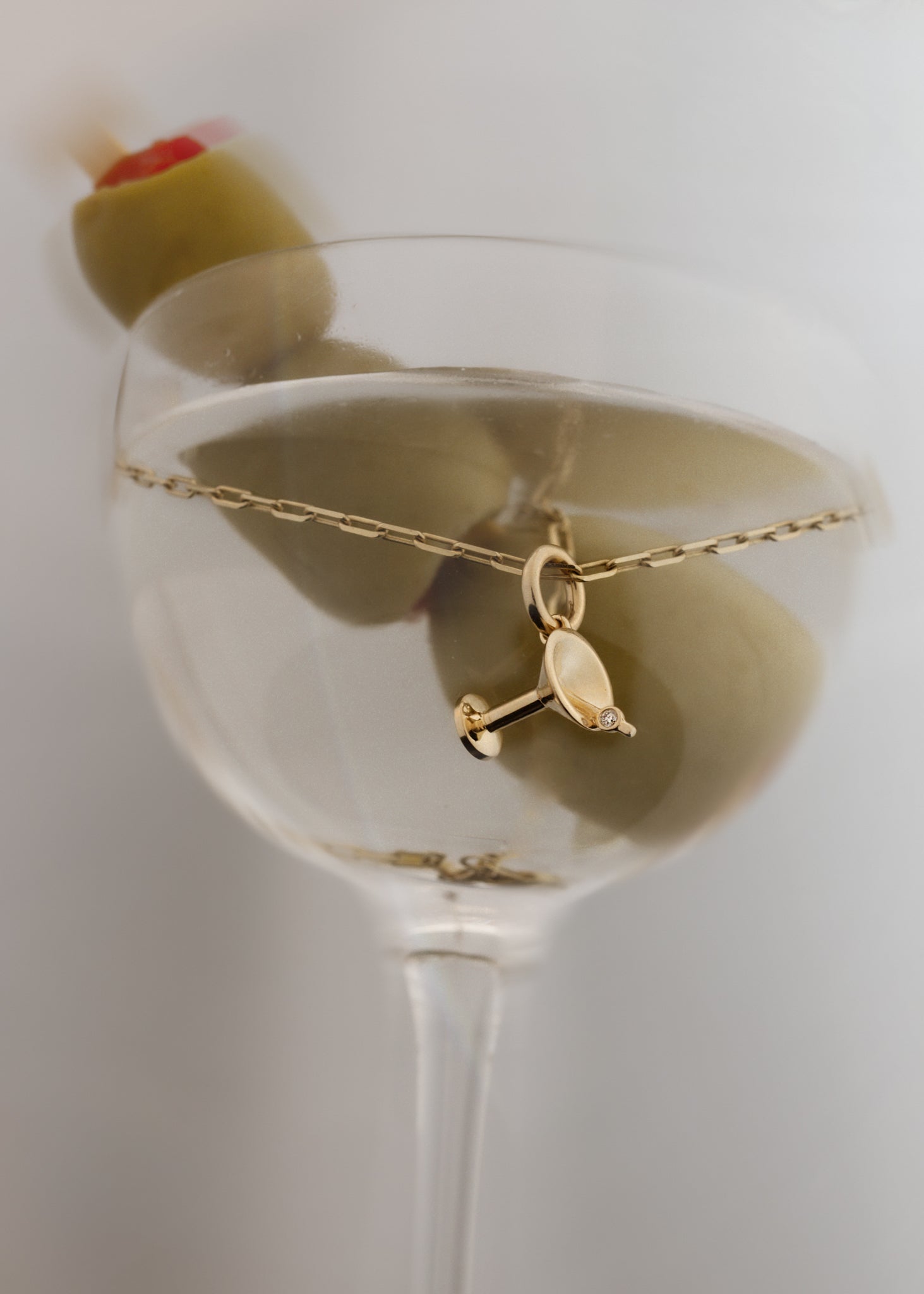 Crafted in 14k solid gold with meticulous detail, this playful charm features a martini glass and an olive garnish. Add a lively element to your charm collection or give it as a gift for someone who embraces their fun side.