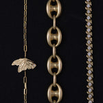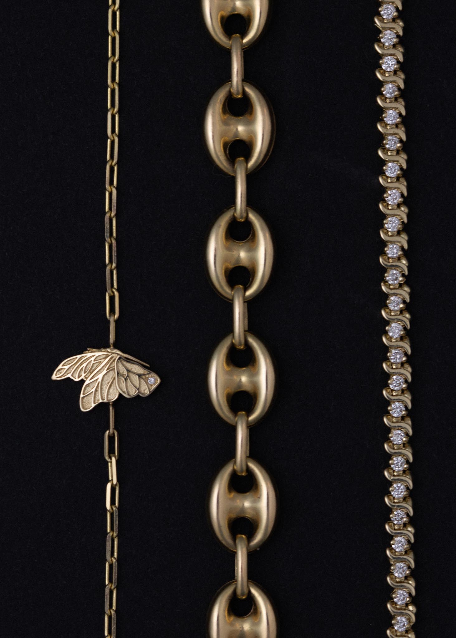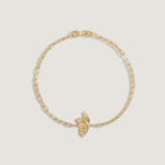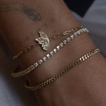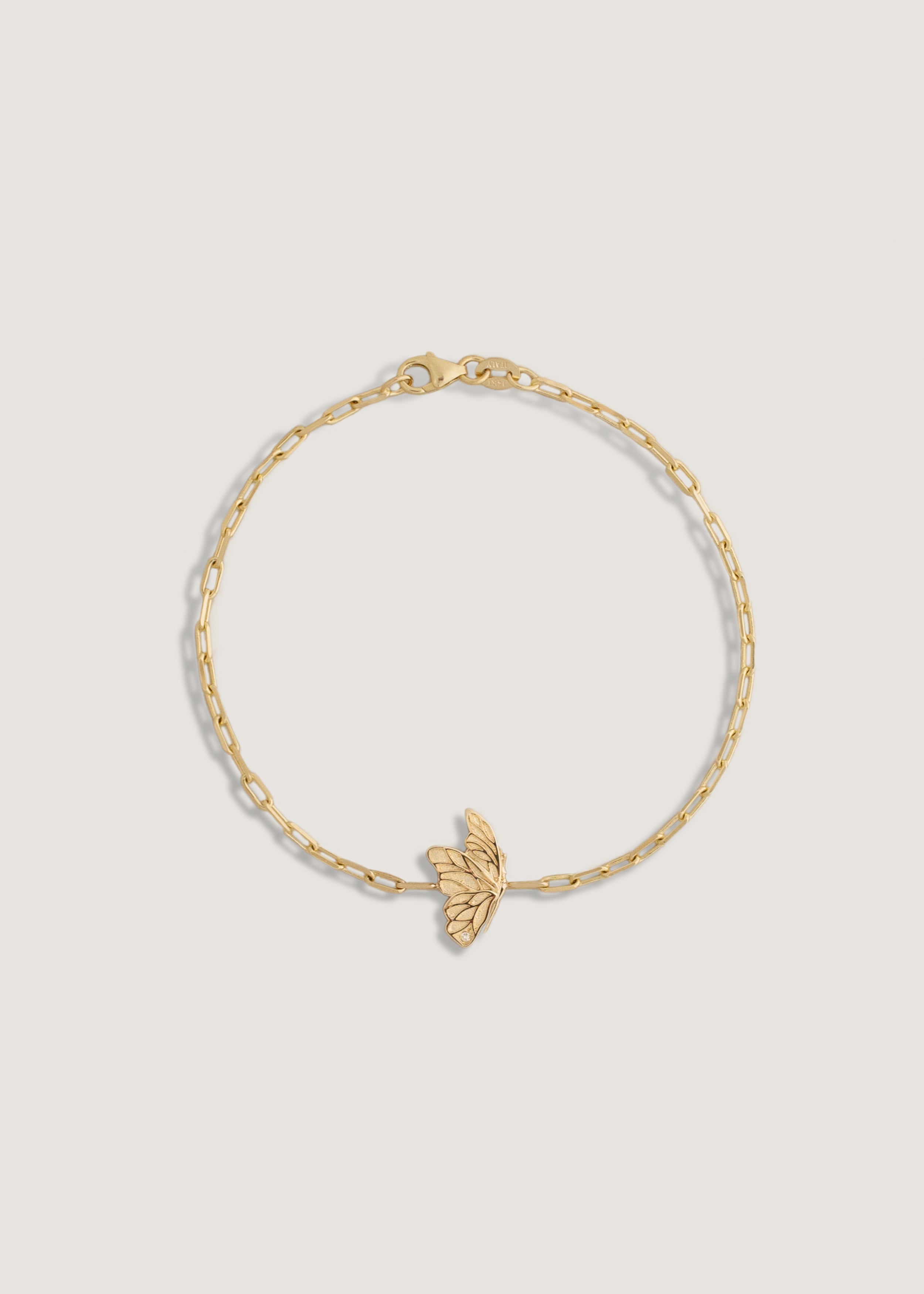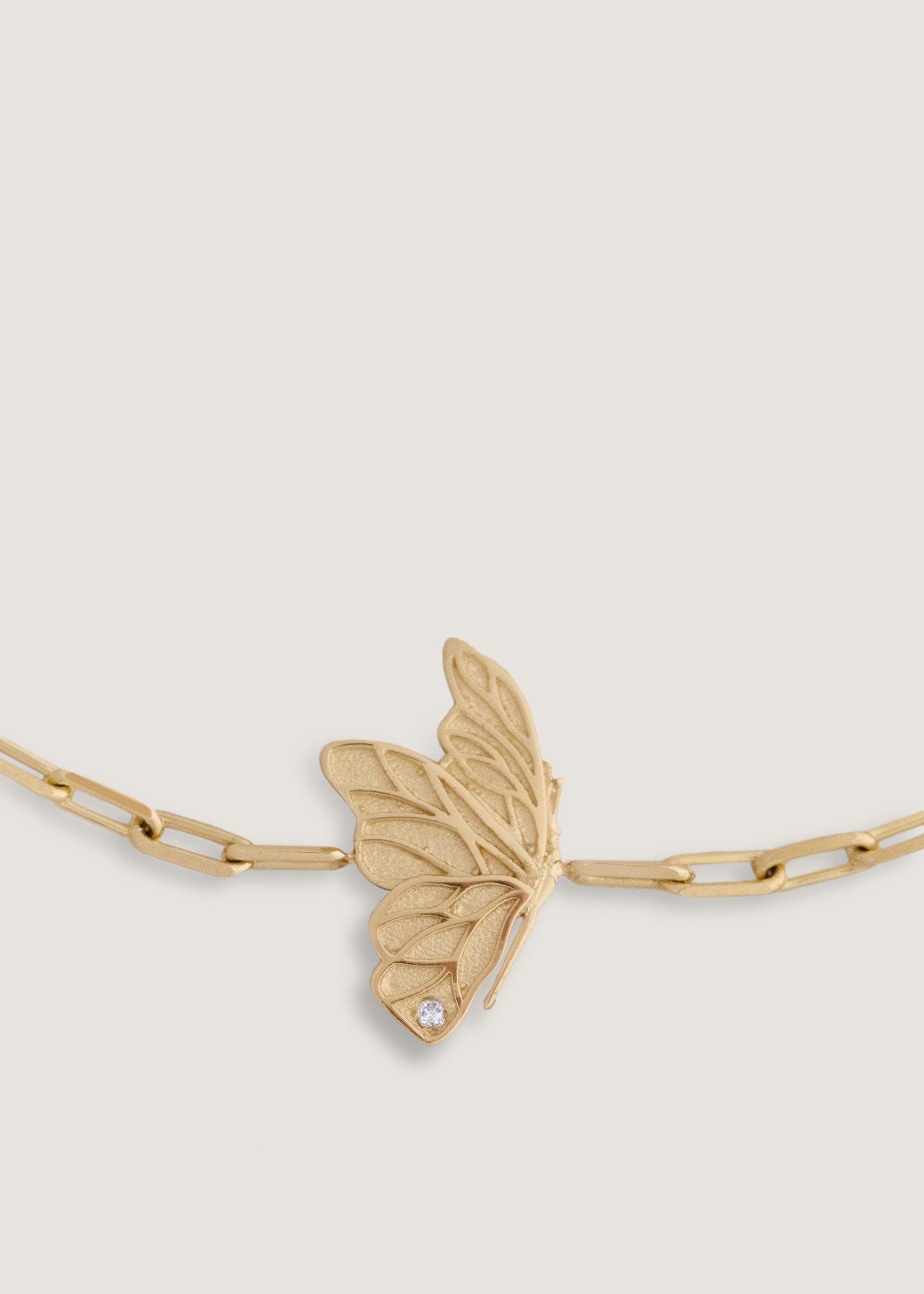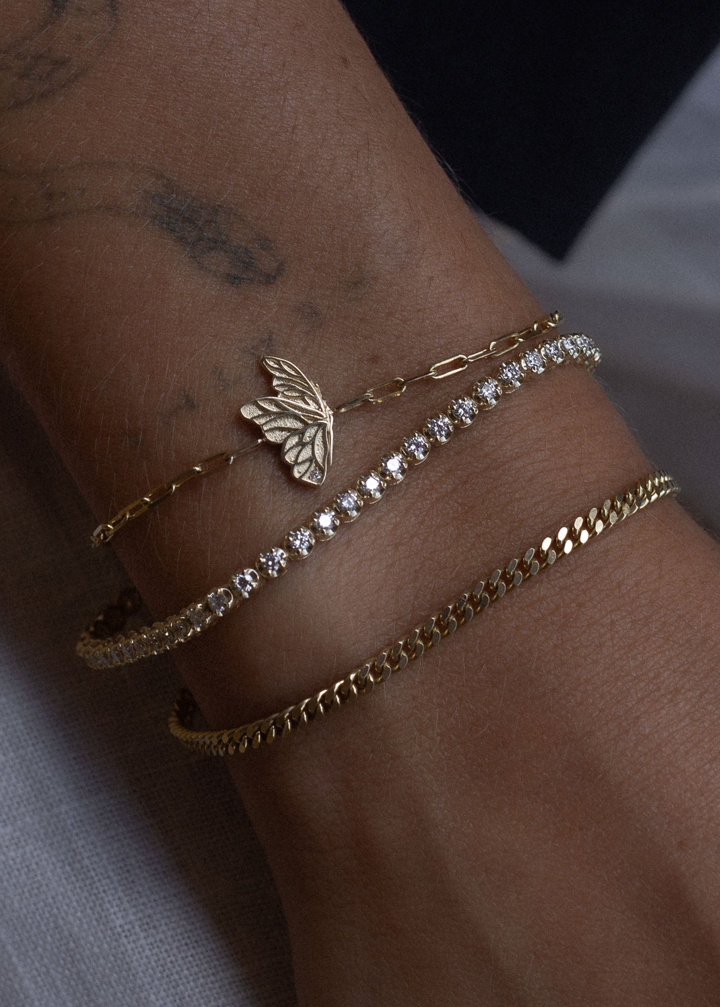 The Iris Bracelet showcases a finely textured butterfly wing adorned with a single round diamond, set on our Micro Link Chain. Wear it solo or paired with a diamond tennis bracelet, and treasure it for generations to come.