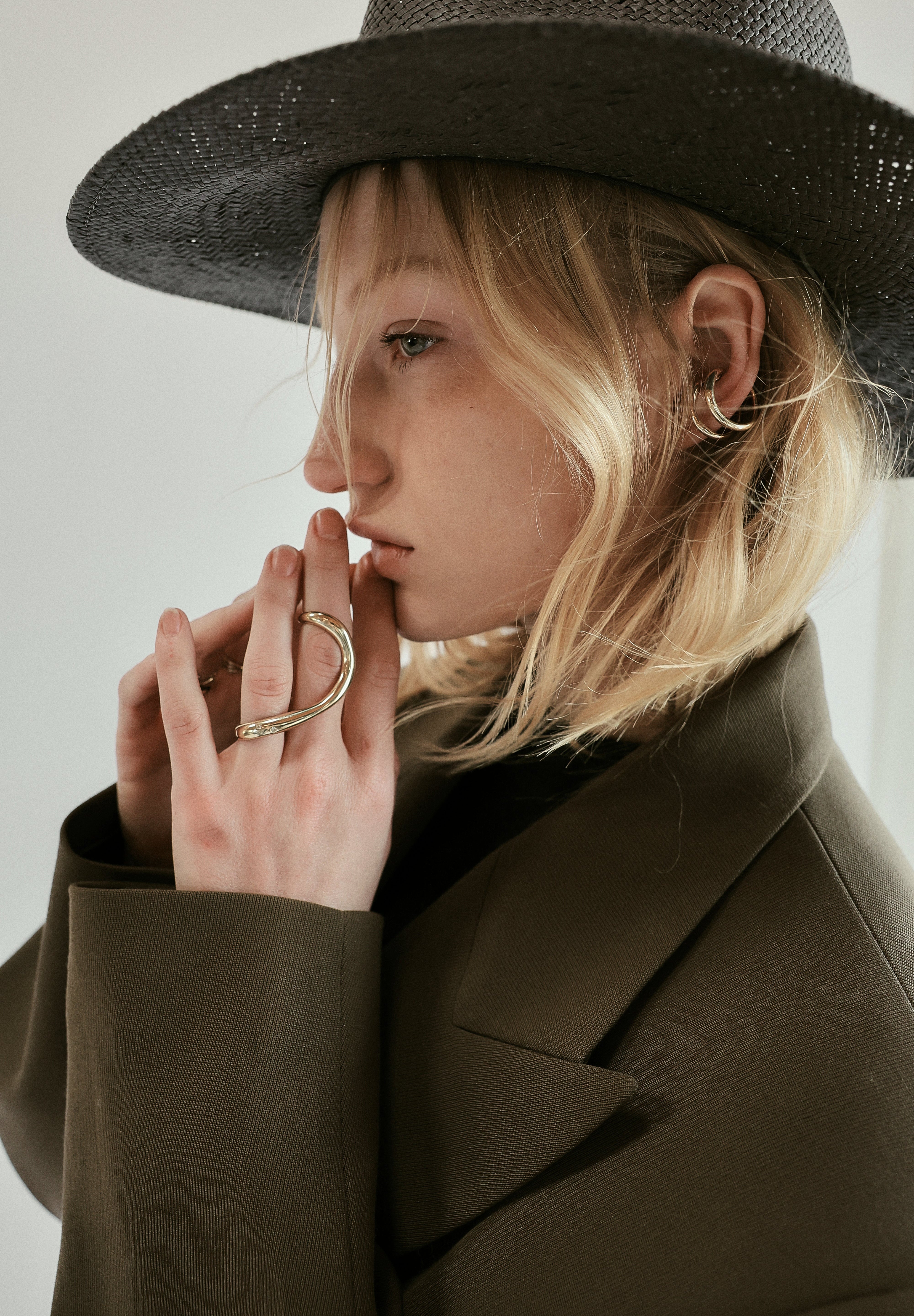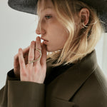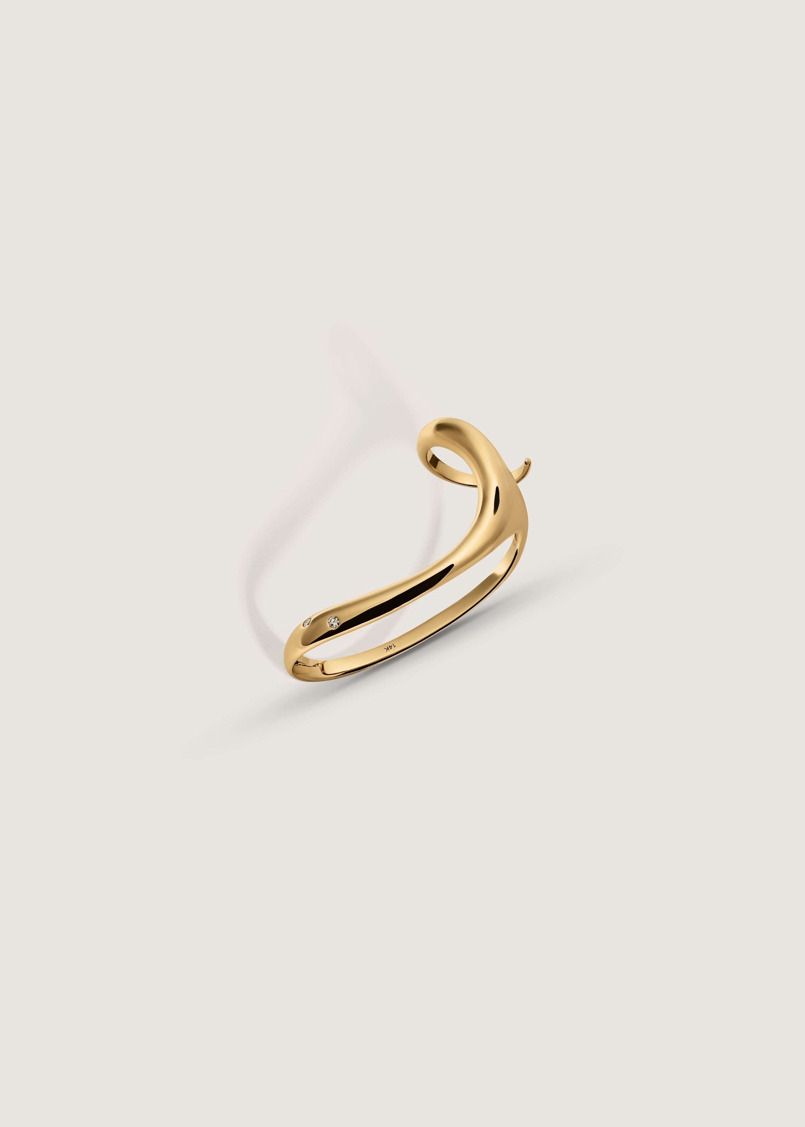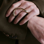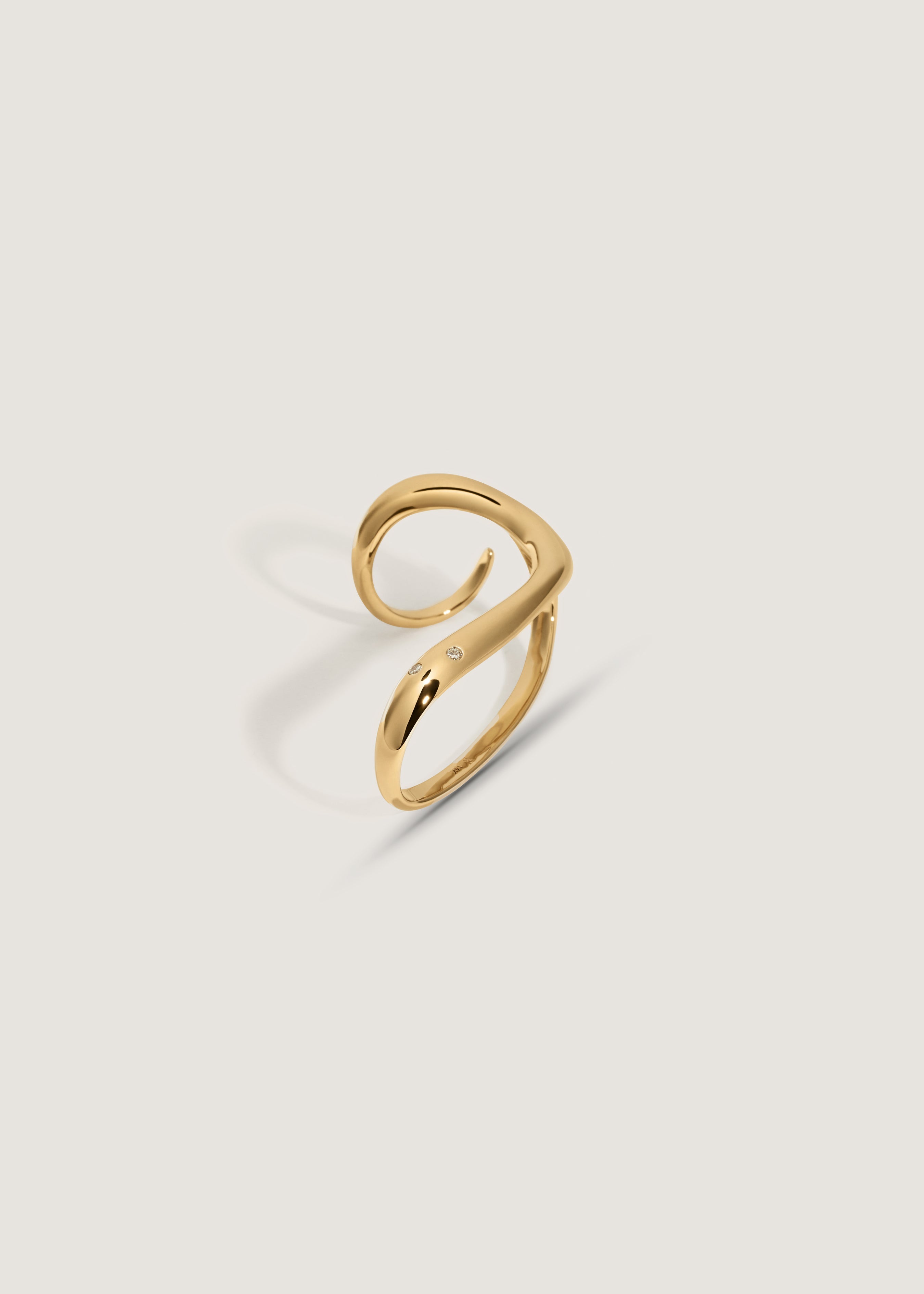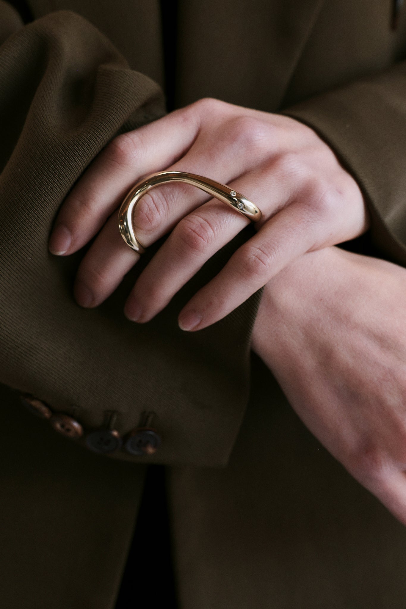 Fluid and dynamic. Our J double finger ring with diamonds is a sculptural depiction of water’s movement. Solid 14k gold wraps around two fingers and curves into a double passage ring on one finger, resulting in wearable art.