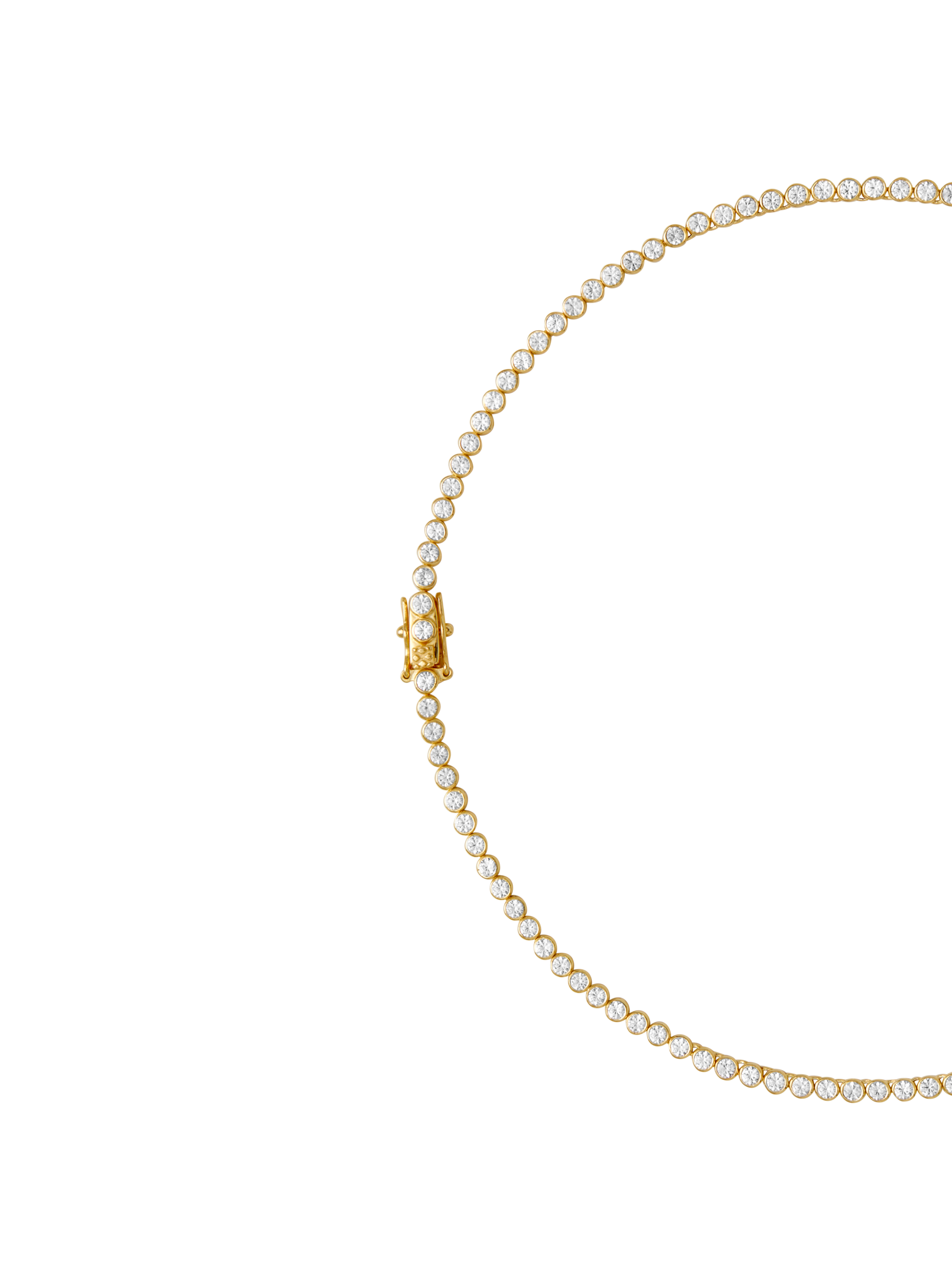 Our most worn James Bezel Rivière debuts in new form. A graduated strand of lab-grown white sapphires bezel set in 18k gold vermeil.