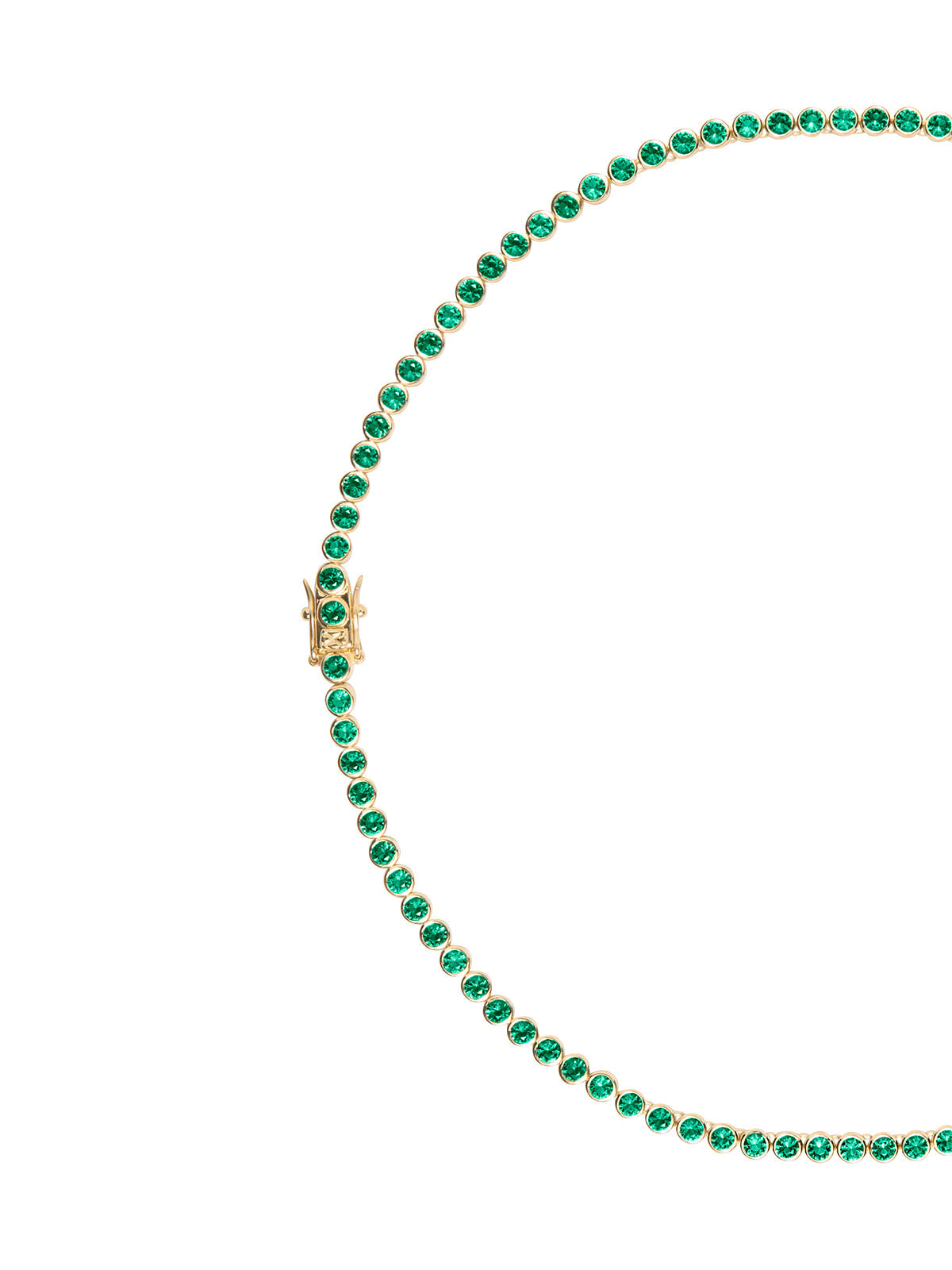 The emerald green James Bezel Rivière features lab-grown nano crystal emeralds in a bezel setting that outlines each stone with a slim border of 18-karat gold-coated sterling silver.