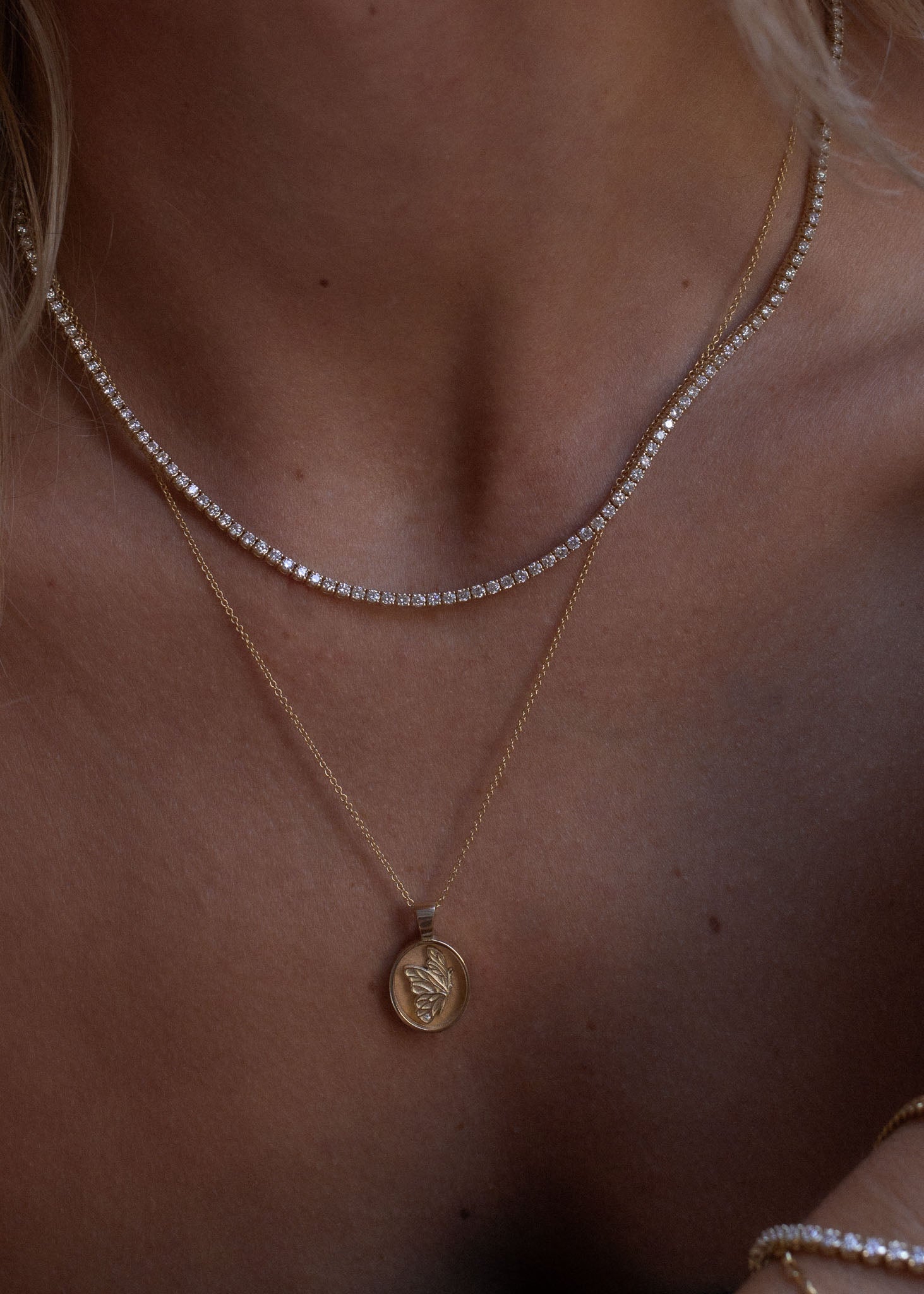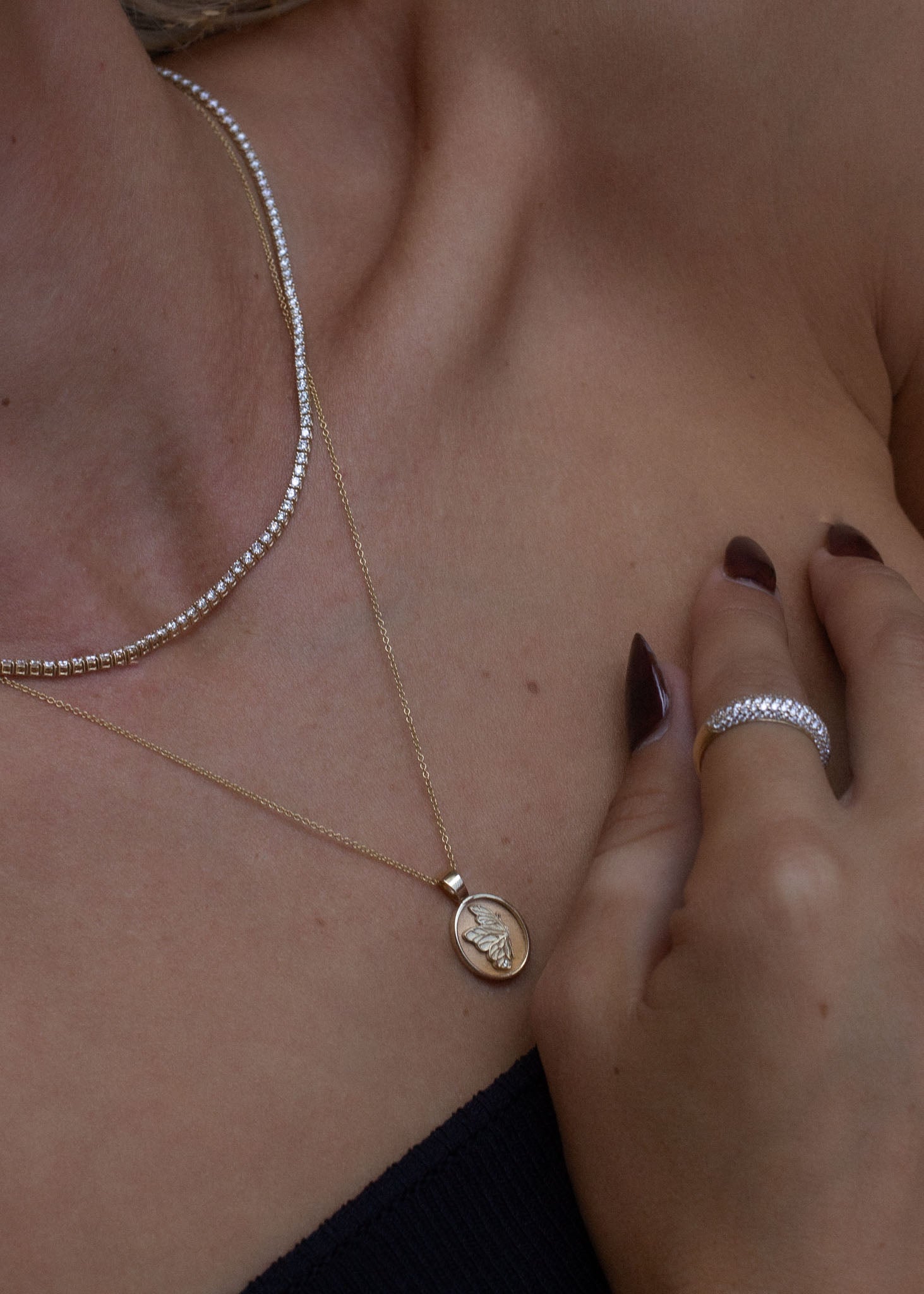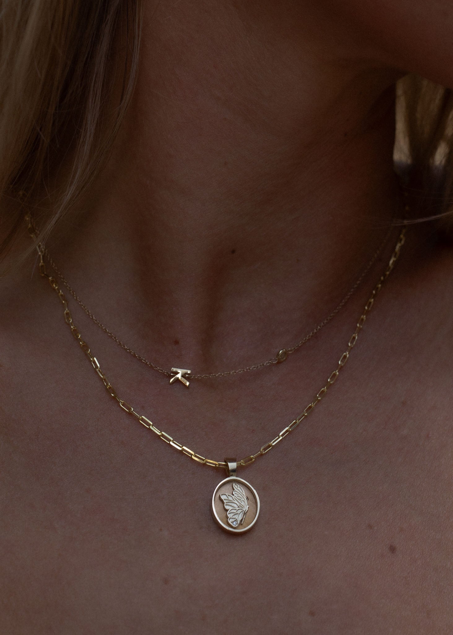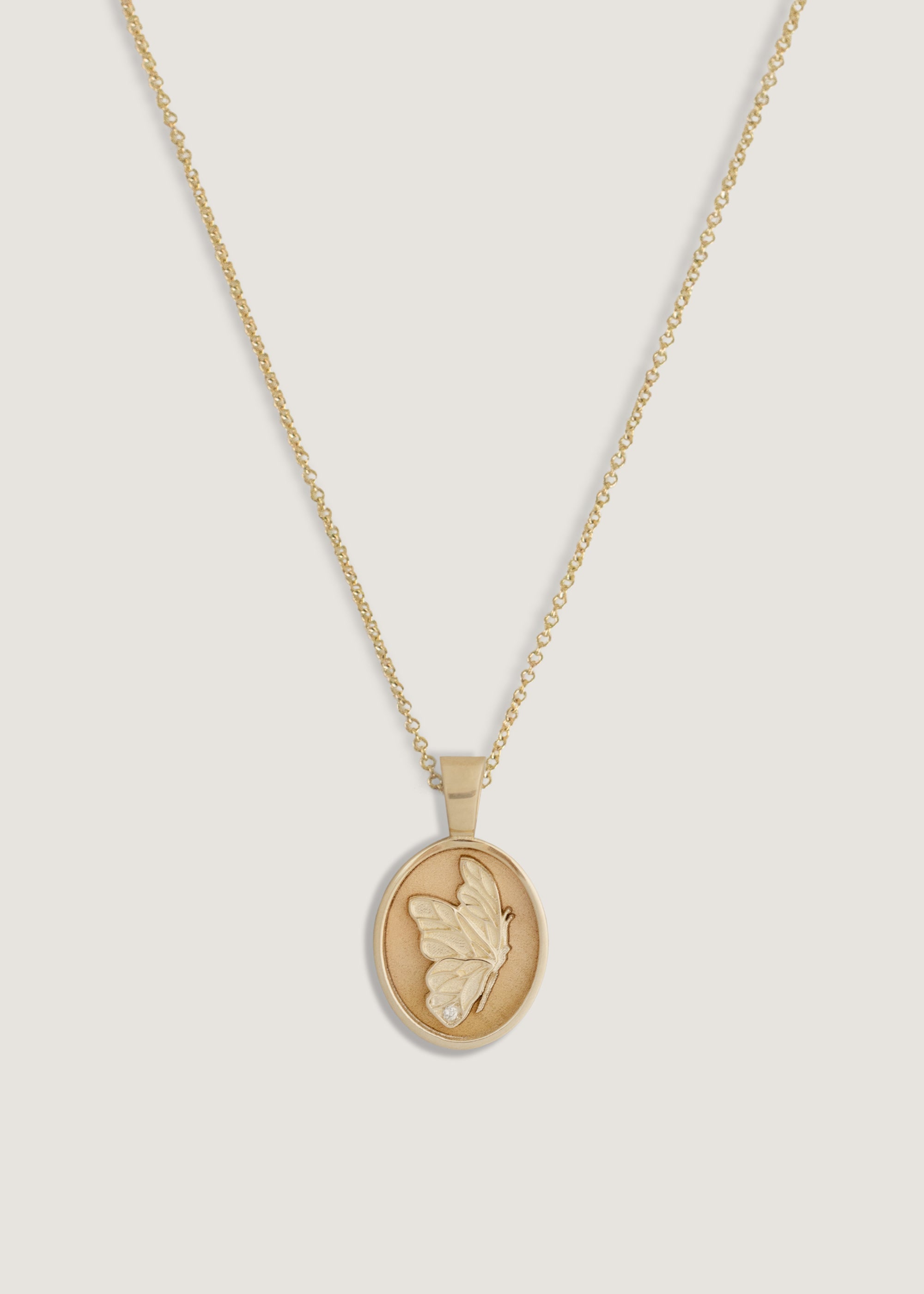 The Juliette Butterly Necklace features a finely textured butterfly wing pendant adorned with a single round diamond. Style with a timeless herringbone chain and pass it down for generations.