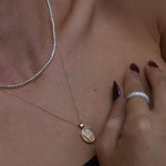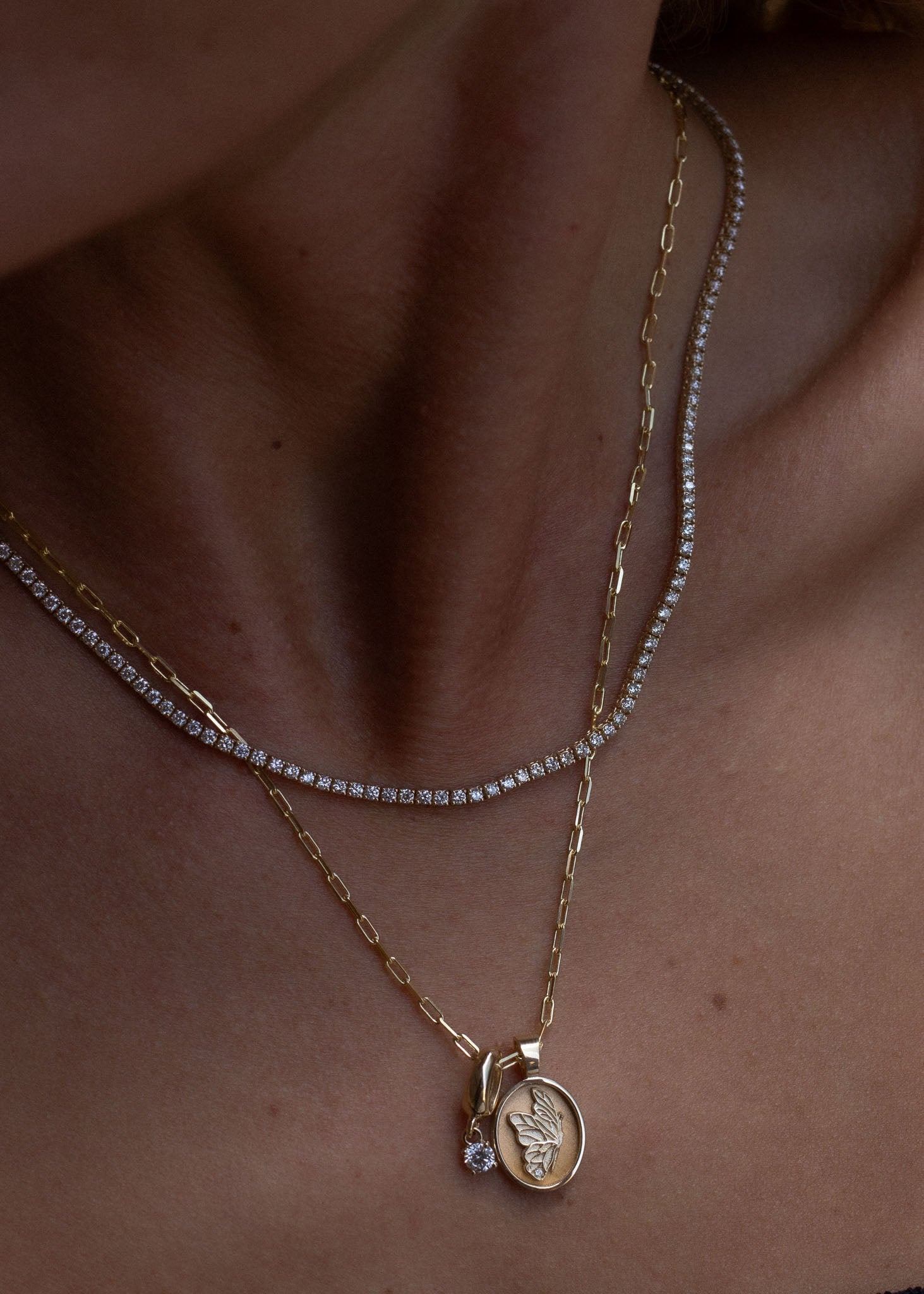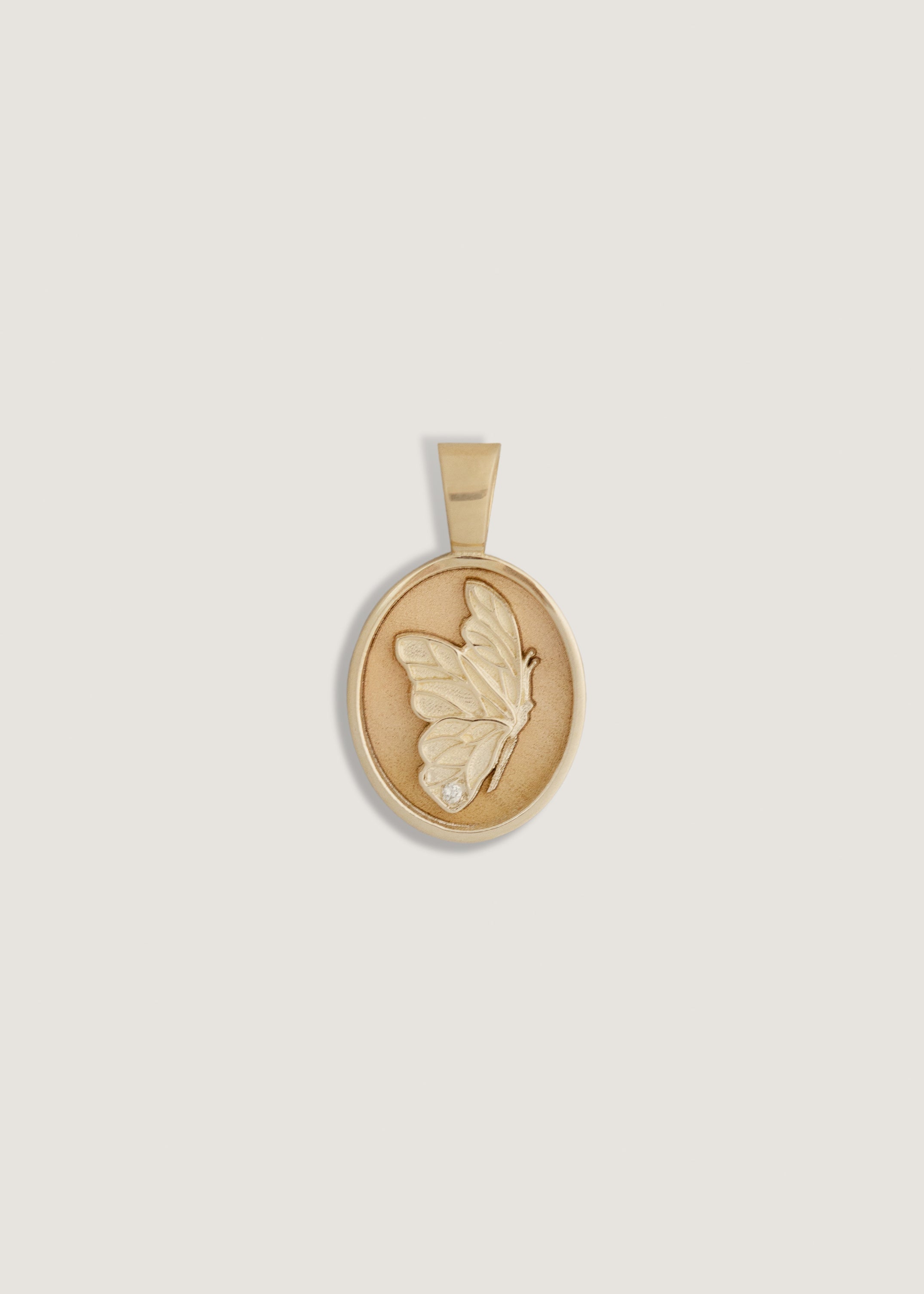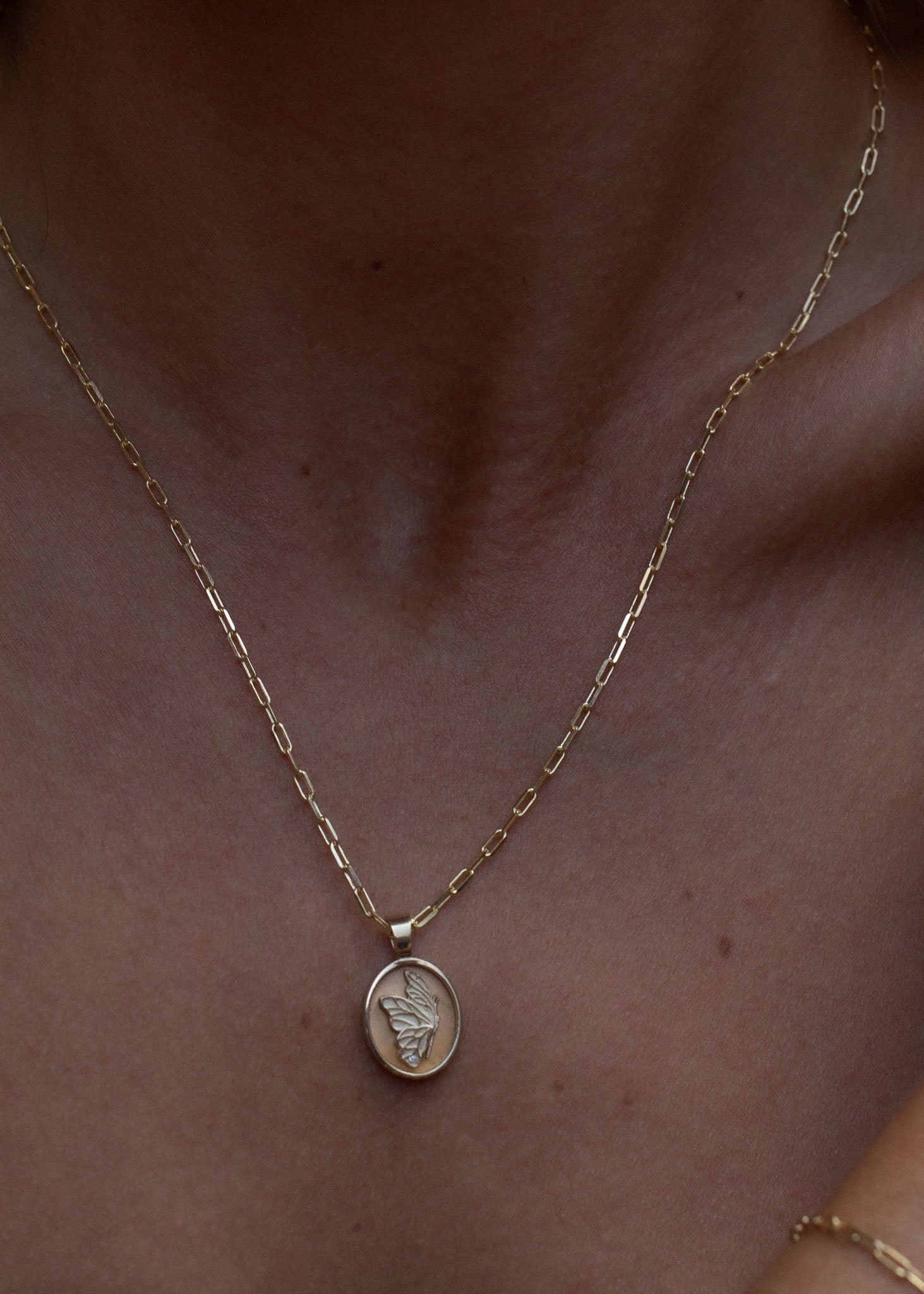 The Juliette Butterly Necklace features a finely textured butterfly wing pendant adorned with a single round diamond. Style with a timeless herringbone chain and pass it down for generations.