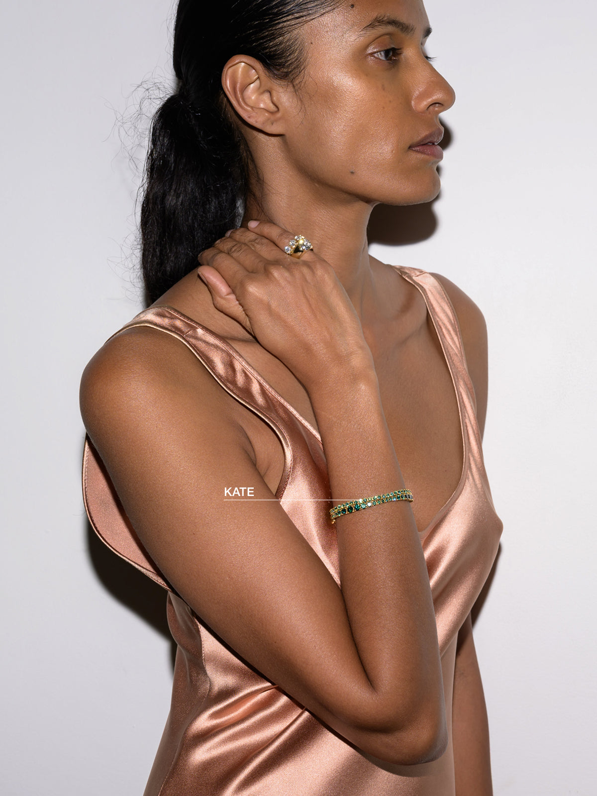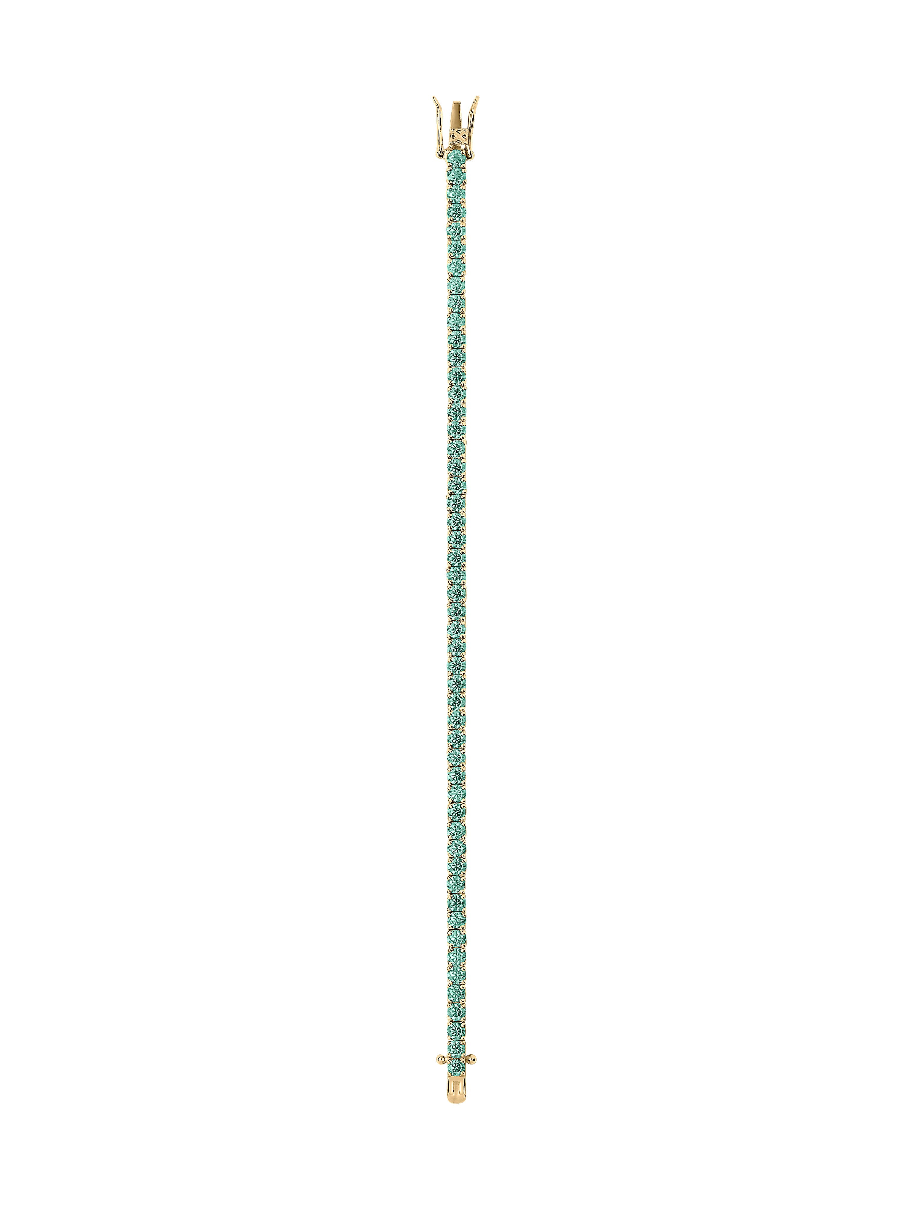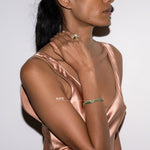The Kate Rivière Bracelet features 3MM lab-grown viridian green moissanite gemstones, each secured in a timeless four-prong setting and finished in 18k gold vermeil. Meticulously crafted with fine-jewelry integrity, this refined tennis bracelet is designed for everyday wear and secured with a box clasp and double safety hooks for added security.