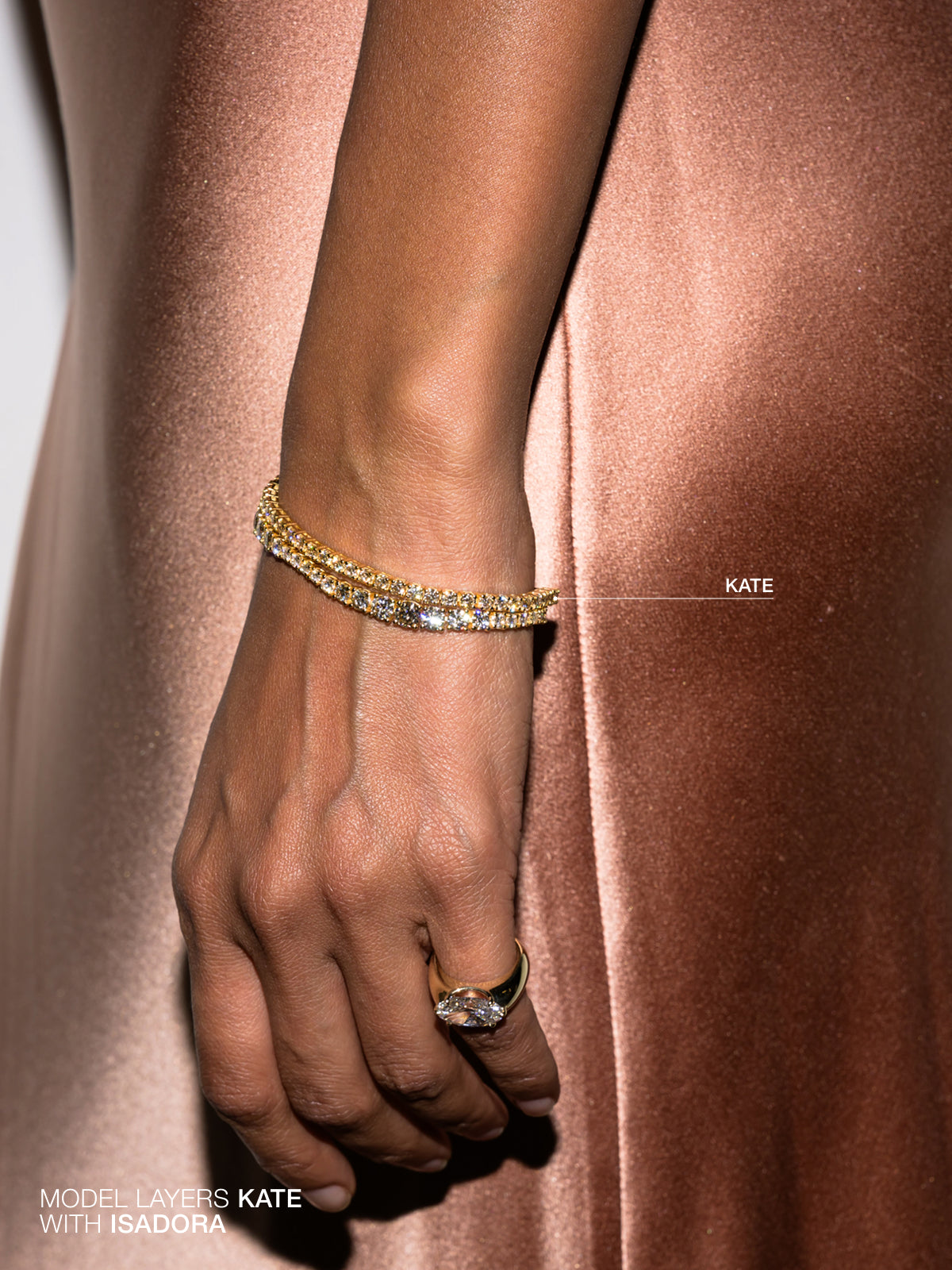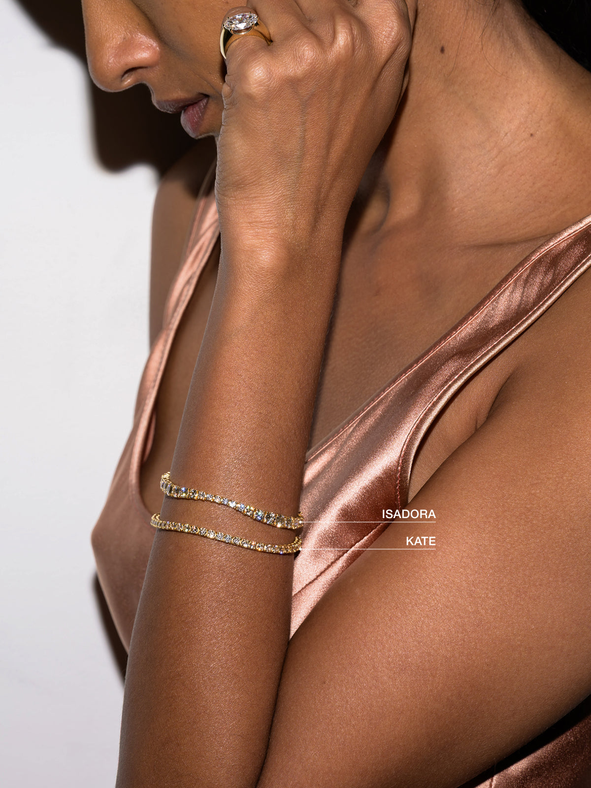 The Kate Rivière Bracelet features 3MM lab-grown honey moissanite gemstones, each secured in a timeless four-prong setting and finished in 18k gold vermeil. Meticulously crafted with fine-jewelry integrity, this refined tennis bracelet is designed for everyday wear and secured with a box clasp and double safety hooks for added security.