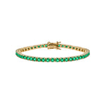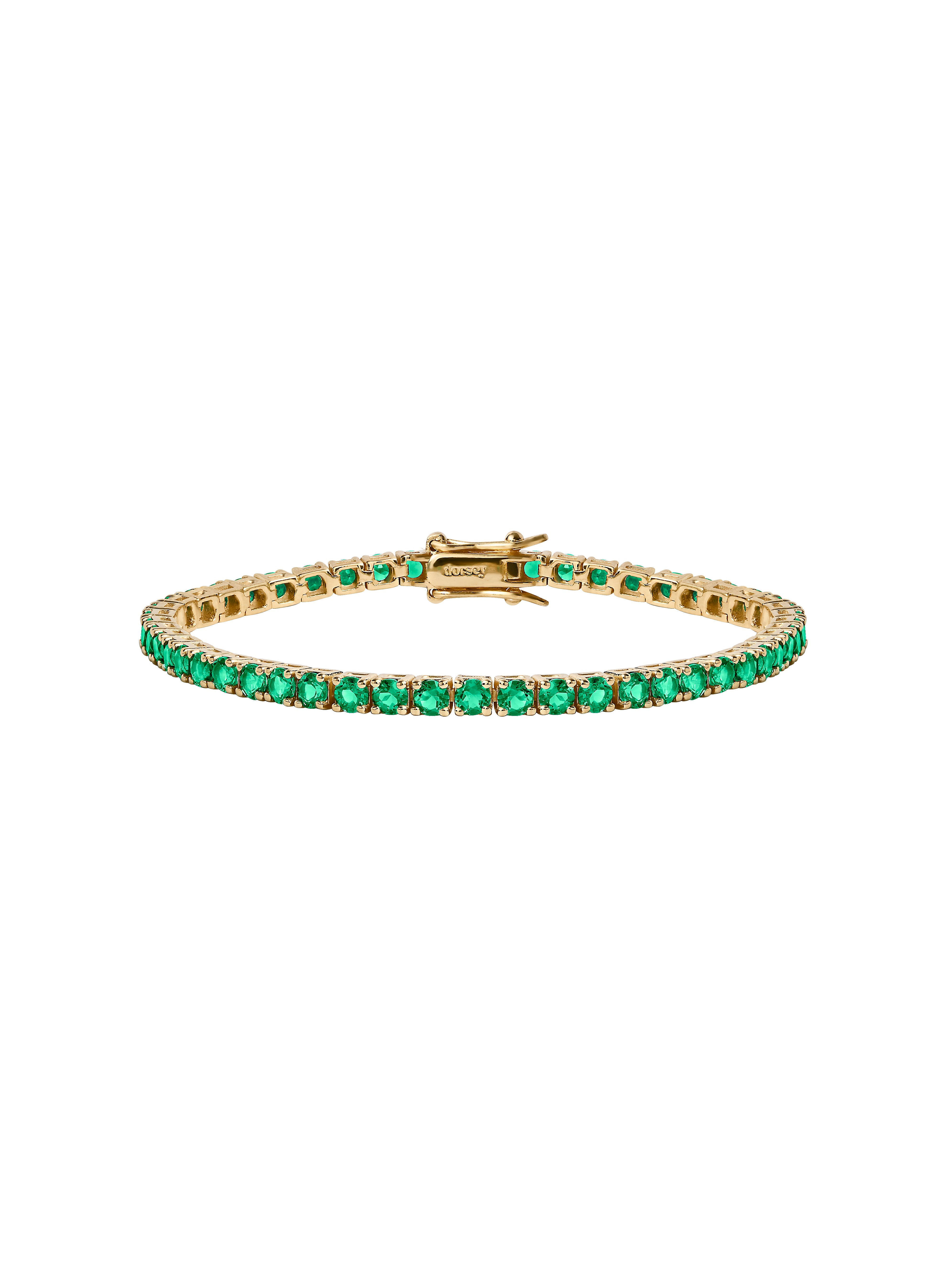 The Kate Rivière Bracelet features 3MM lab-grown emerald gemstones, each secured in a timeless four-prong setting and finished in 18k gold vermeil. Meticulously crafted with fine-jewelry integrity, this refined tennis bracelet is designed for everyday wear and secured with a box clasp and double safety hooks for added security.