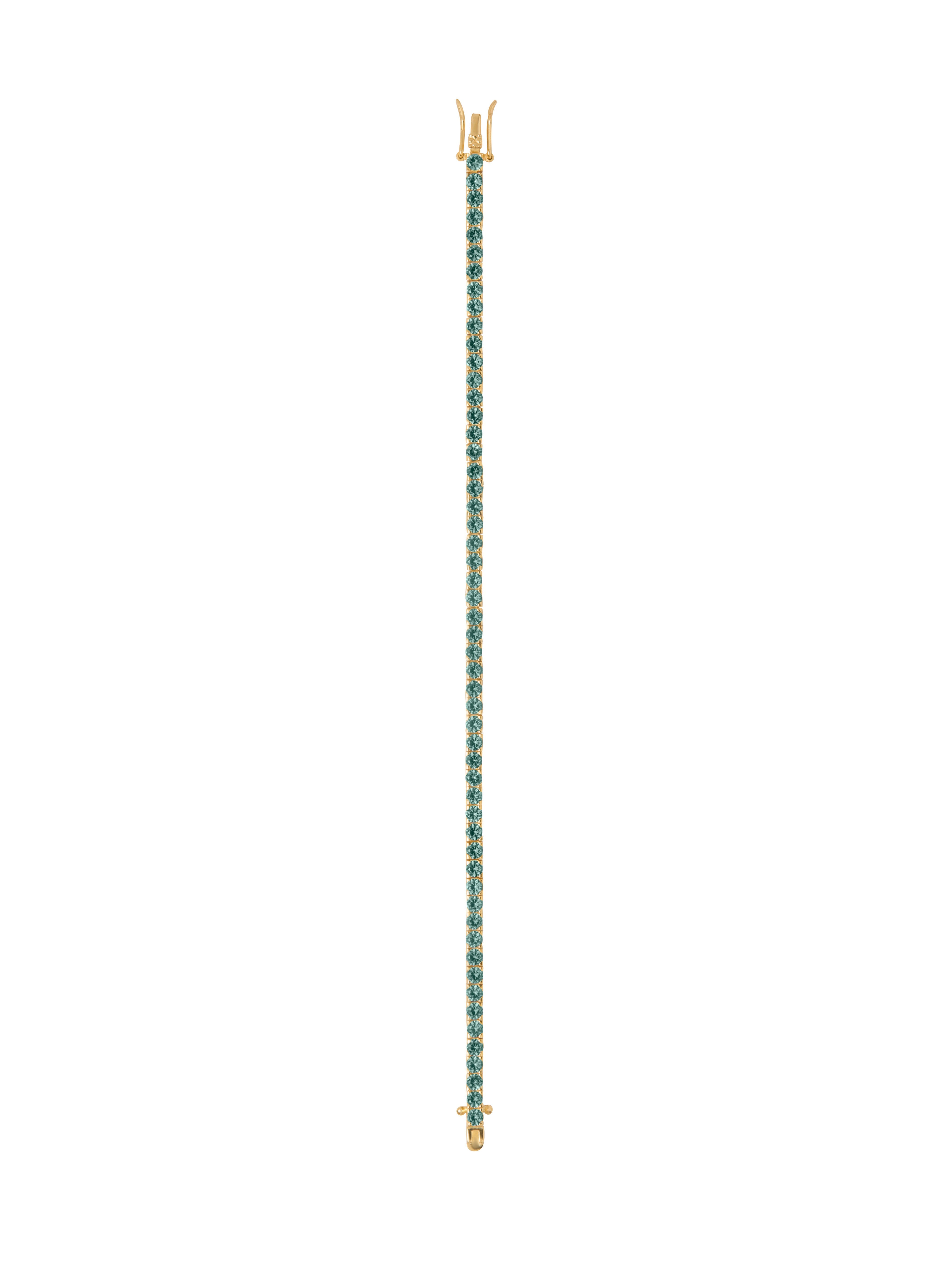 Our most-worn single-strand Rivière tennis bracelet, updated for the season in elegant color. Features 3MM lab-grown tourmaline gemstones in an earthy shade of moss green with soft blue undertones, in a classic four-prong setting of 18k gold vermeil. Crafted with fine-jewelry integrity, this piece is finished with double safety hooks for a secure clasp closure.