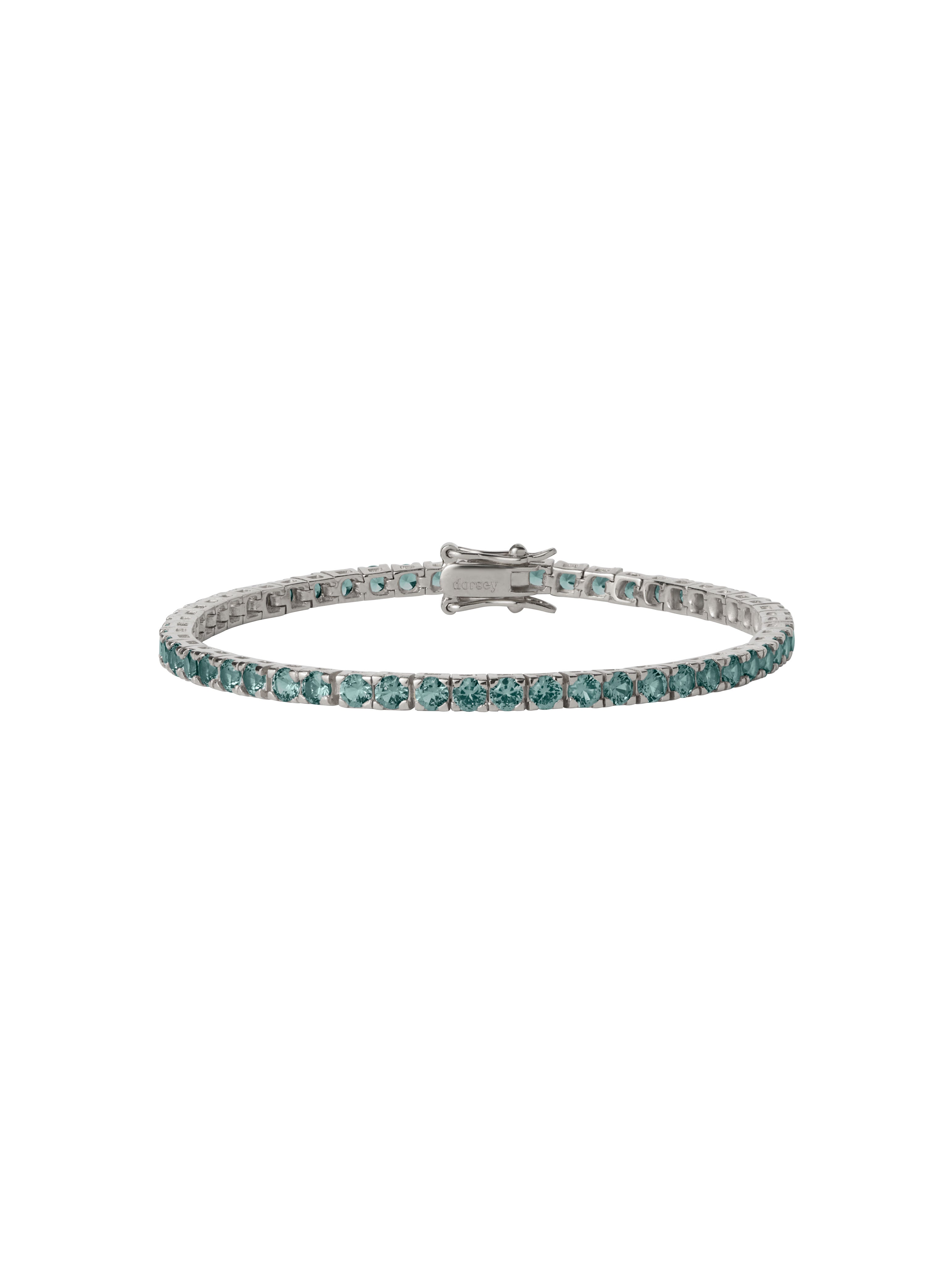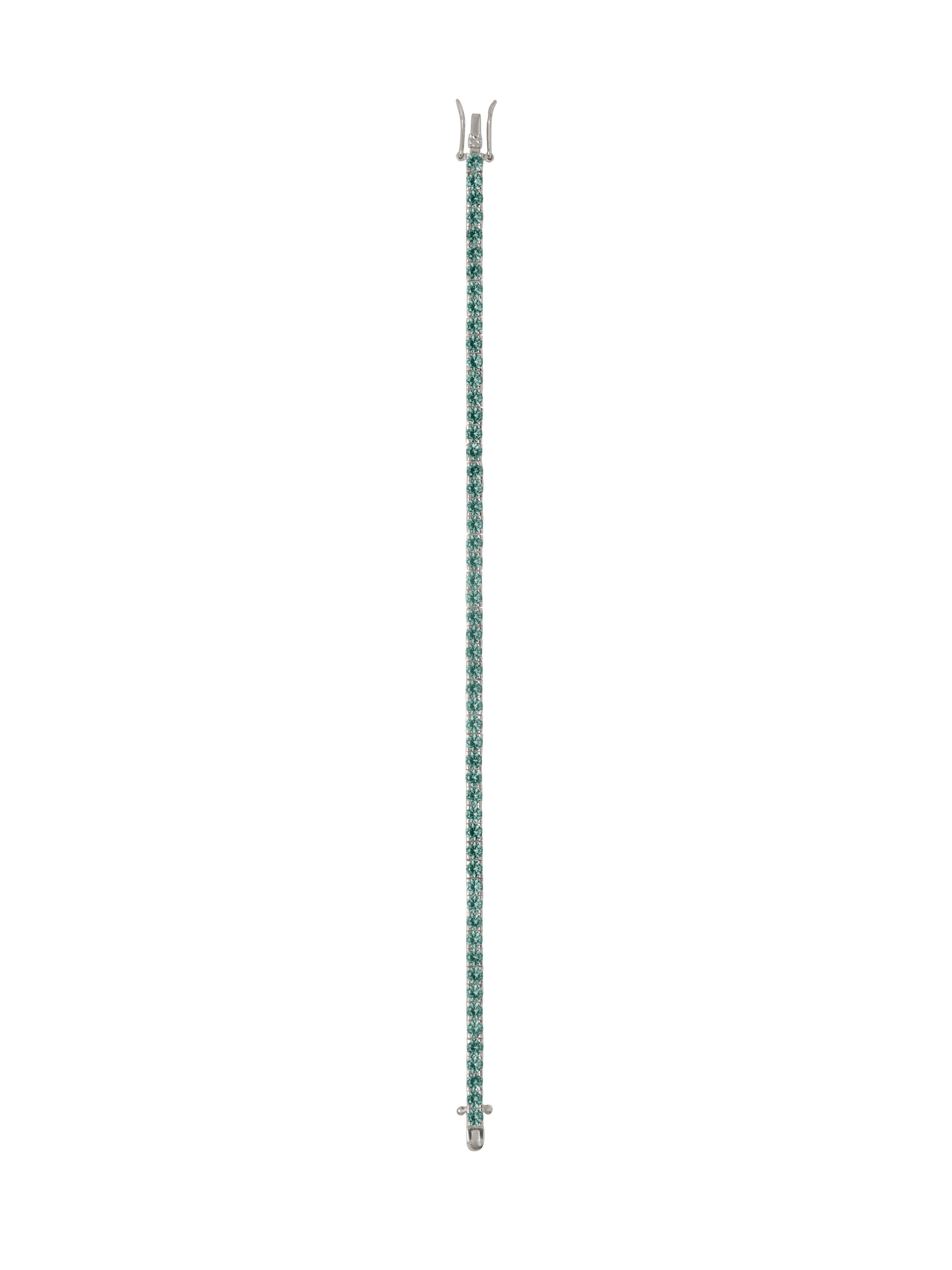 Our most-worn single-strand Rivière tennis bracelet, updated for the season in elegant color. Features 3MM lab-grown tourmaline gemstones in an earthy shade of moss green with soft blue undertones, in a classic four-prong setting of sterling silver. Crafted with fine-jewelry integrity, this piece is finished with double safety hooks for a secure clasp closure.