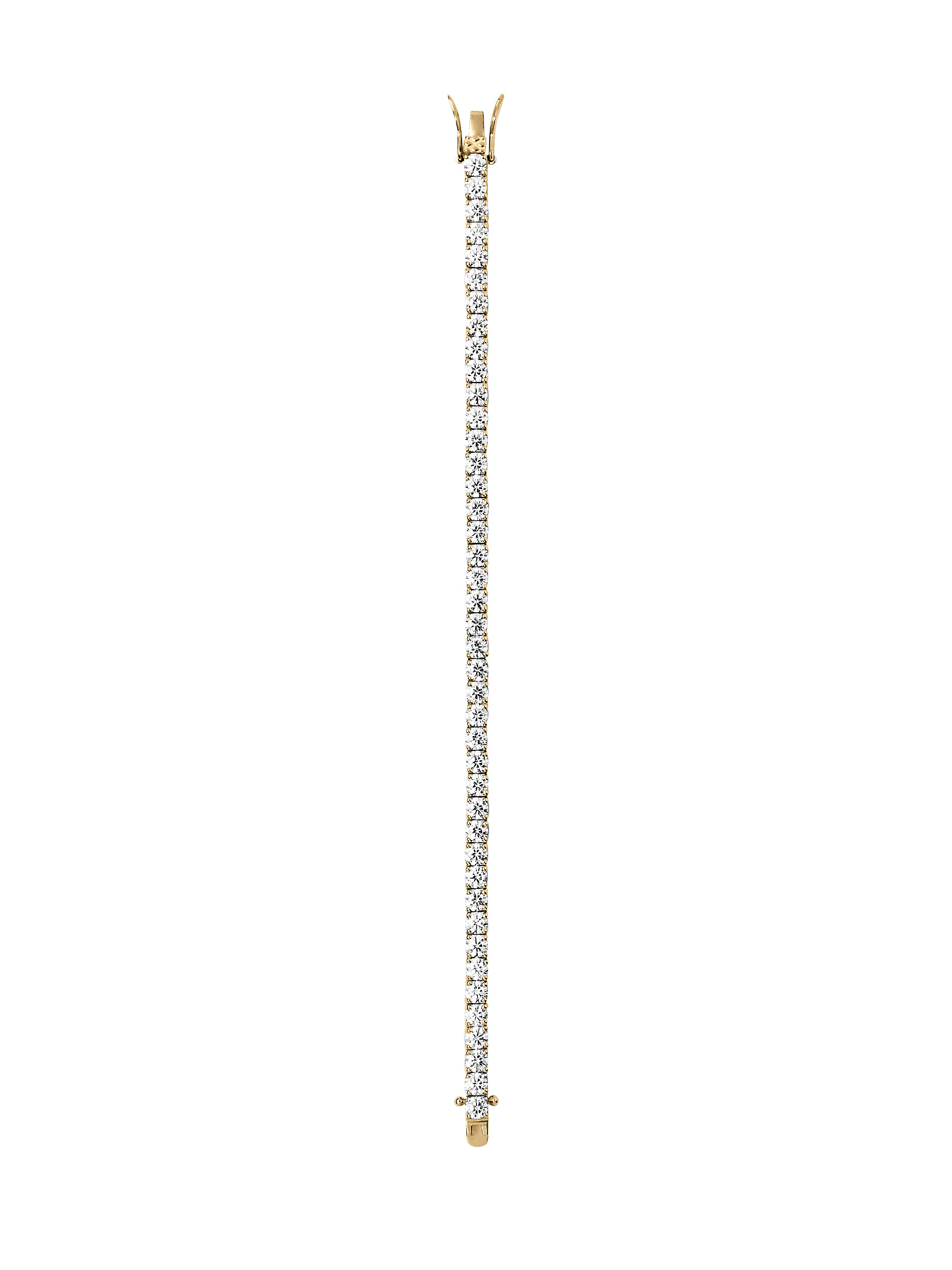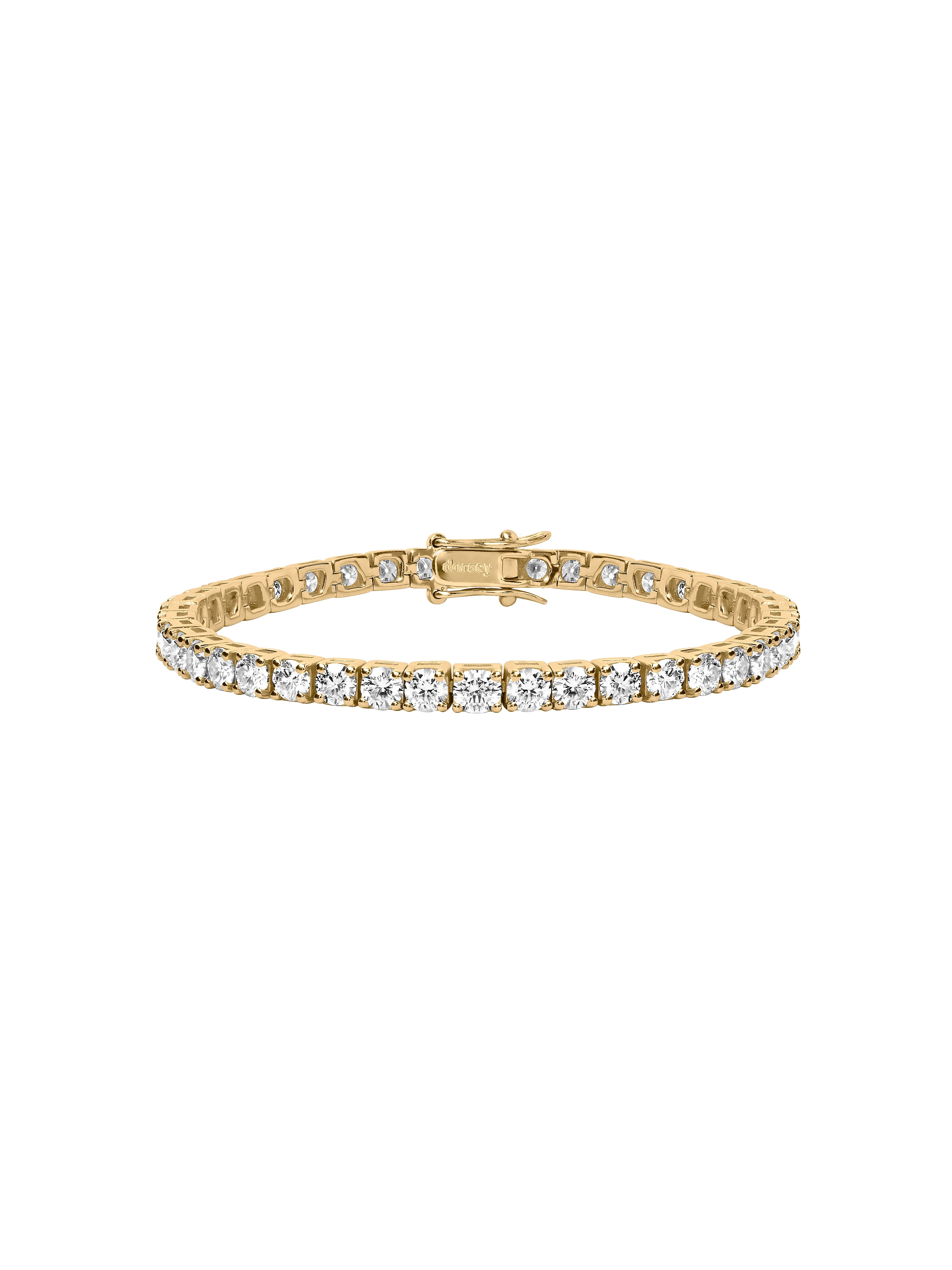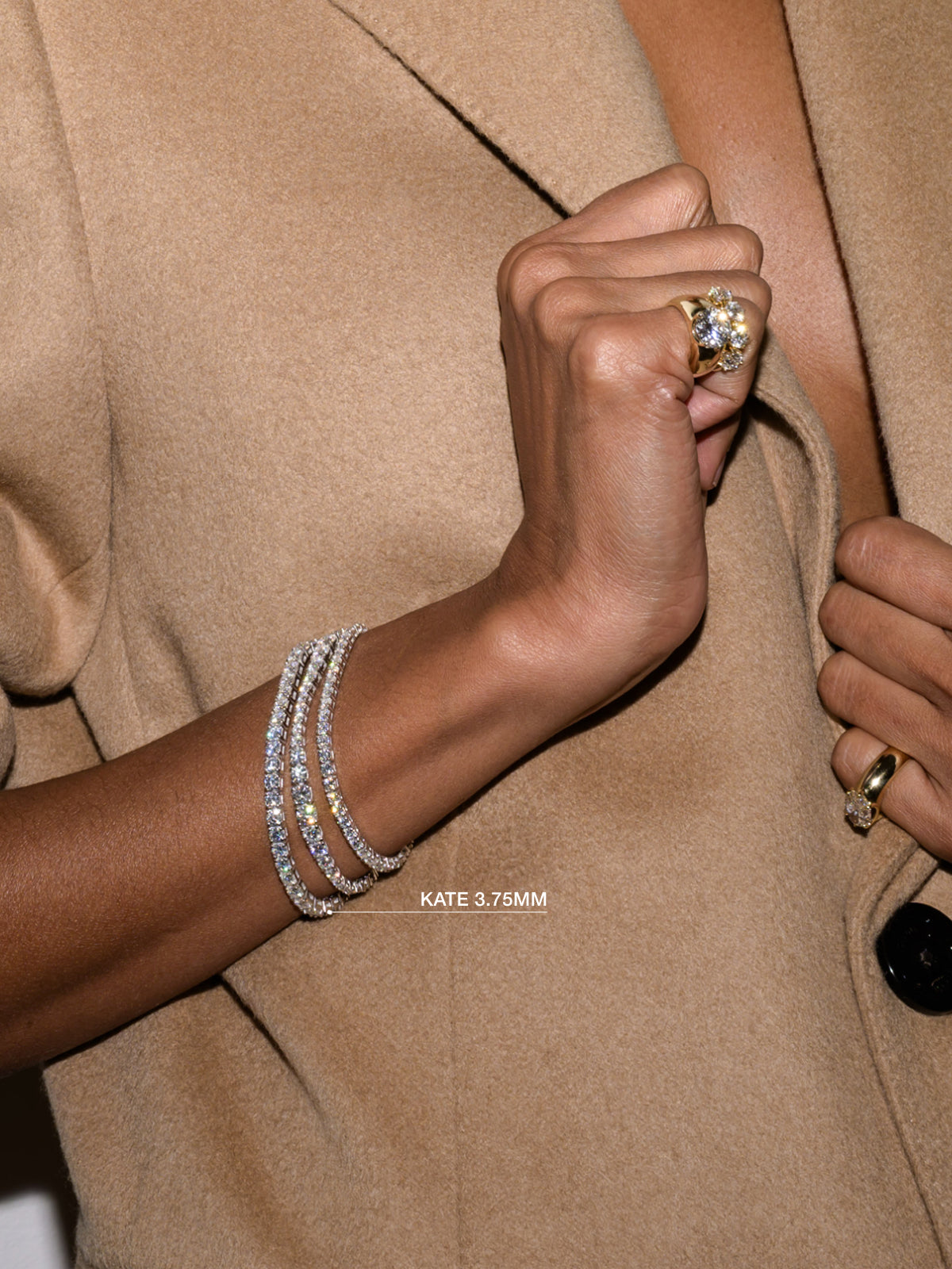 The Kate Rivière Bracelet features 3.75MM lab-grown white moissanite gemstones, each secured in a timeless four-prong setting and finished in 18k gold vermeil. Meticulously crafted with fine-jewelry integrity, this refined tennis bracelet is designed for everyday wear and secured with a box clasp and double safety hooks for added security.