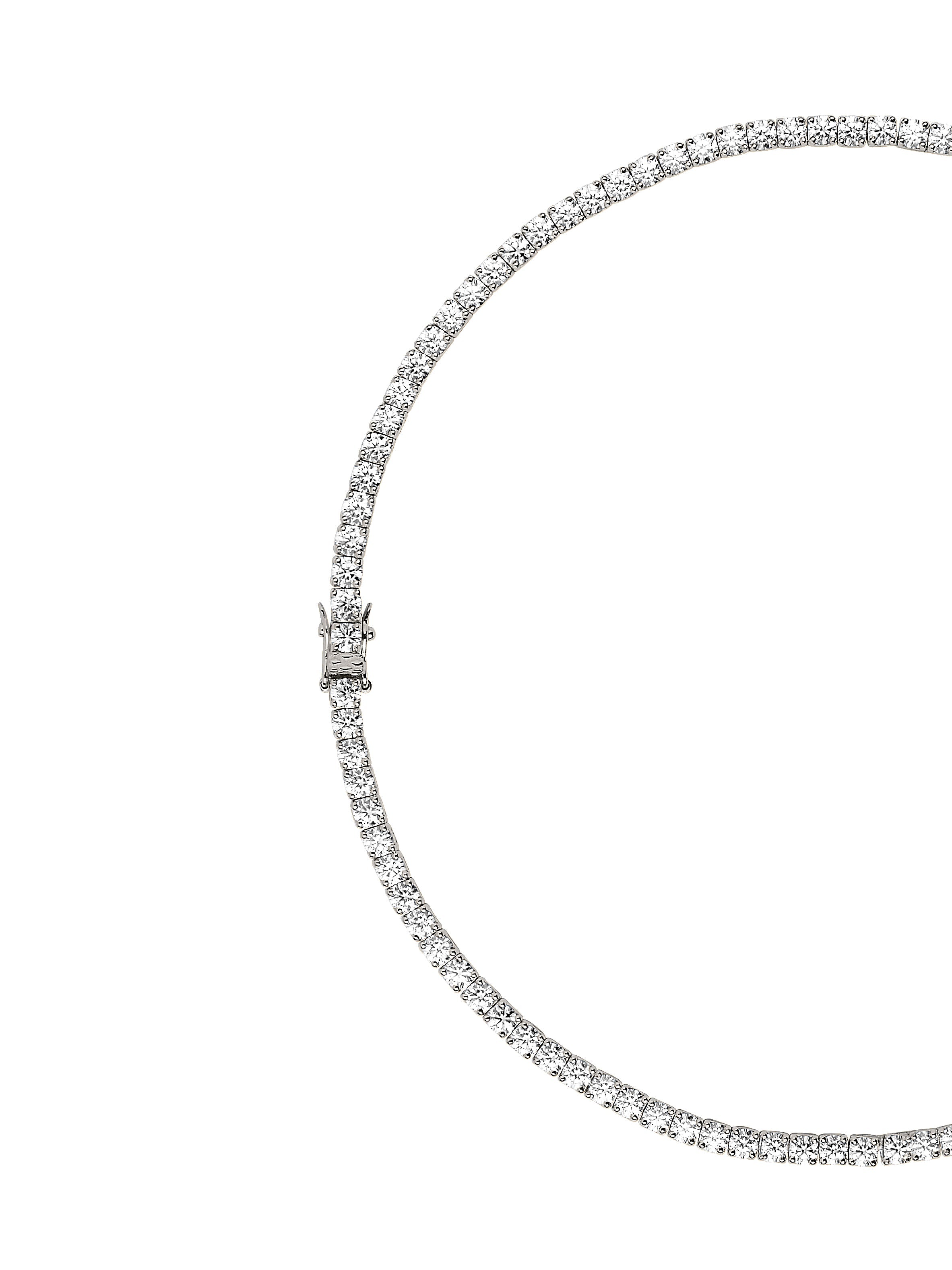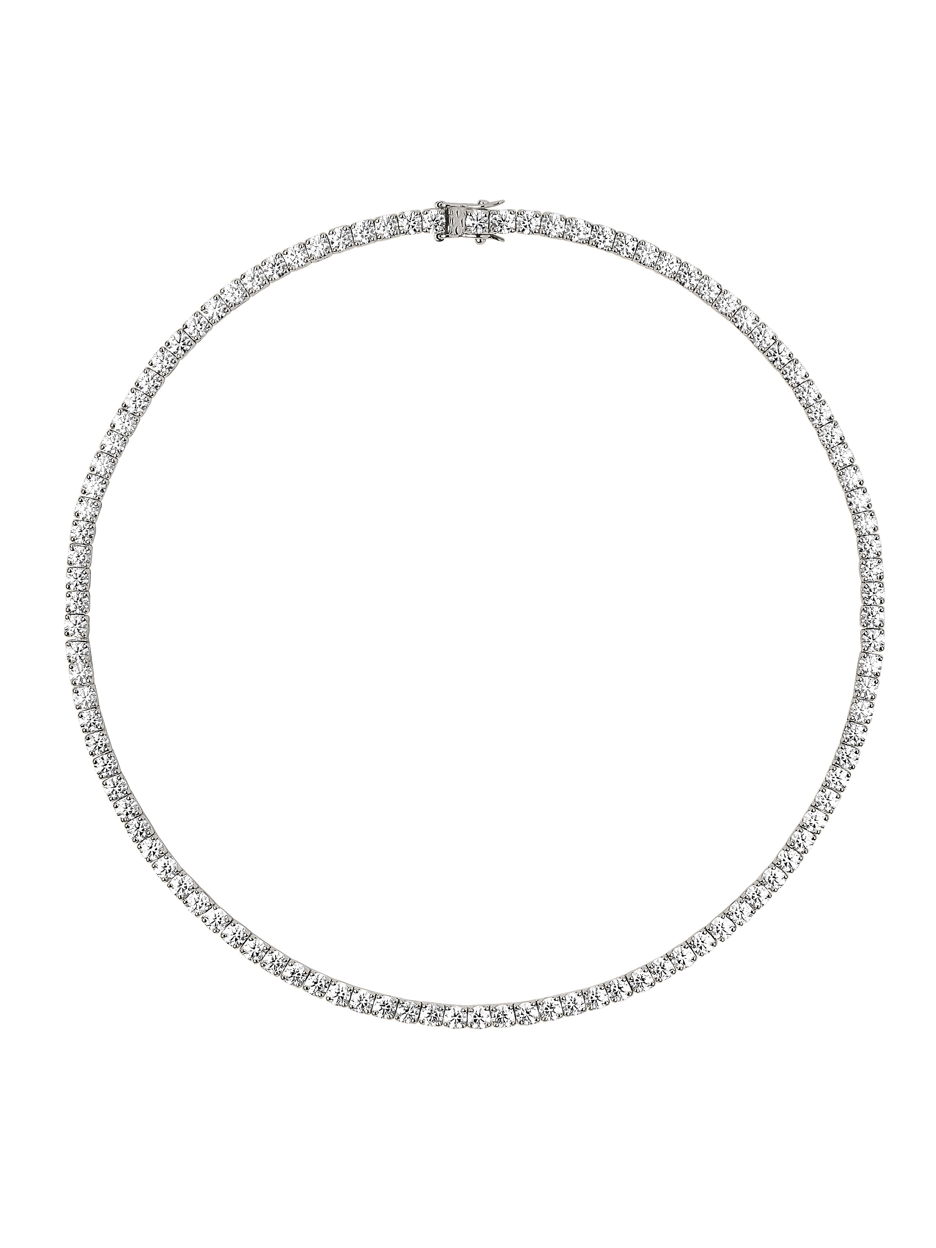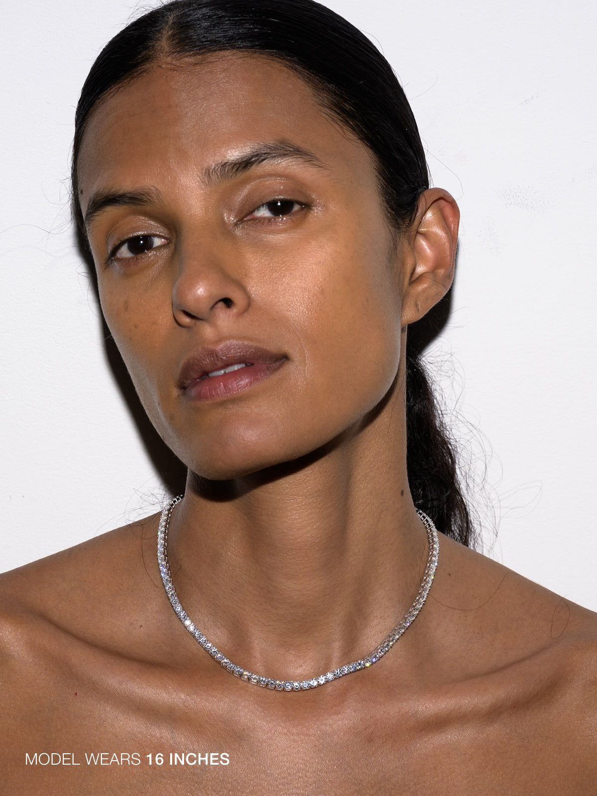 A Dorsey classic: The Kate Rivière Necklace features 3.75MM lab-grown white moissanite gemstones, each secured in a timeless four-prong setting and finished in sterling silver. Meticulously crafted with fine-jewelry integrity, this enduring tennis necklace is designed for everyday wear and secured with a box clasp and double safety hooks for added security.