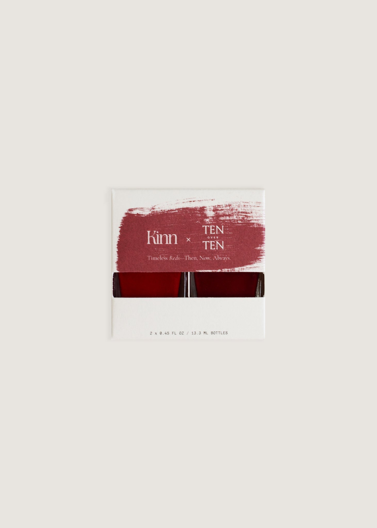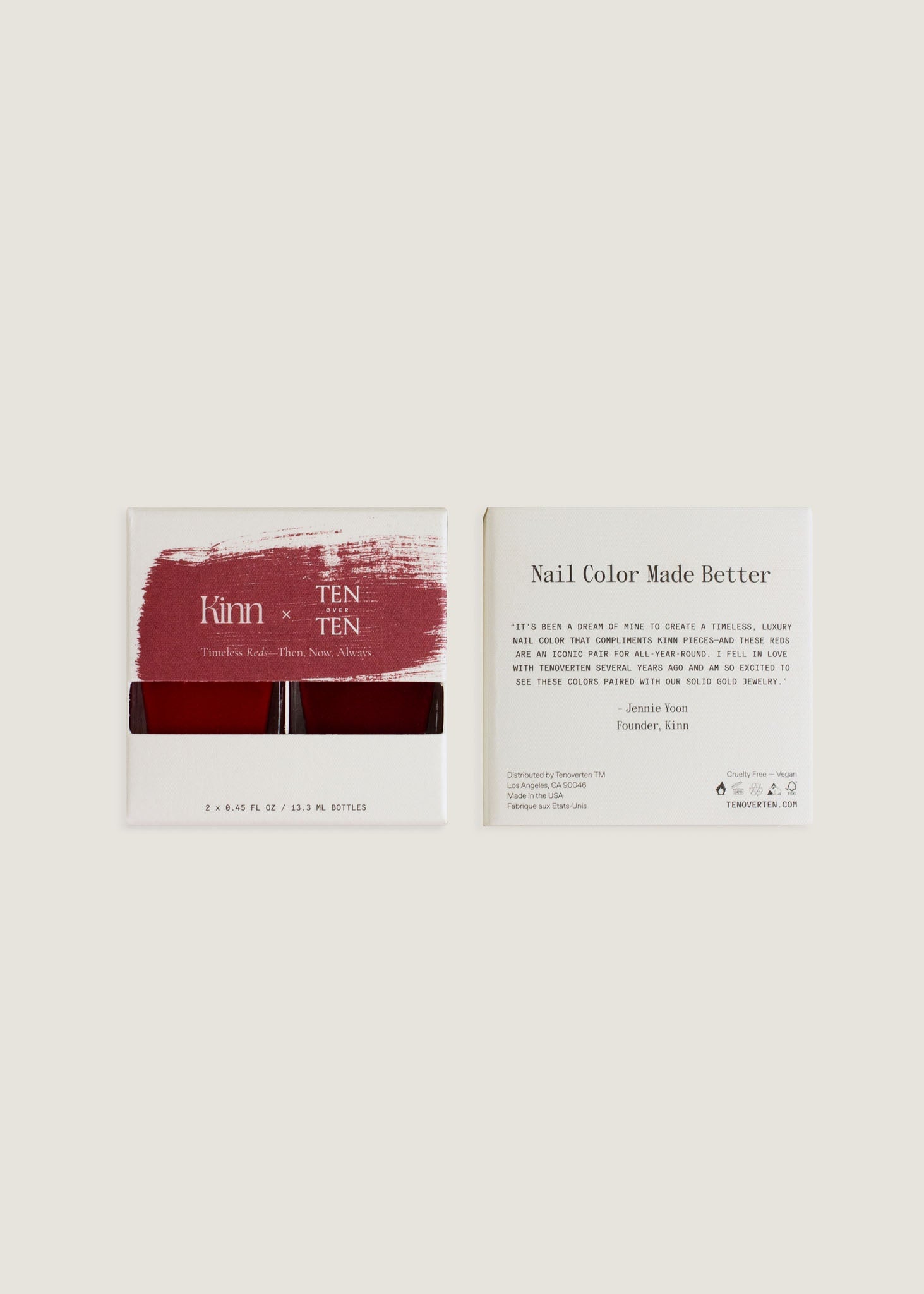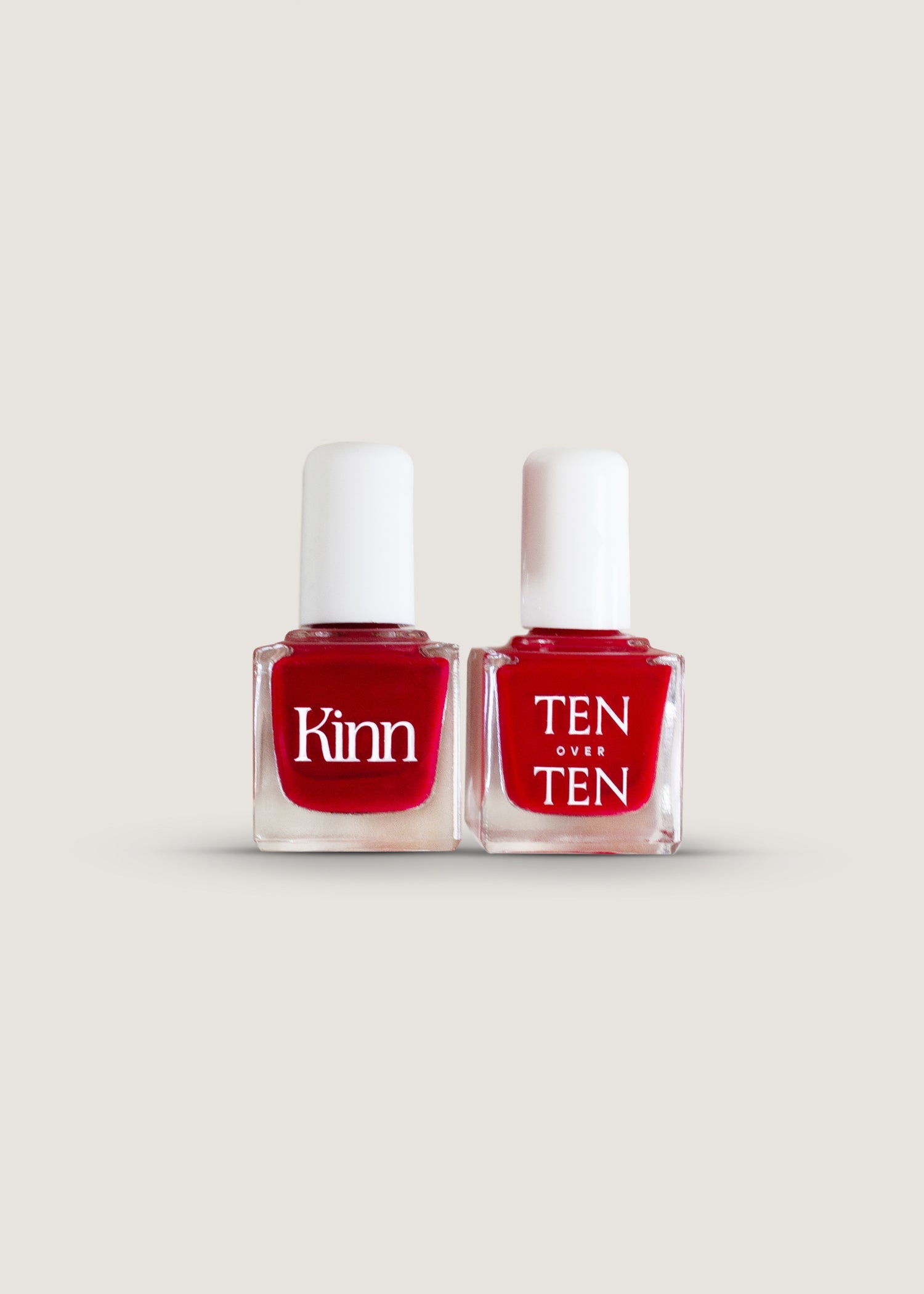 The Kinn x Tenoverten Duo is inspired by the Los Angeles based fine jeweler’s mission to create timeless modern heirlooms. It features two exclusive red nail polishes that embody empowerment and are designed to be worn year-round. The only reds you ever need to own—each pairs perfectly with 14k solid gold jewelry.