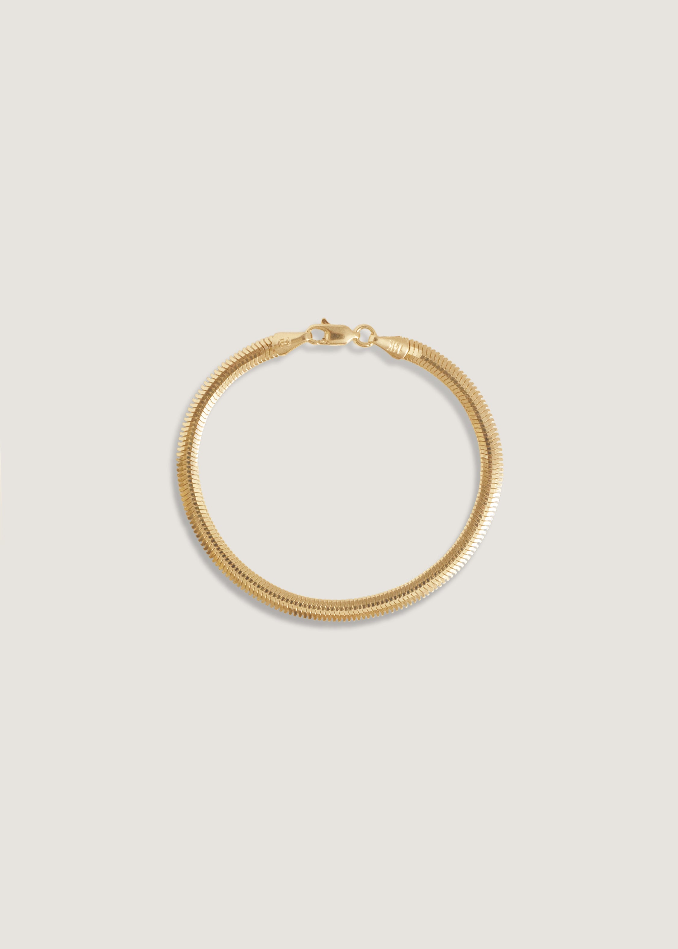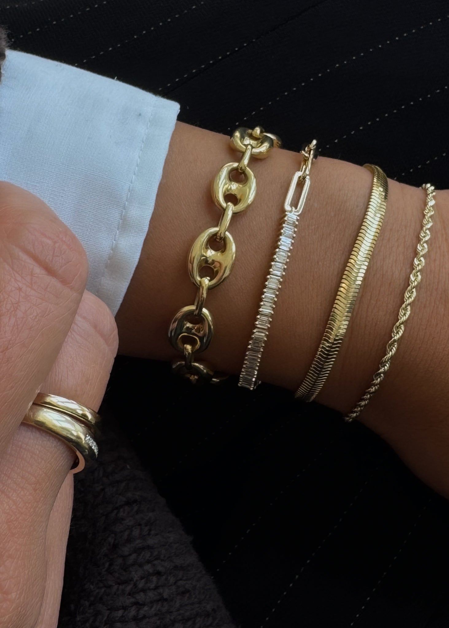 Introducing the Kismet Herringbone Chain. "Kismet," an Arabic word meaning "destiny" or "fate," embodies this herringbone chain's liquid gold pattern. Elevate any bracelet stack with Kismet.