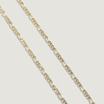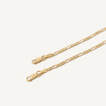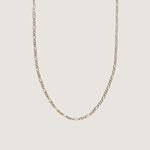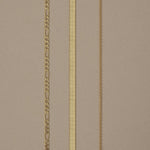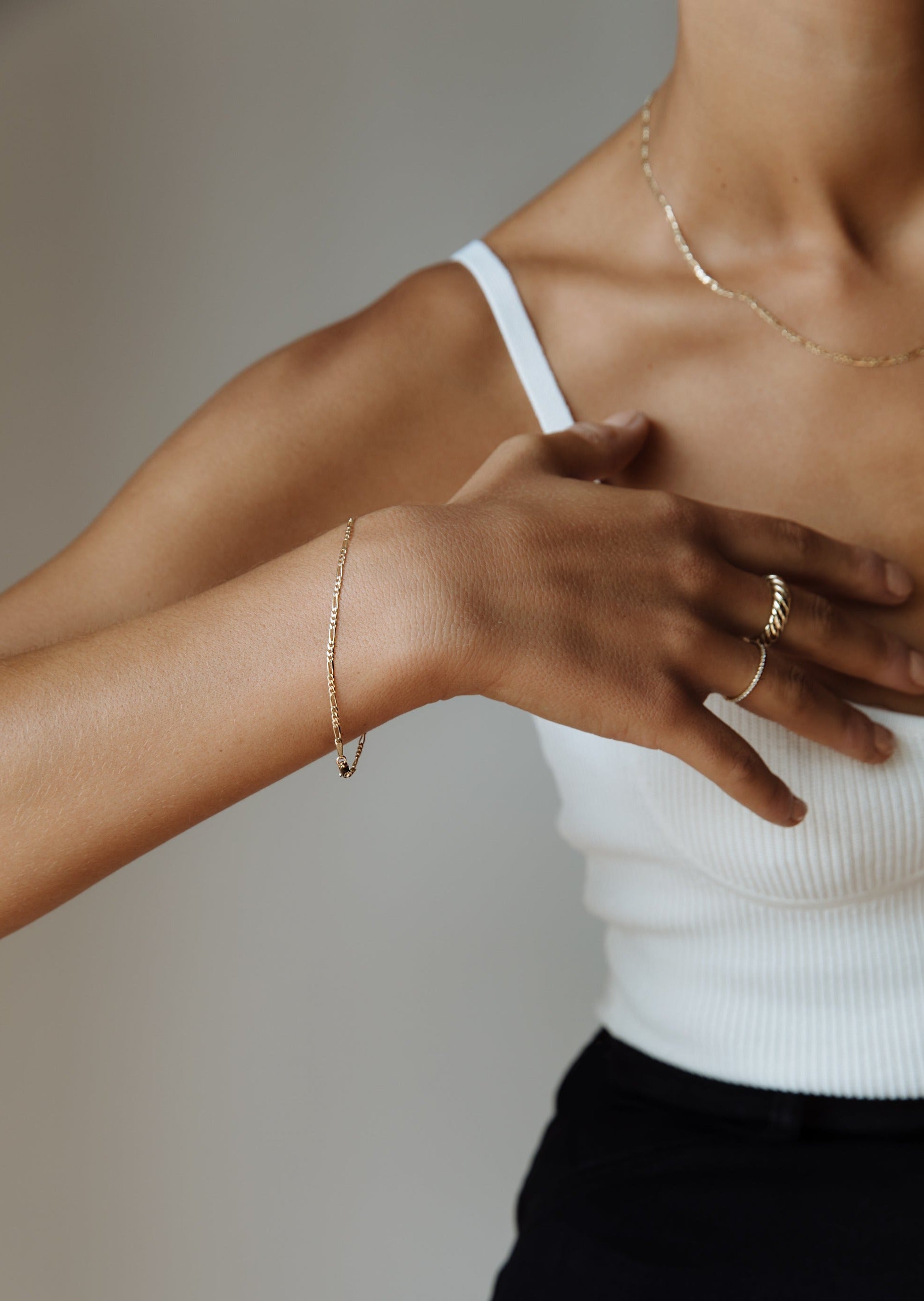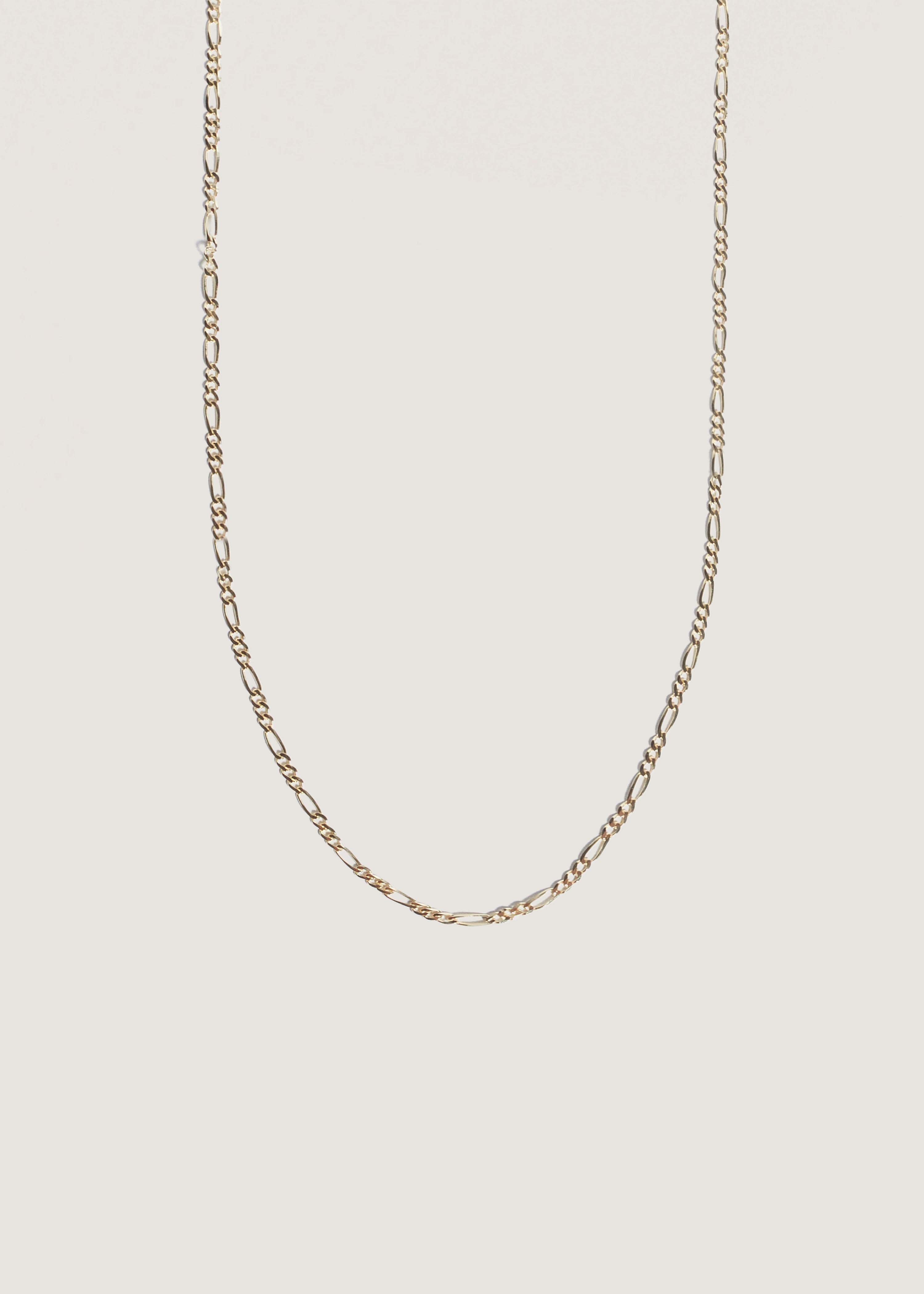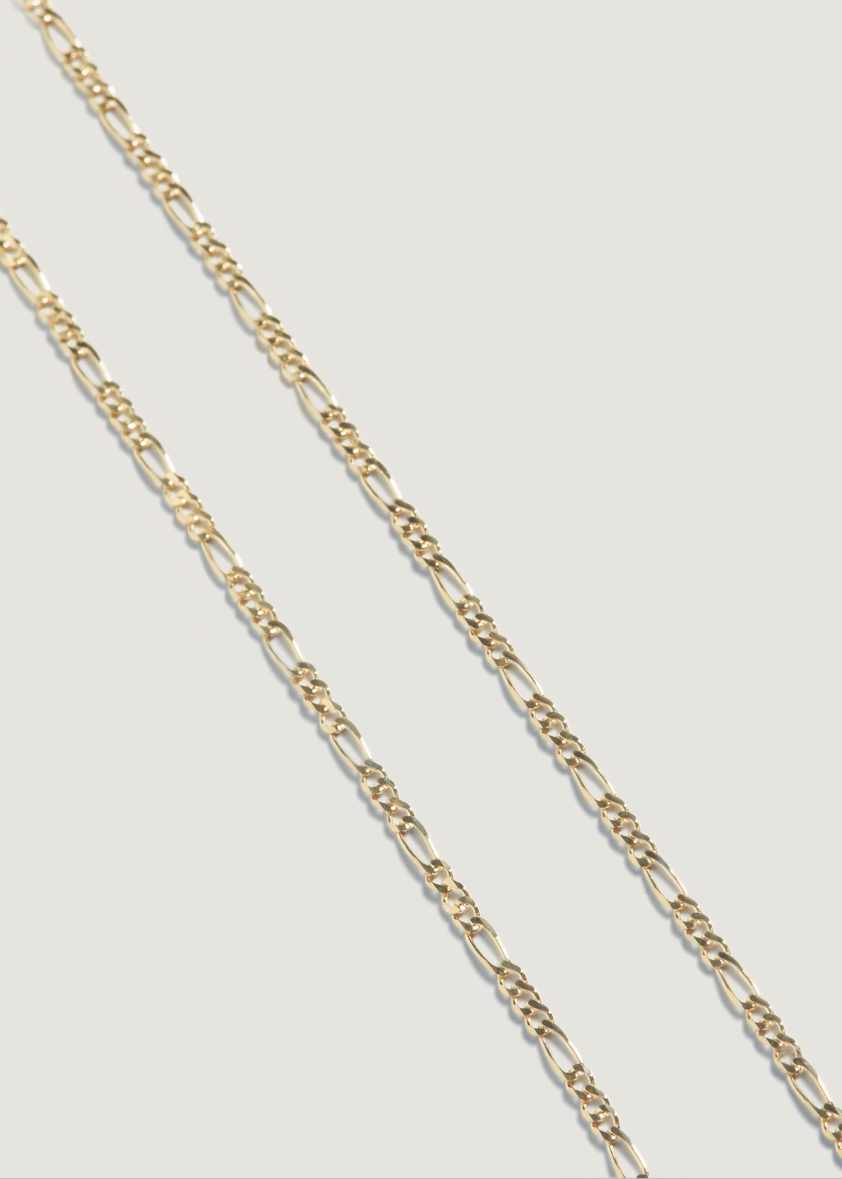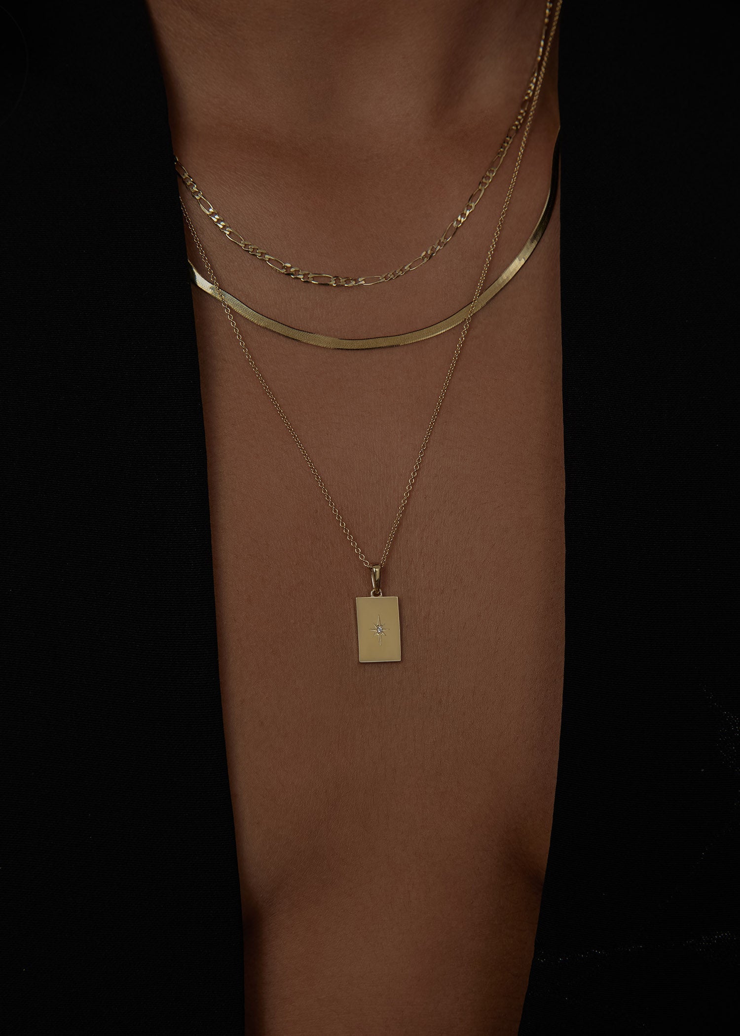 Model is wearing the Kyle Figaro Chain necklace layered with a Maison Oval Locket I on a 22" Box Chain.