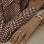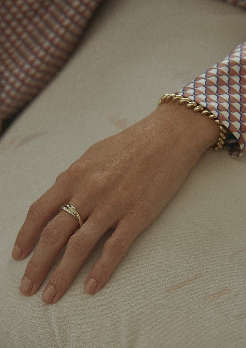 Celebrate a modern milestone. This ring features two interlocking bands, with six 0.012ctw diamonds burnish set in 14k solid gold.