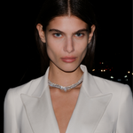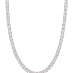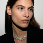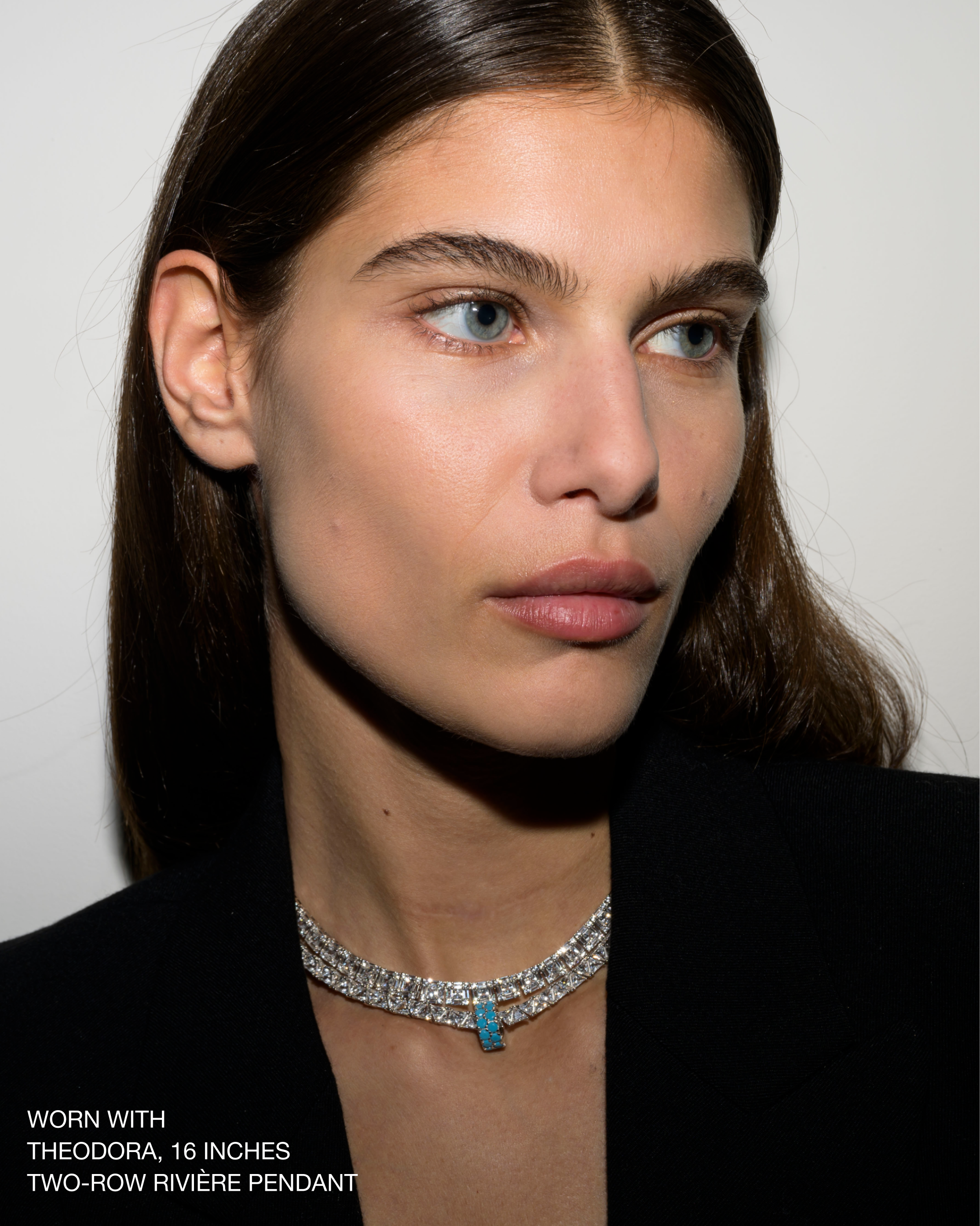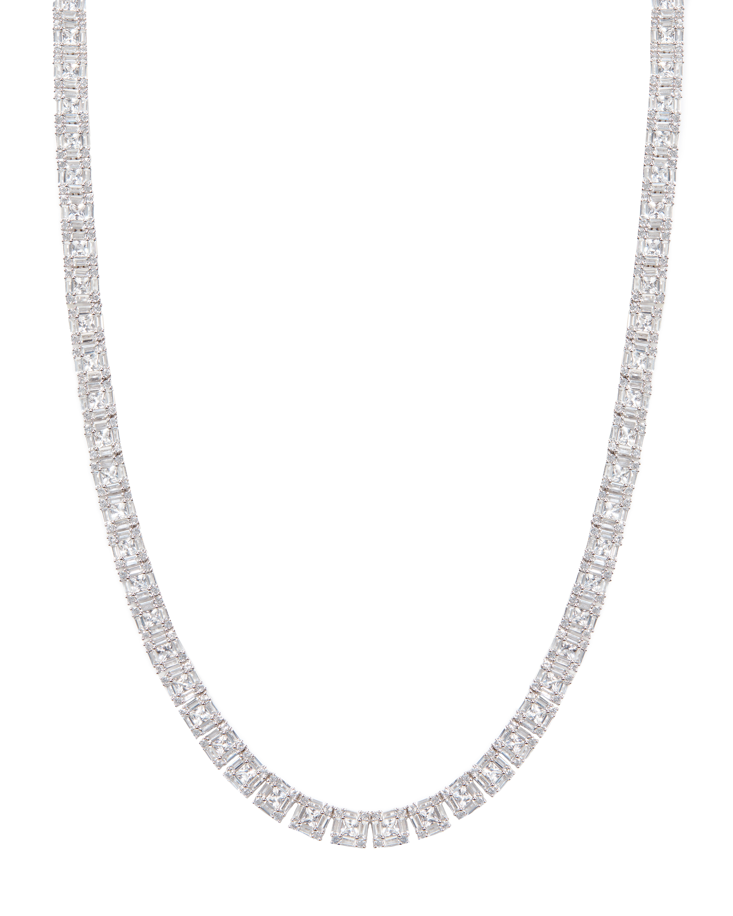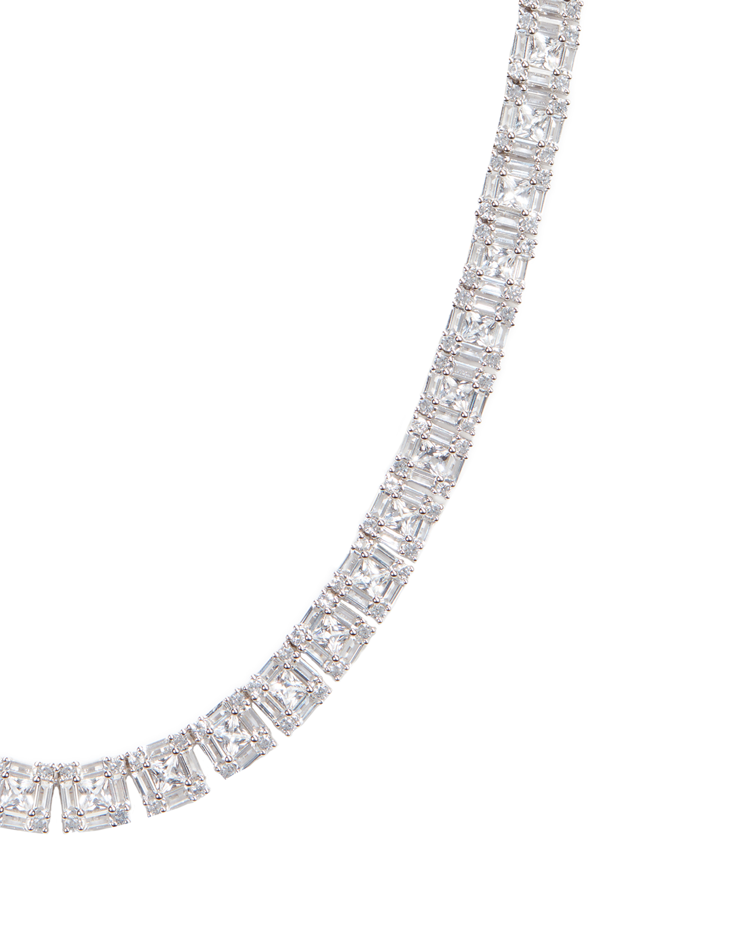 The Lilia Collar Rivière Necklace is meticulously crafted in sterling silver and features square-cut lab-grown white sapphires encircled by baguette and round sapphires, totaling 30.5 carats DEW. Available in both 15 and 16 inches.