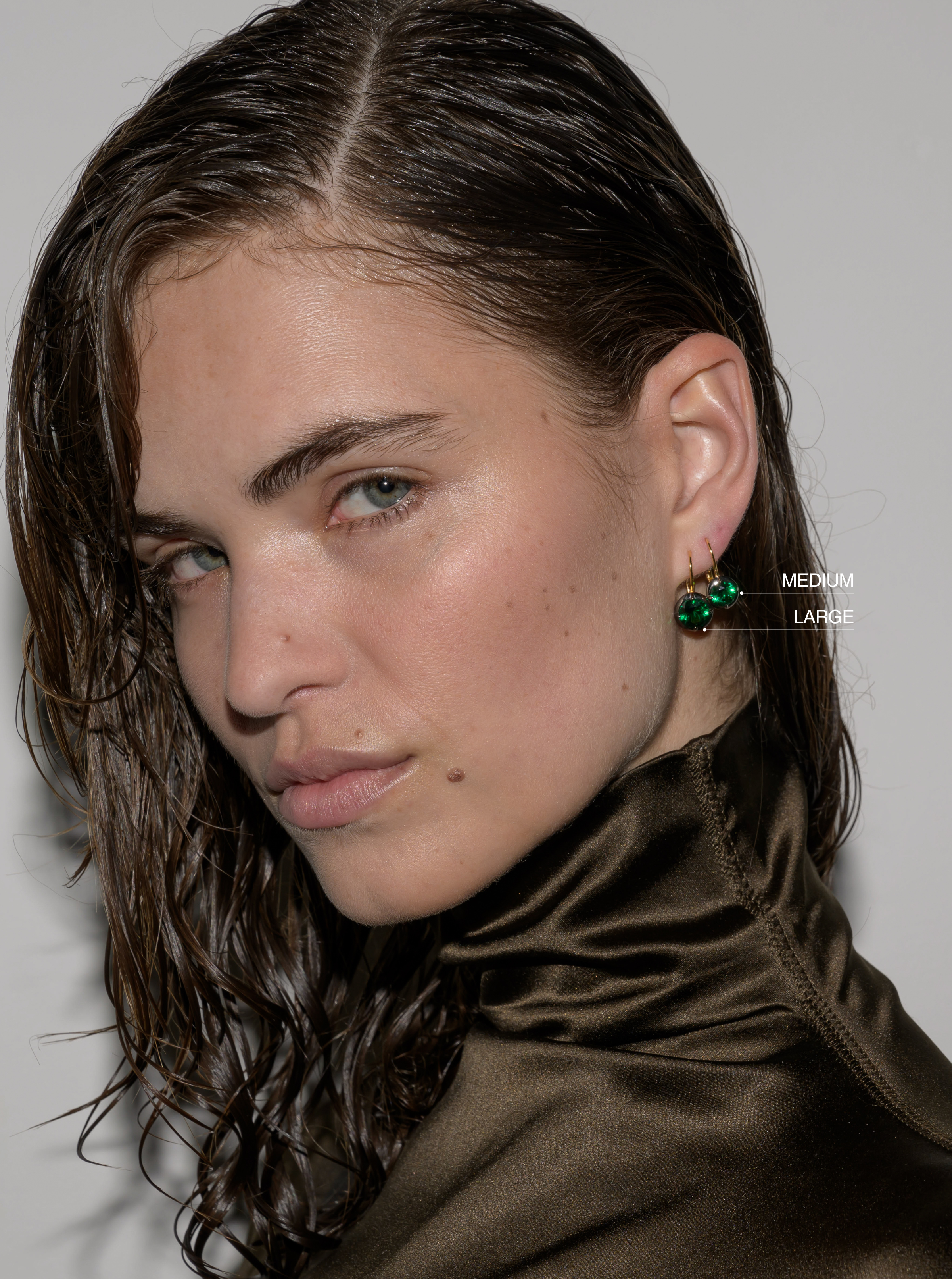 Model wears 3 carat Lucien in the primary earring hole and 2 carat Lucien in the second earring hole.