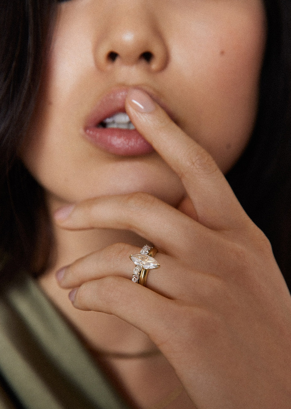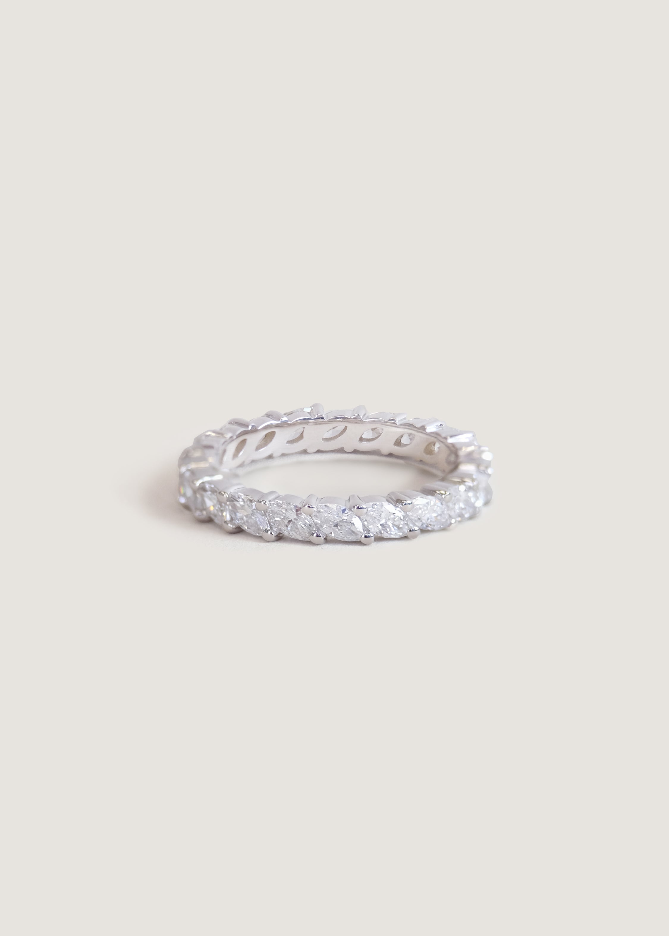 Our take on an elegant classic—the Marquise Eternity Ring shines bright and bold, featuring diagonally set marquise cut diamonds.