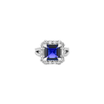 Crafted in sterling silver or 14k white gold, the Mercer Ring features a 9 carat radiant cut lab-grown blue sapphire center, surrounded by baguette and round cut lab-grown white sapphires or diamonds finished with a pavé band.