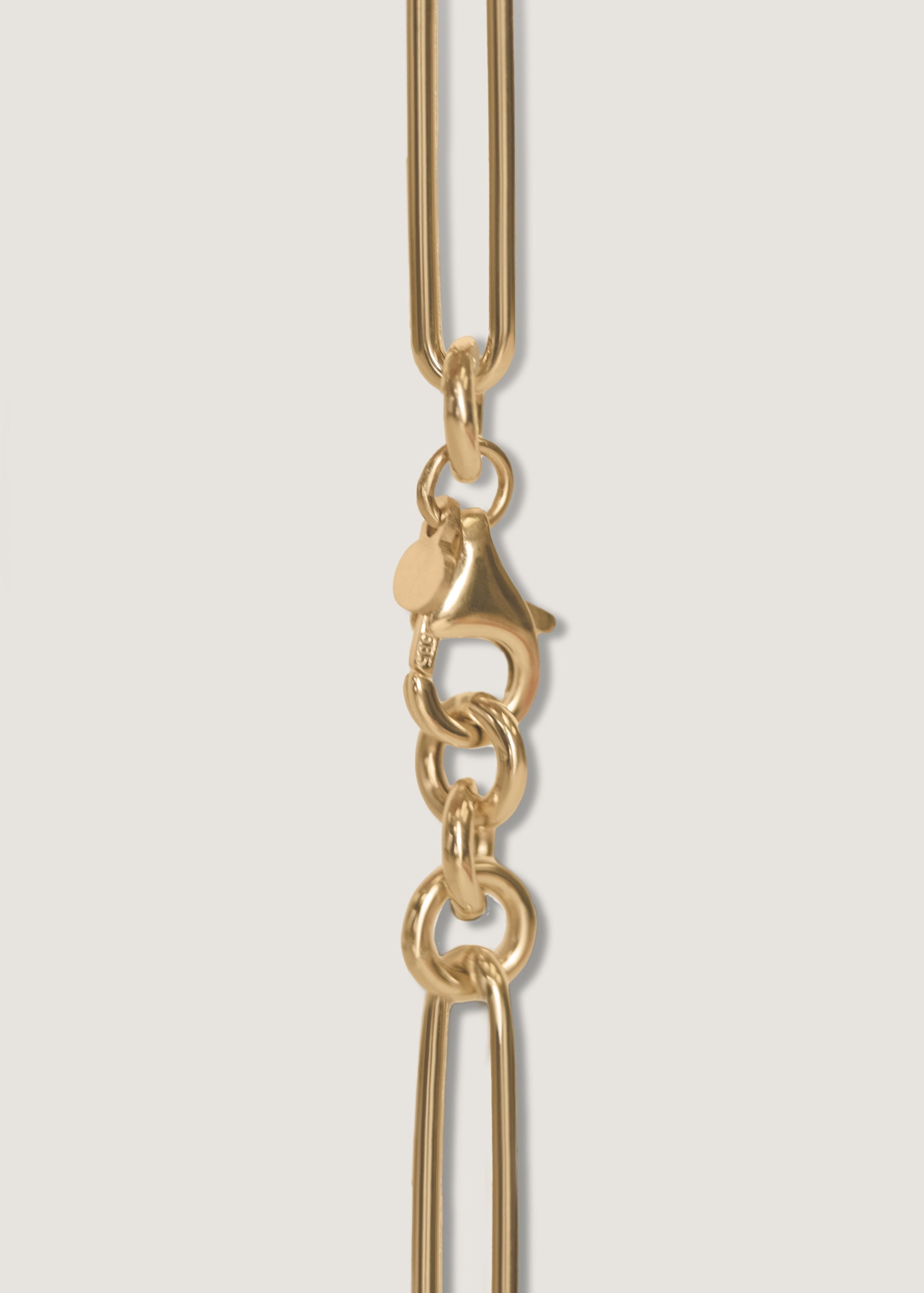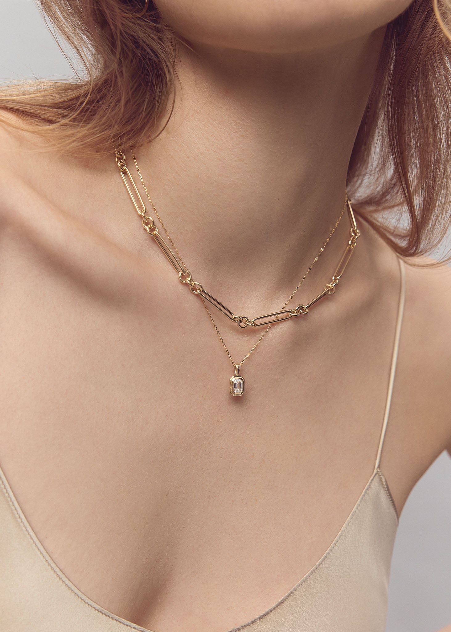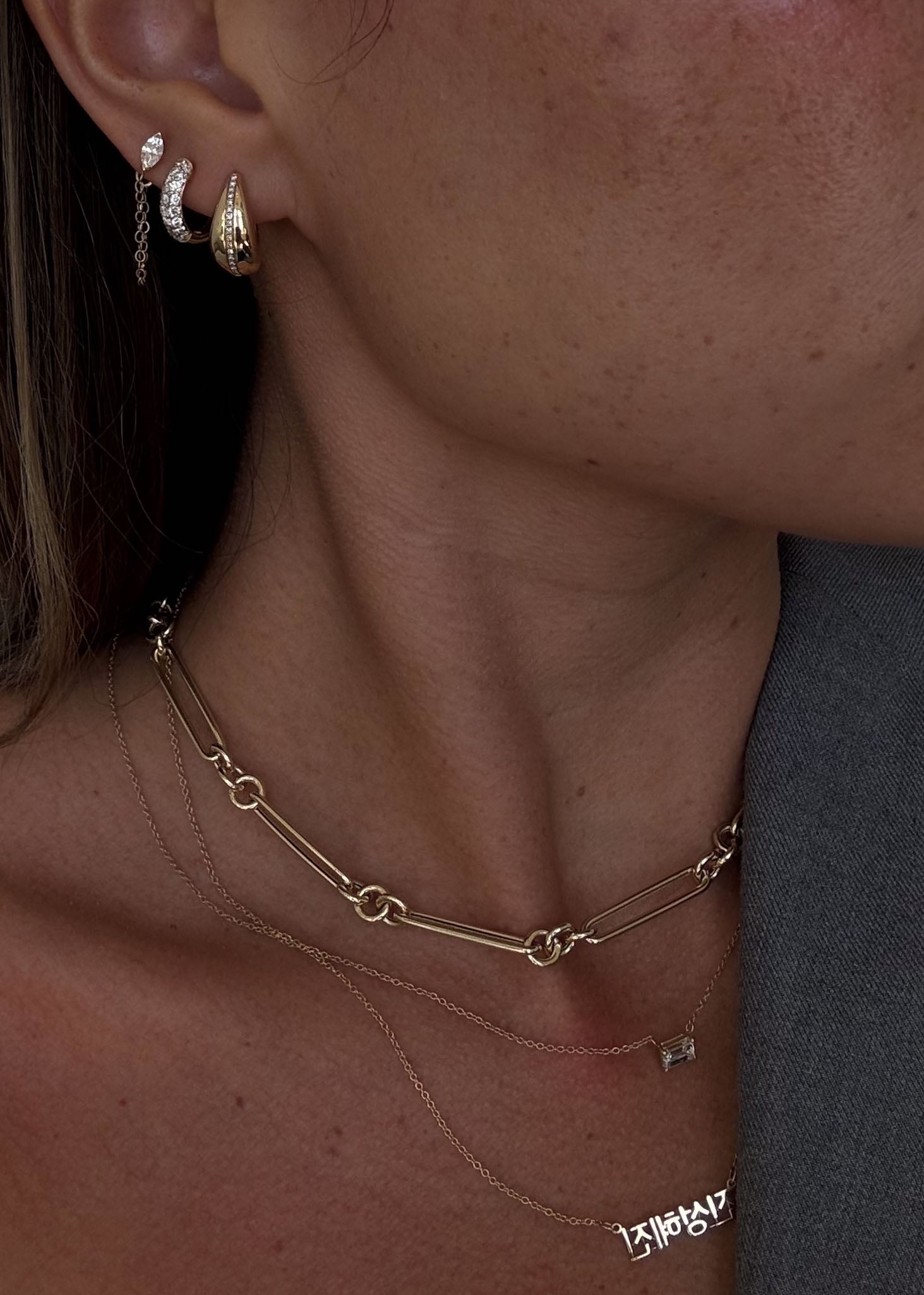 This necklace blends classic rolo links with modern paperclip links, resulting in a distinct and eye-catching silhouette. It serves as an ideal canvas for showcasing your favorite charm pendants. Lightweight and versatile—style with a tennis necklace for a luxury stack.