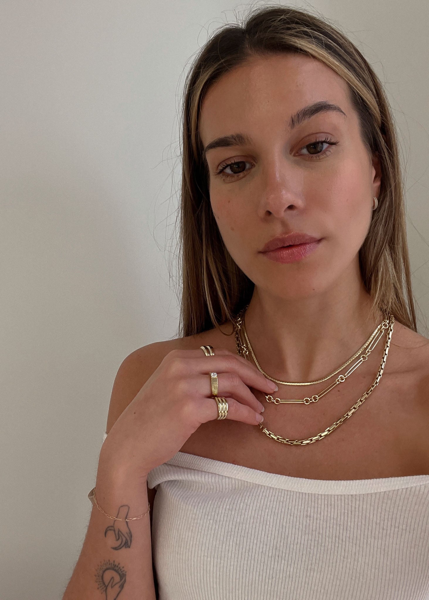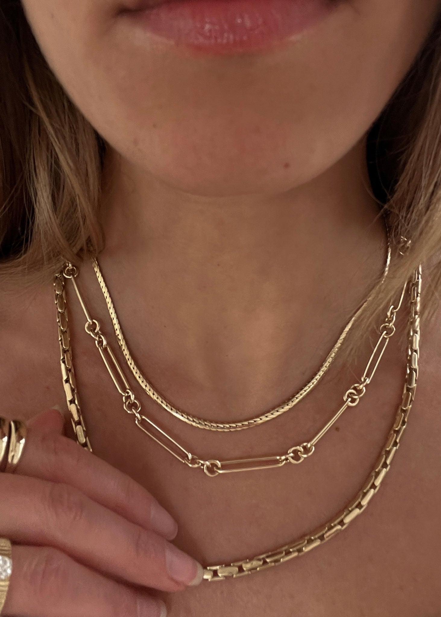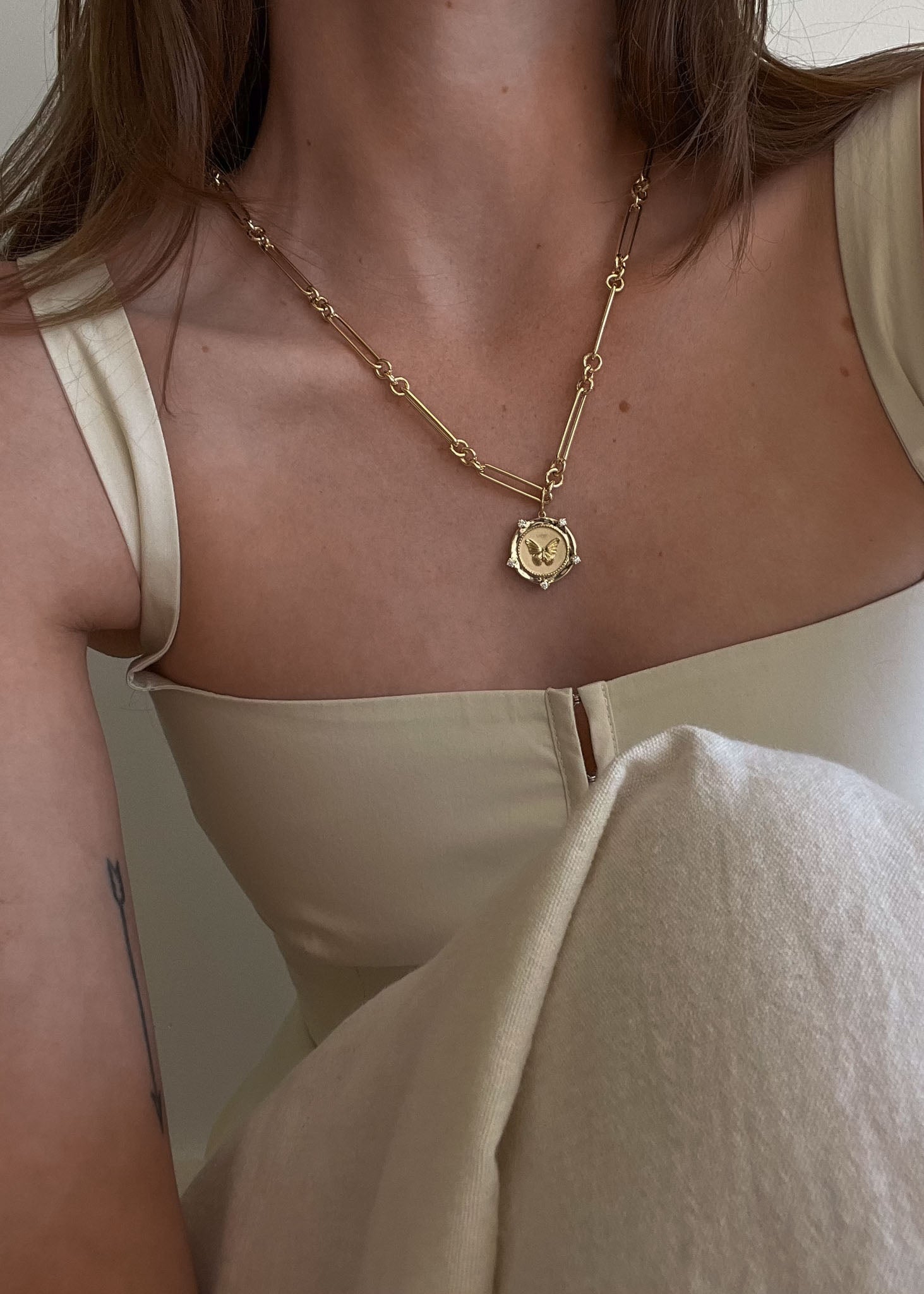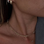 This necklace blends classic rolo links with modern paperclip links, resulting in a distinct and eye-catching silhouette. It serves as an ideal canvas for showcasing your favorite charm pendants. Lightweight and versatile—style with a tennis necklace for a luxury stack.