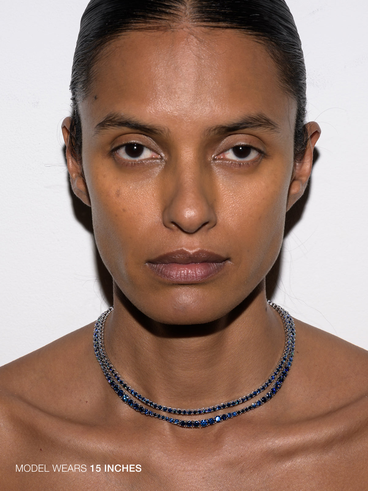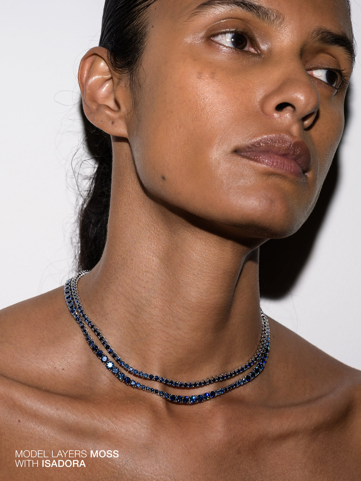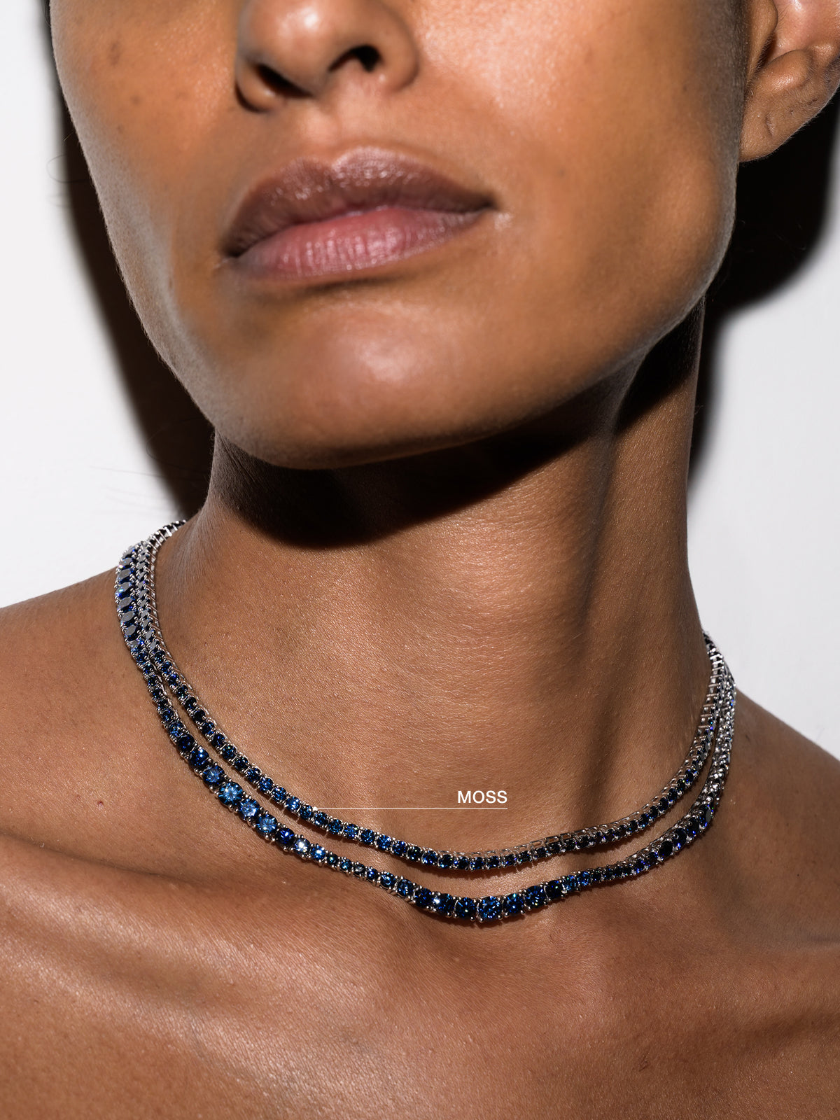 A Dorsey classic: The Moss Rivière Necklace features 3MM lab-grown slate blue moissanite gemstones, each secured in a timeless four-prong setting and finished in sterling silver. Meticulously crafted with fine-jewelry integrity, this enduring tennis necklace is designed for everyday wear and secured with a box clasp and double safety hooks for added security.