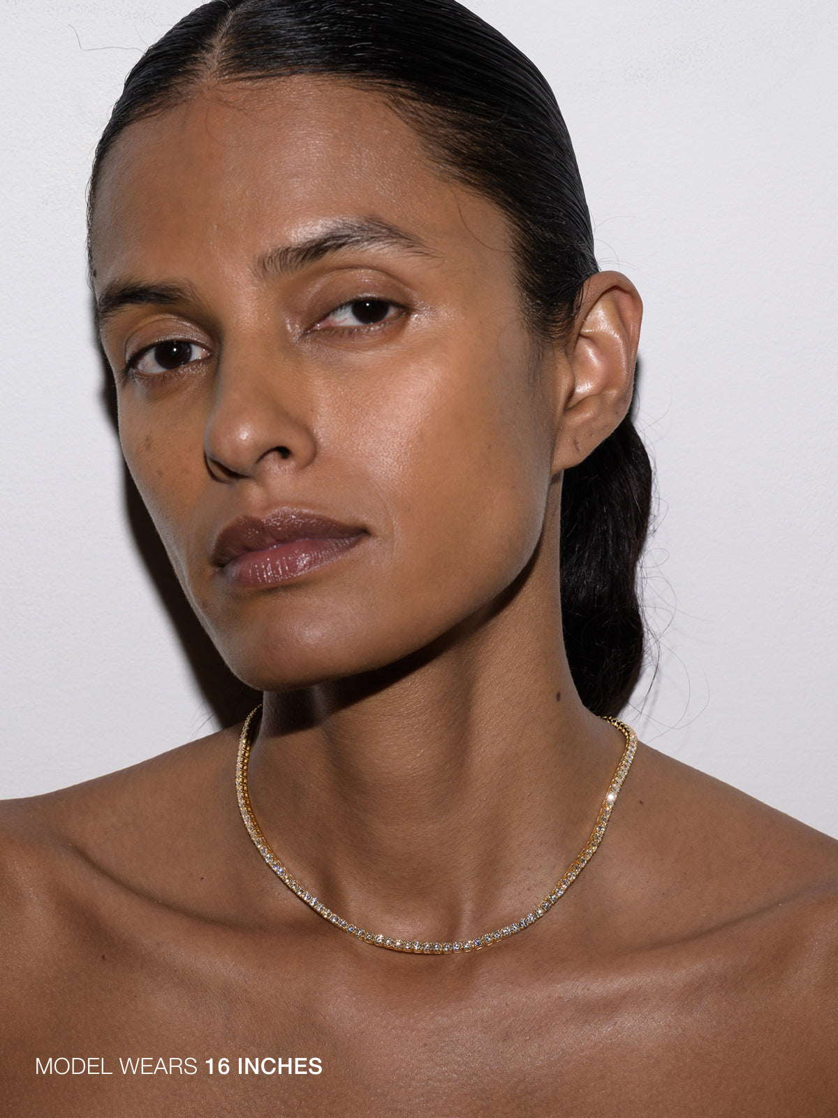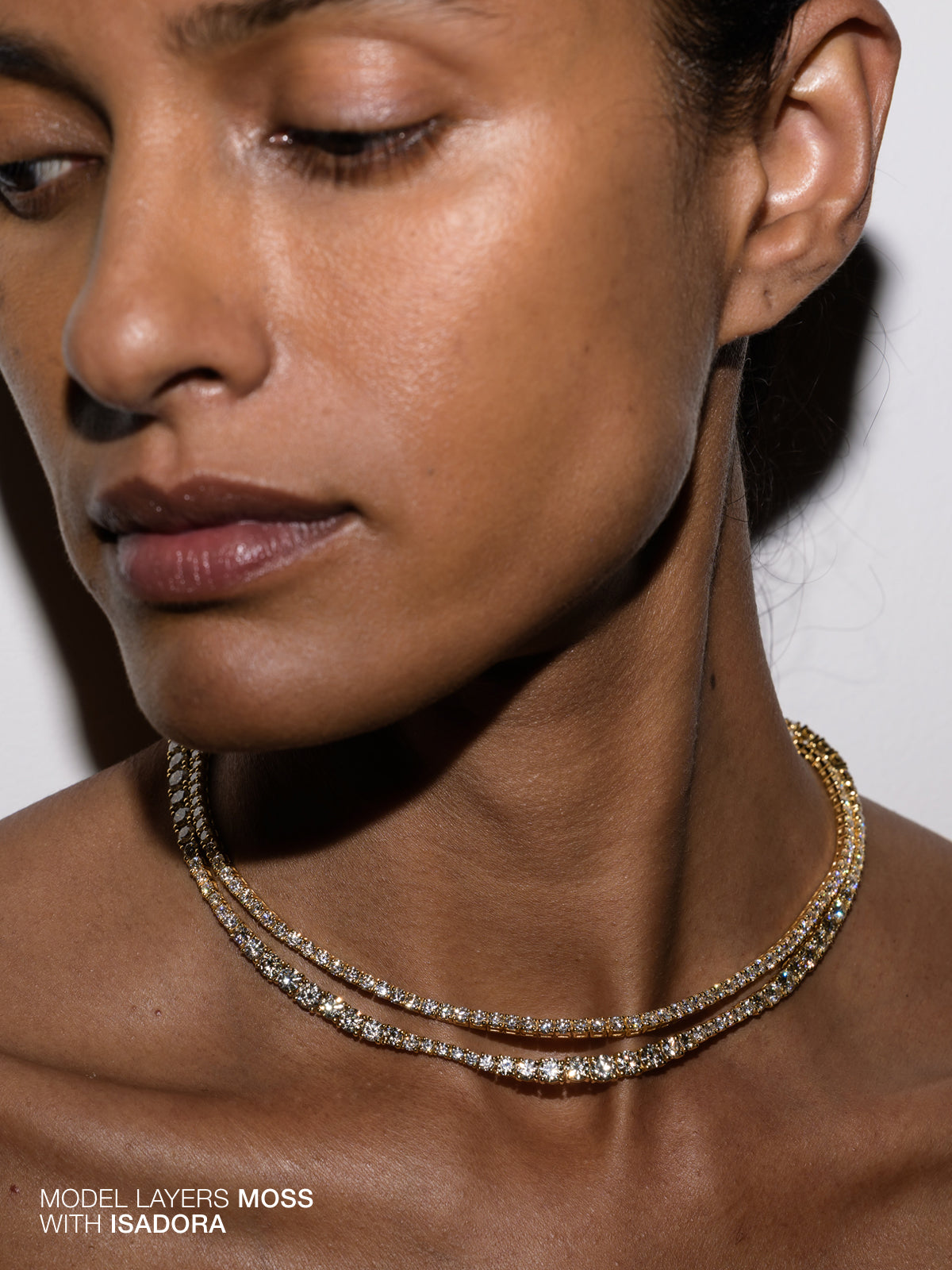 A Dorsey classic: The Moss Rivière Necklace features 3MM lab-grown honey moissanite gemstones, each secured in a timeless four-prong setting and finished in 18k gold vermeil. Meticulously crafted with fine-jewelry integrity, this enduring tennis necklace is designed for everyday wear and secured with a box clasp and double safety hooks for added security.