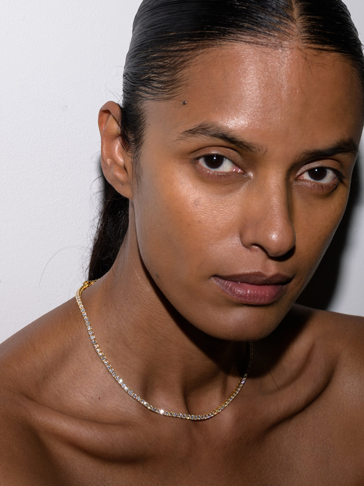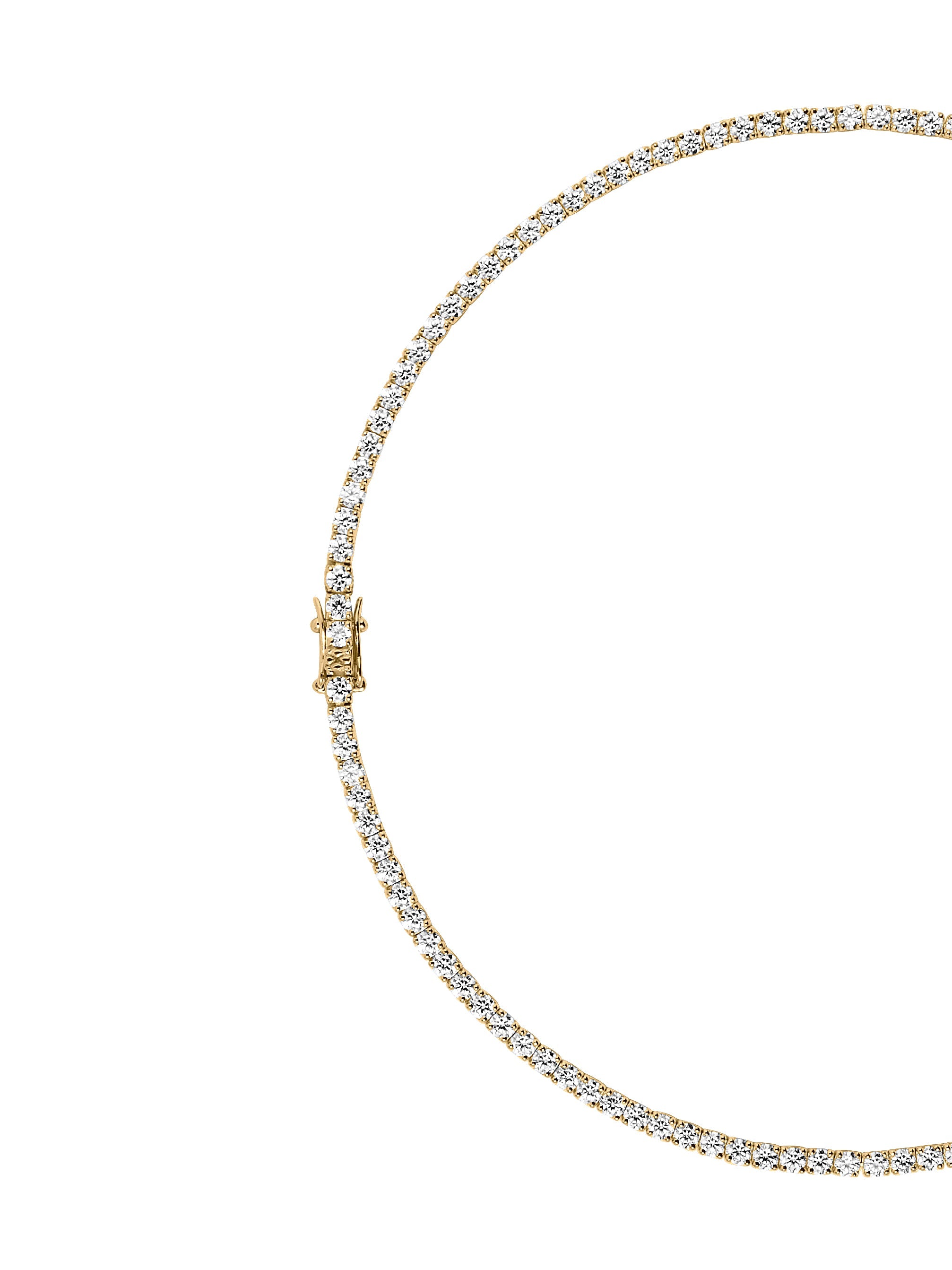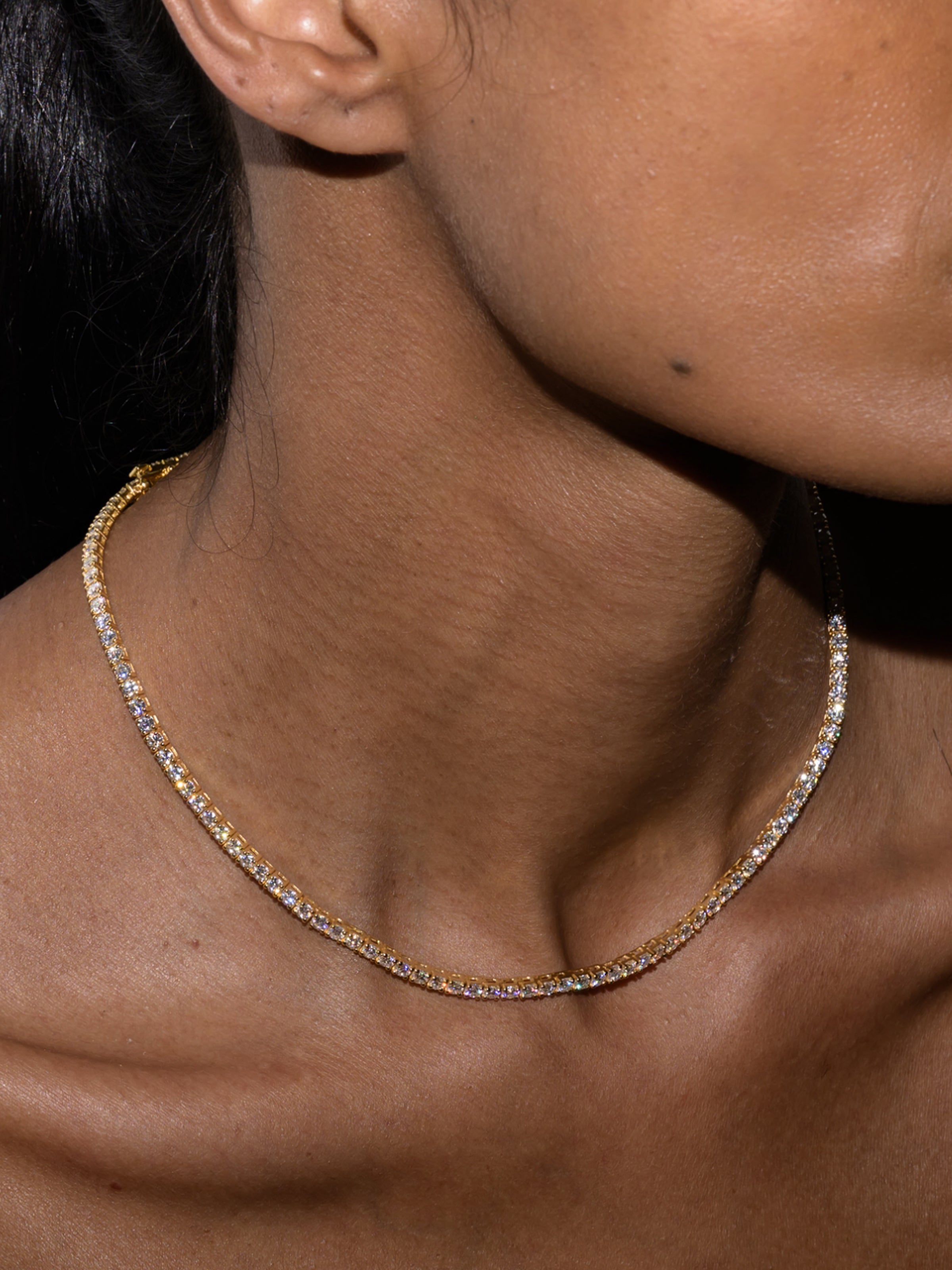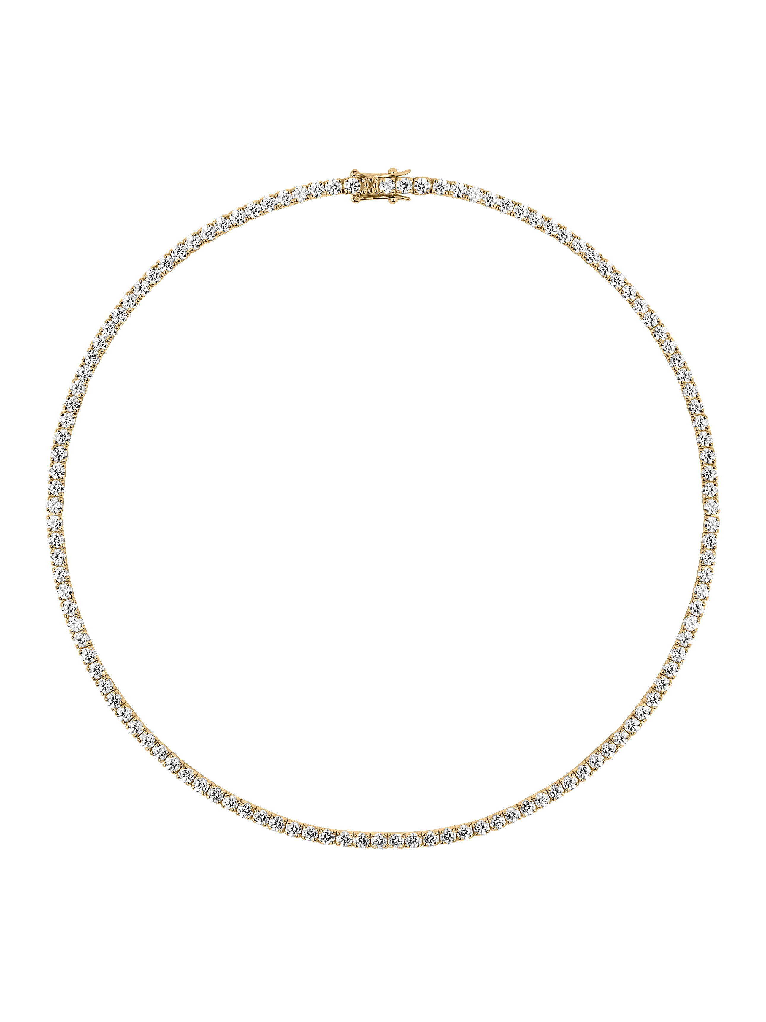 A Dorsey classic: The Moss Rivière Necklace features 3MM lab-grown white moissanite gemstones, each secured in a timeless four-prong setting and finished in 18k gold vermeil. Meticulously crafted with fine-jewelry integrity, this enduring tennis necklace is designed for everyday wear and secured with a box clasp and double safety hooks for added security.