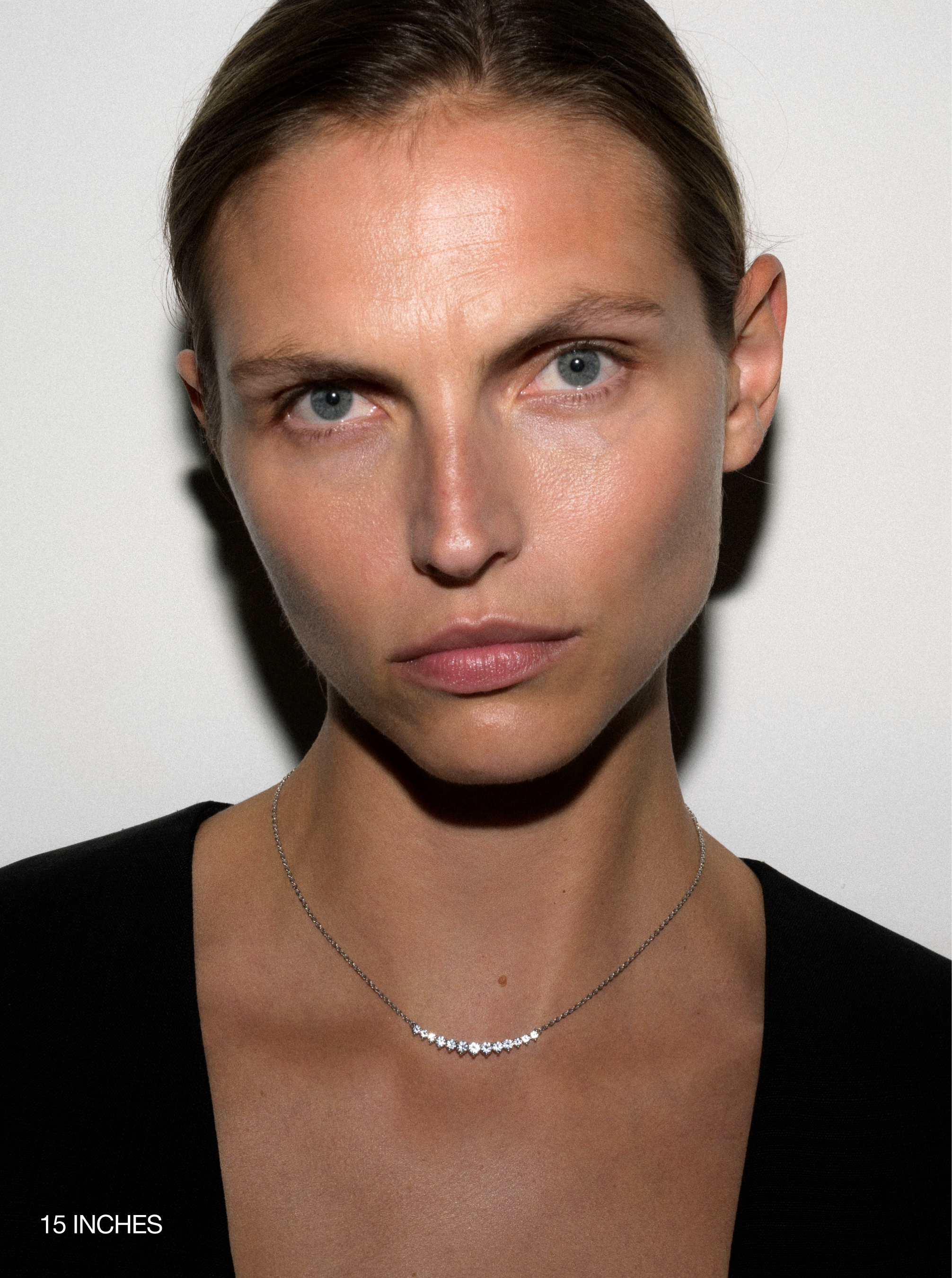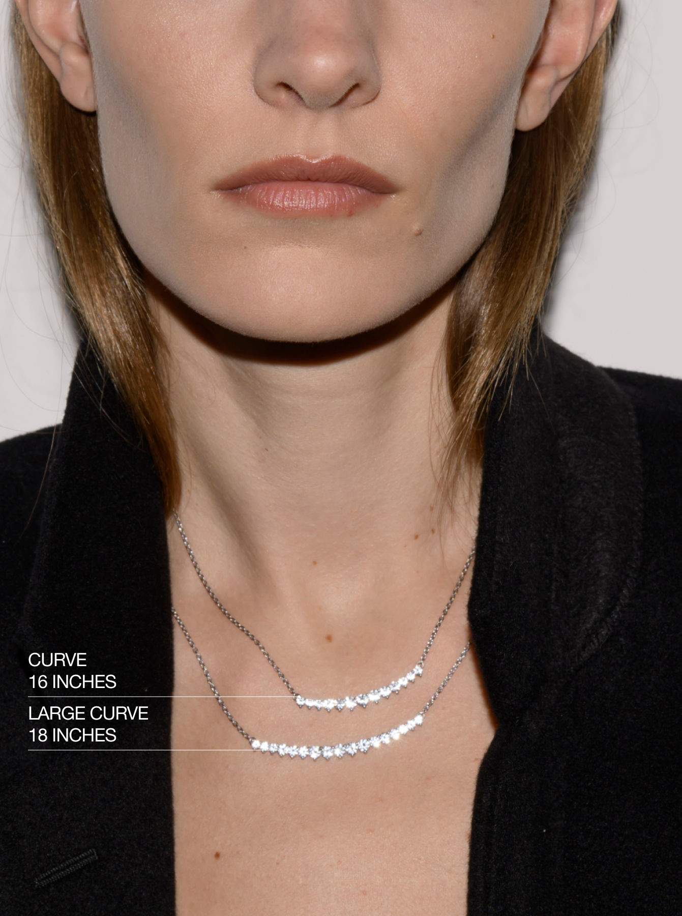 Featuring 13 lab-grown white sapphires or diamonds set in a graduating shape, the Curve Necklace is a quintessential choice for everyday wear and layering.