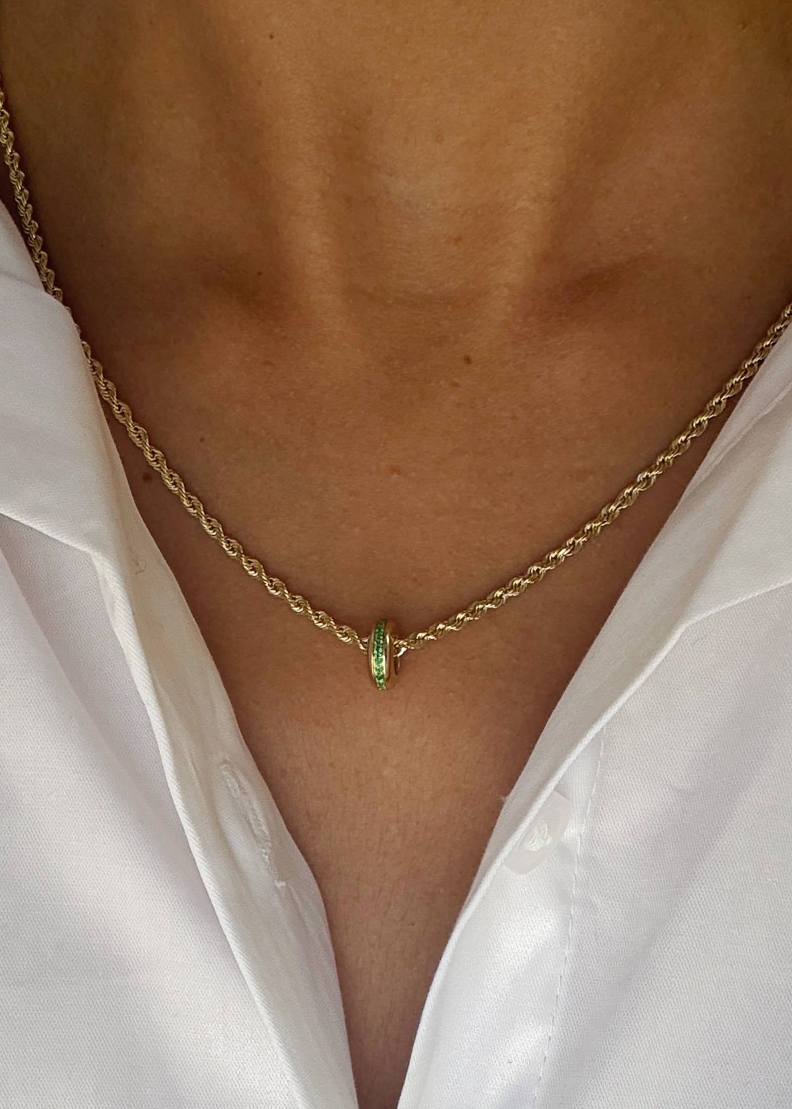 Mark special moments with our 14k solid gold rondelle charm, featuring a ring of channel-set round pavé peridot stones. Reminiscent of vintage wedding bands, it becomes a unique way to tell your story. Slide onto your favorite necklace alongside other charms and pendants, or wear alone.