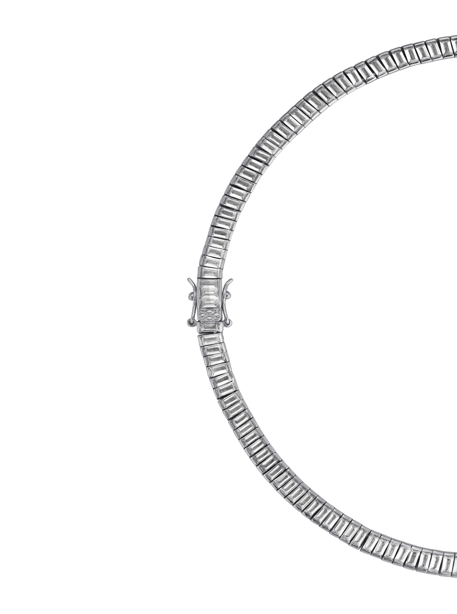 Our baguette-cut classic, reimagined for everyday. Crafted with lab-grown white sapphires set in sterling silver bars, the Petite Bessette plays well in layers, or shines on its own as a timeless collar piece.