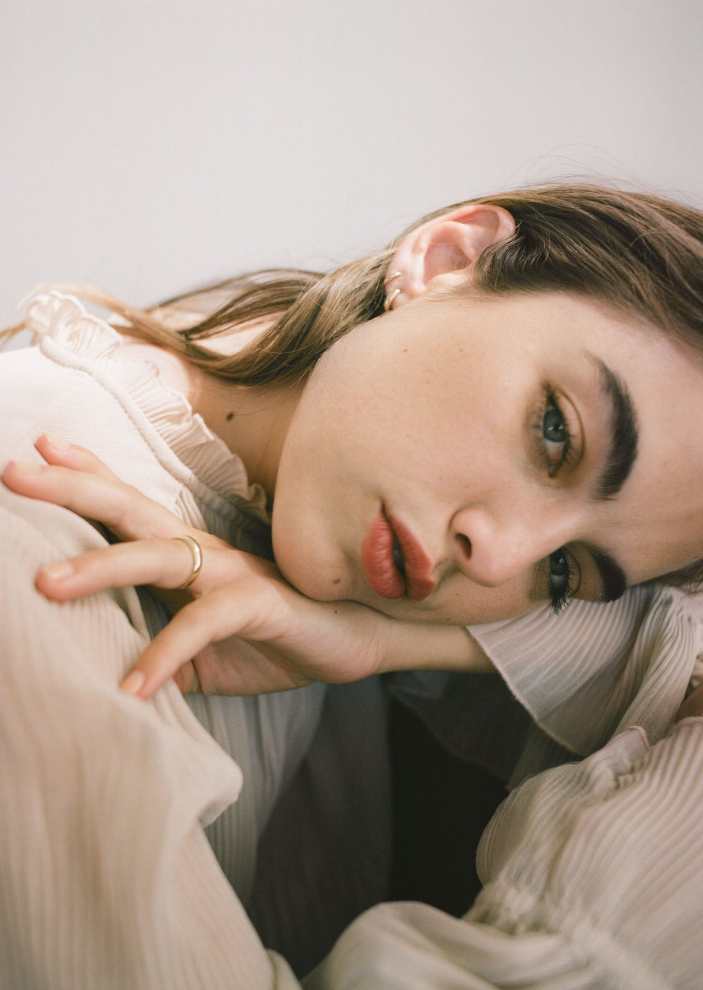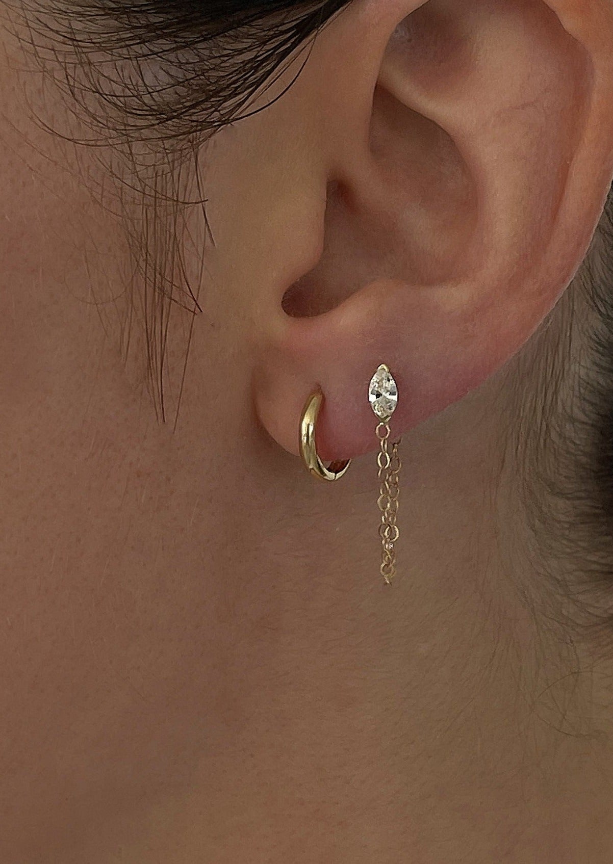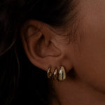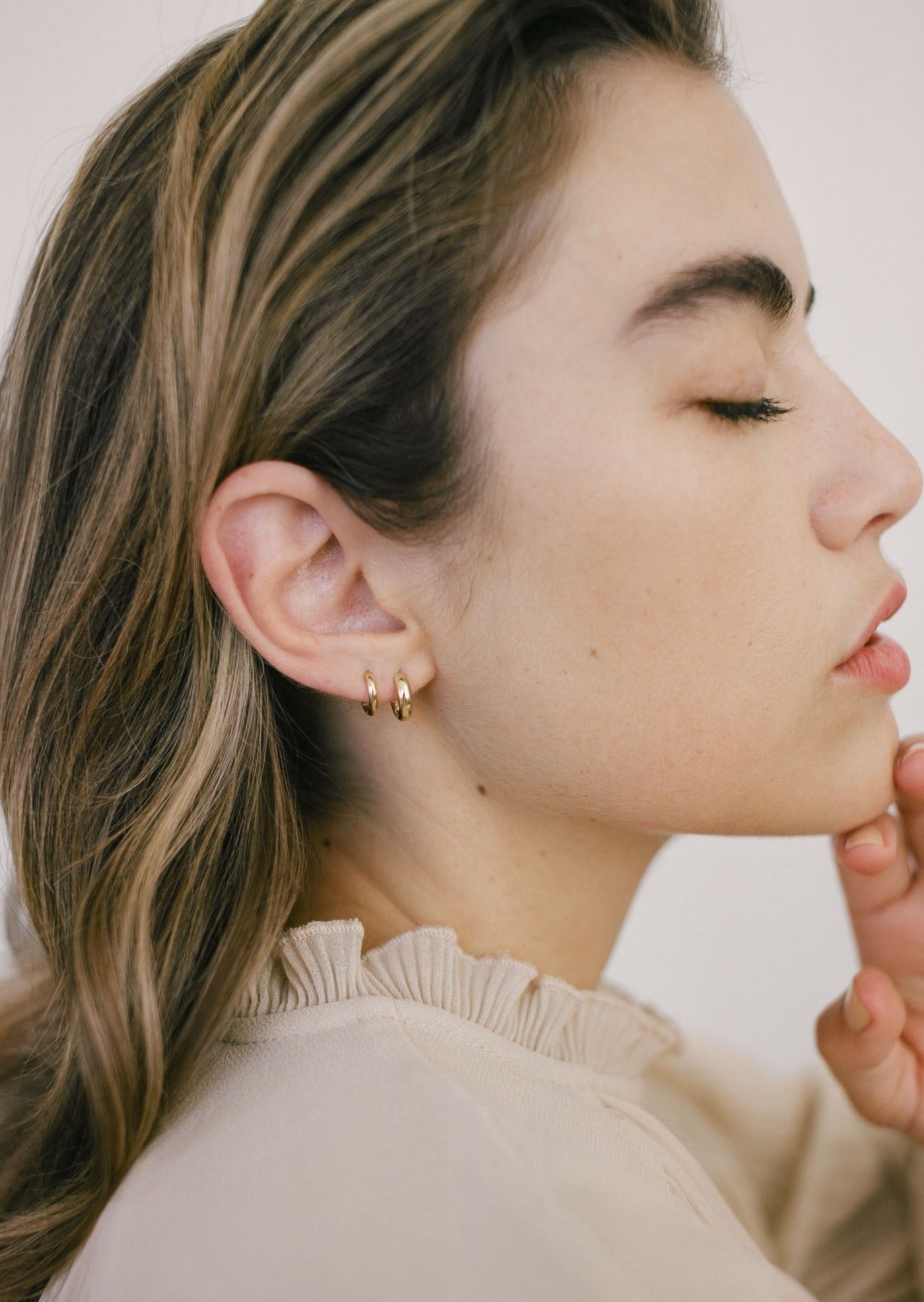 Model is wearing Mini Hoop Huggie Earrings in first piercing, and Petite Hoop Huggie Earrings in second piercing.