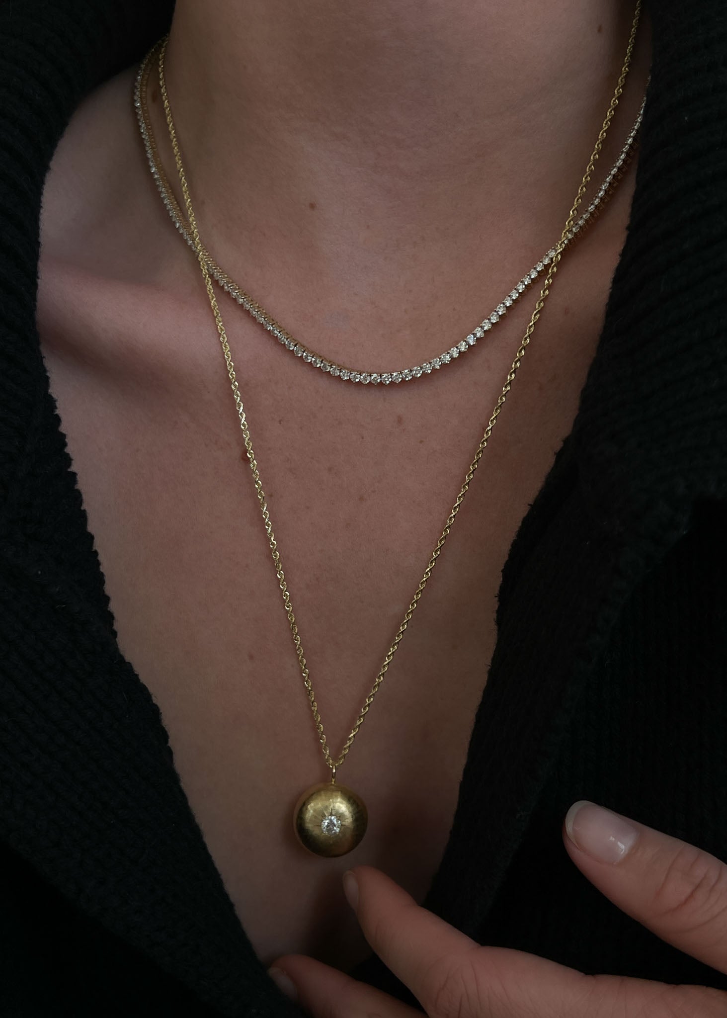 We love it styled on a longer chain, layered with a classic herringbone.