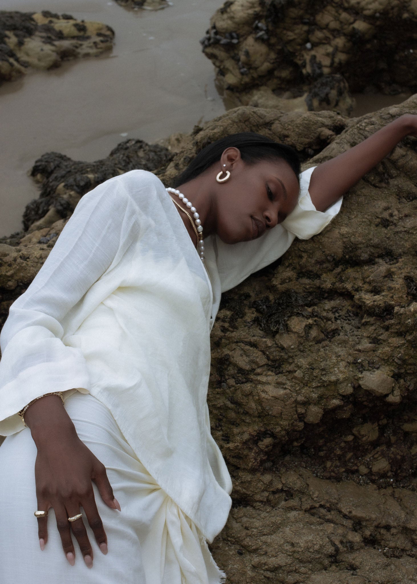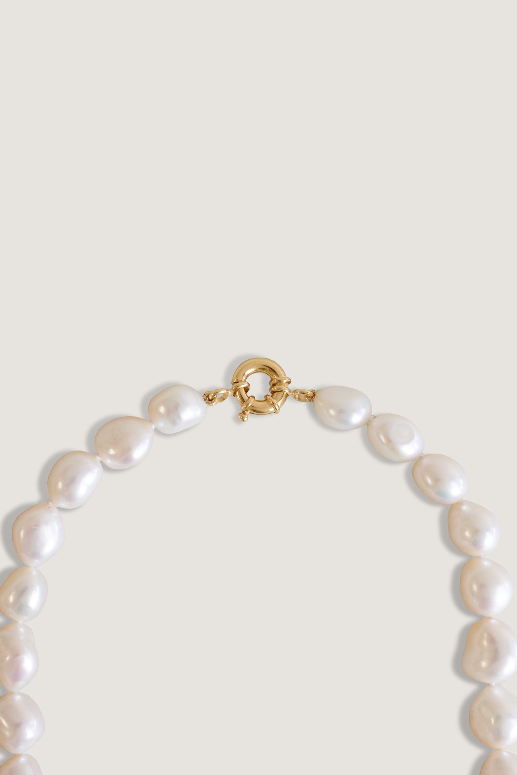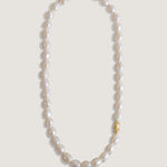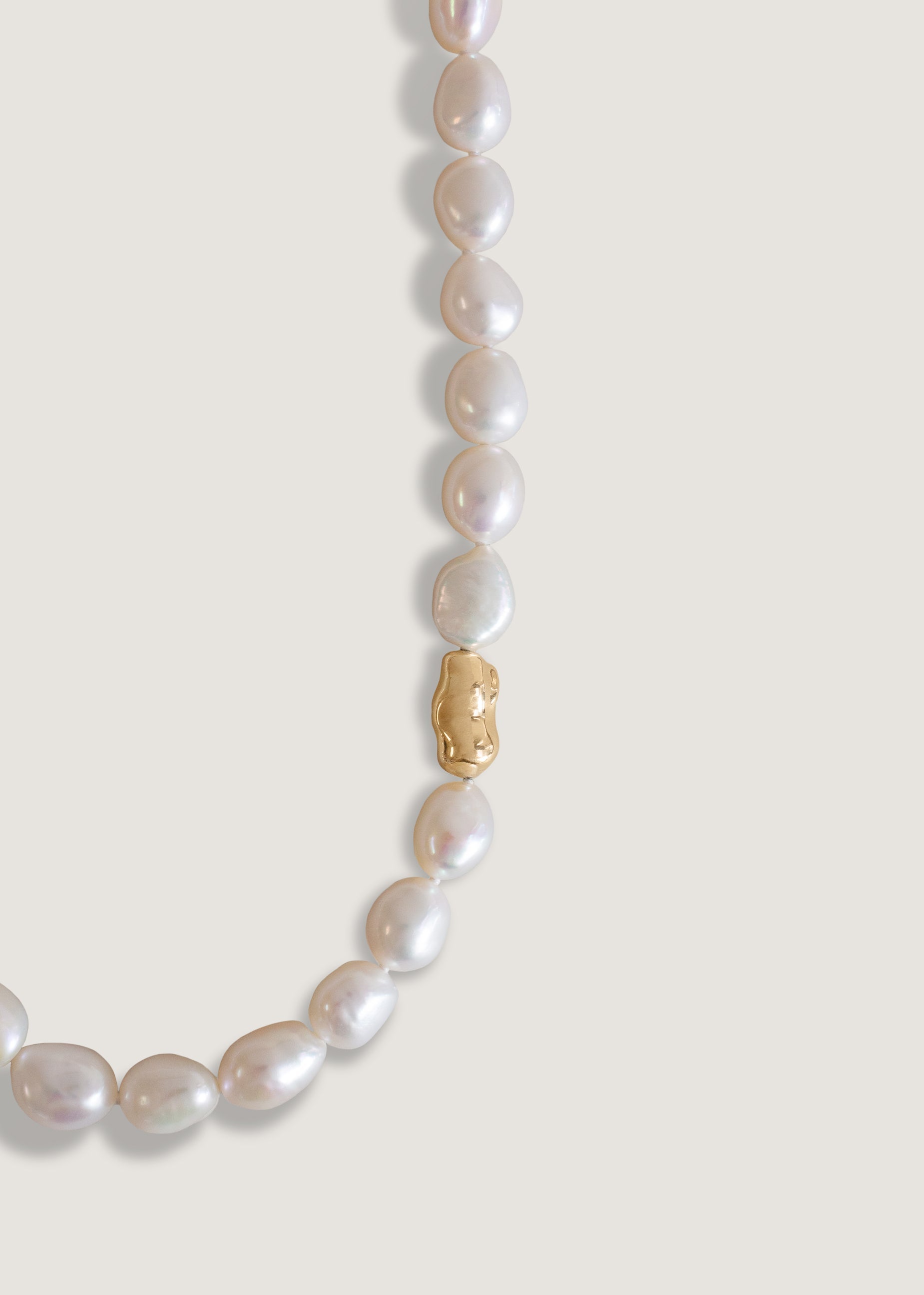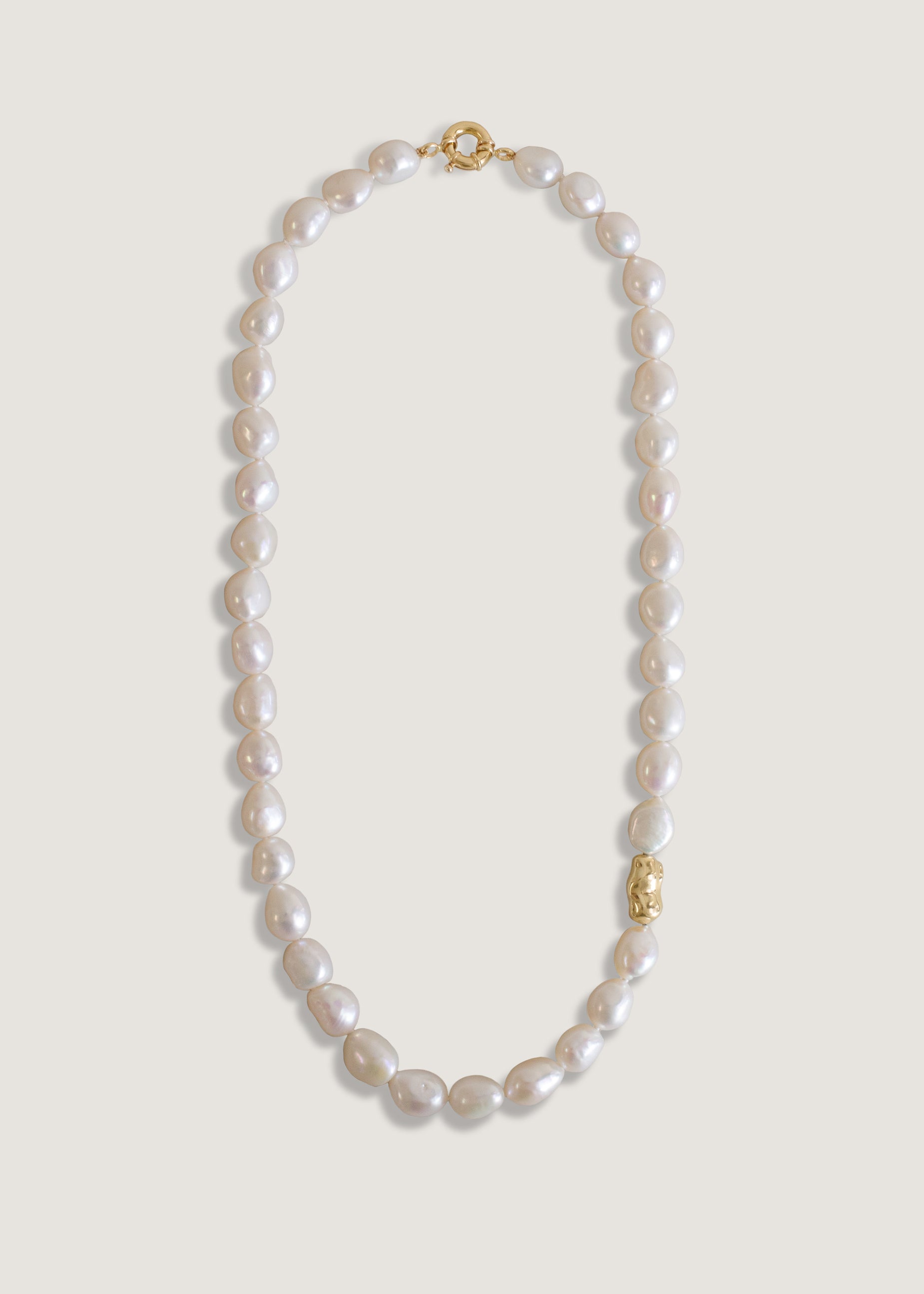 Meet Ruth—your new go to necklace. Strung and hand knotted on ivory silk, each baroque pearl is unique. Nestled among them is an organically shaped gold pendant. Simple, chic, and perfect for any occasion, this piece blends elegance with a touch of contemporary flair.