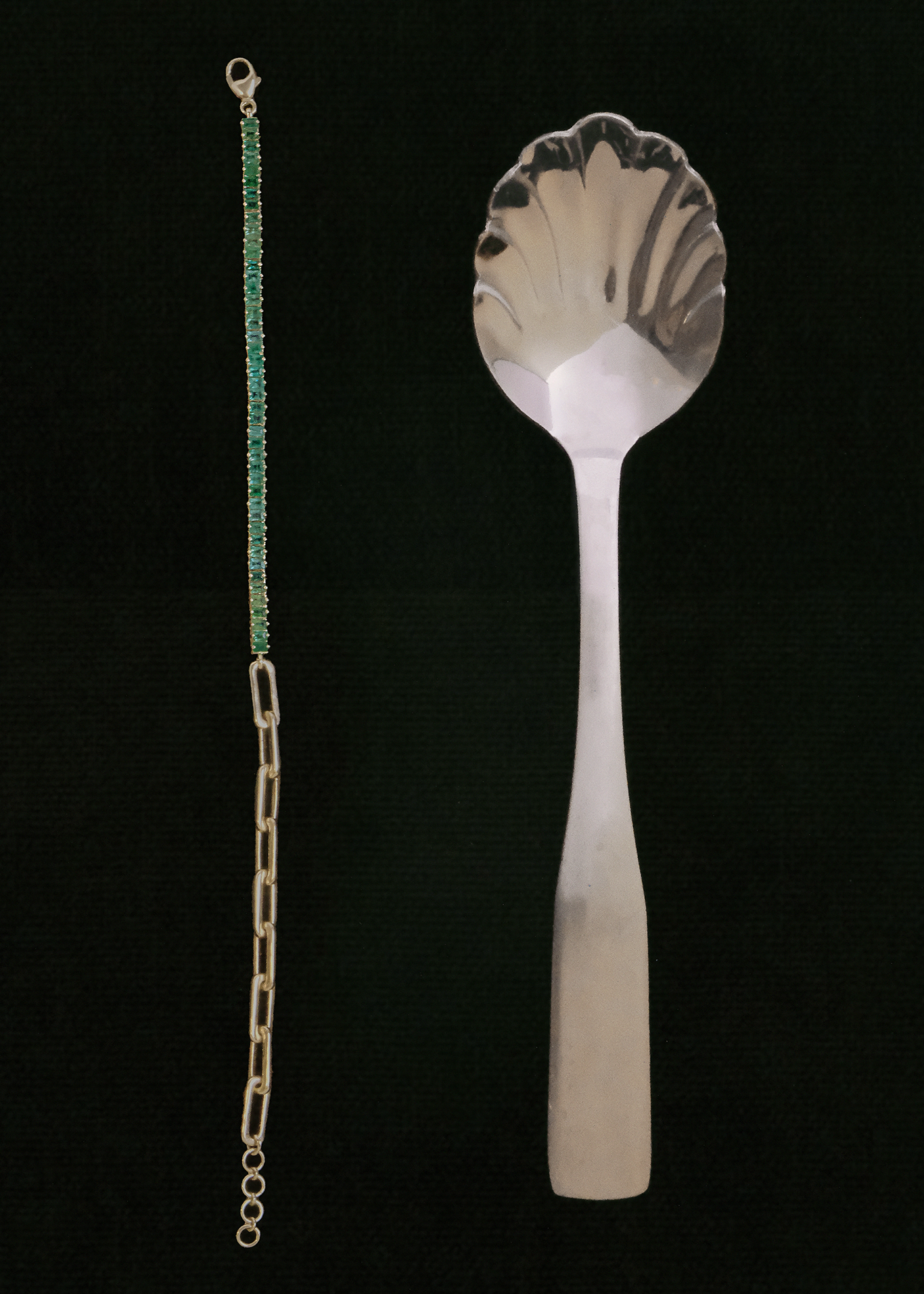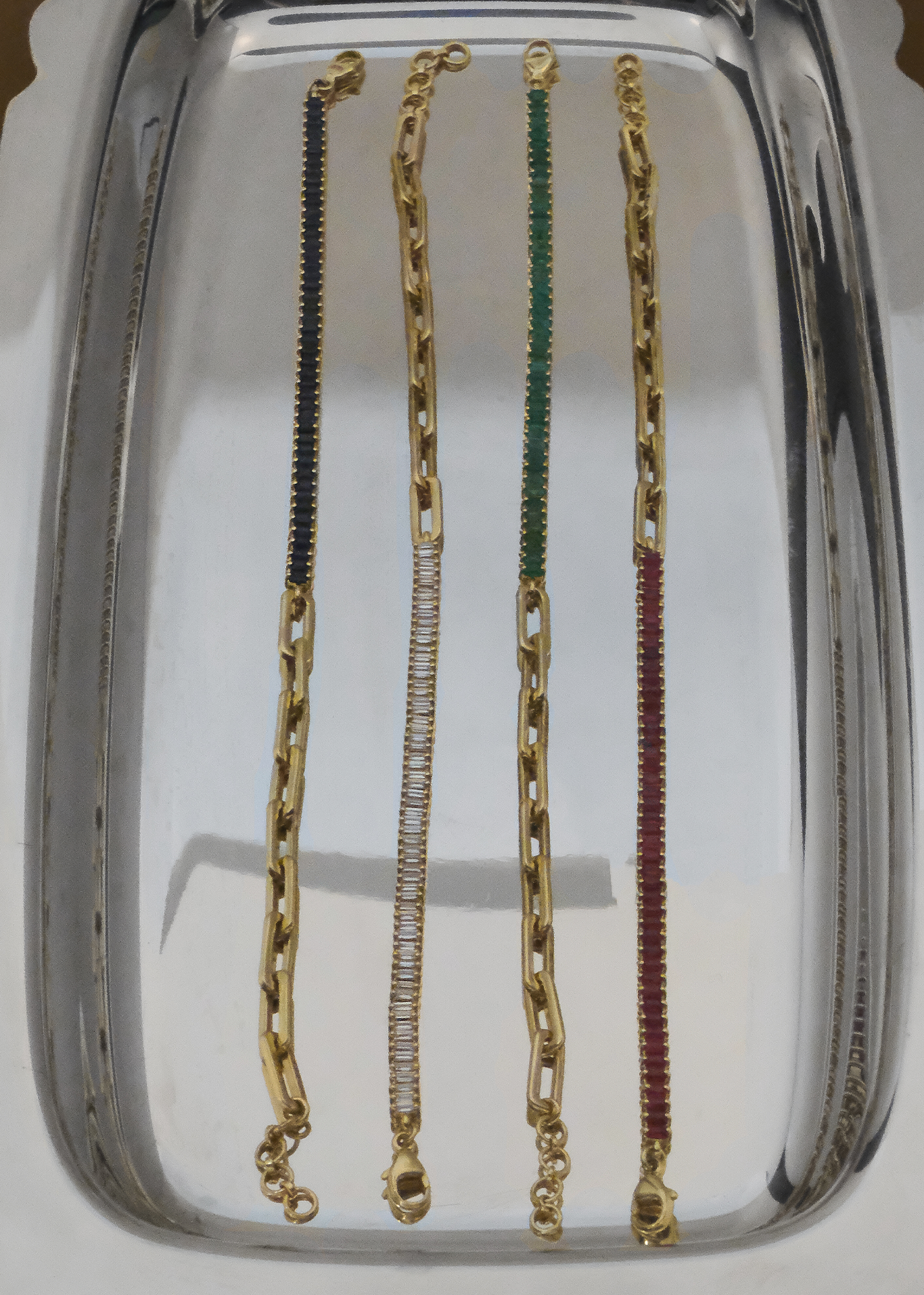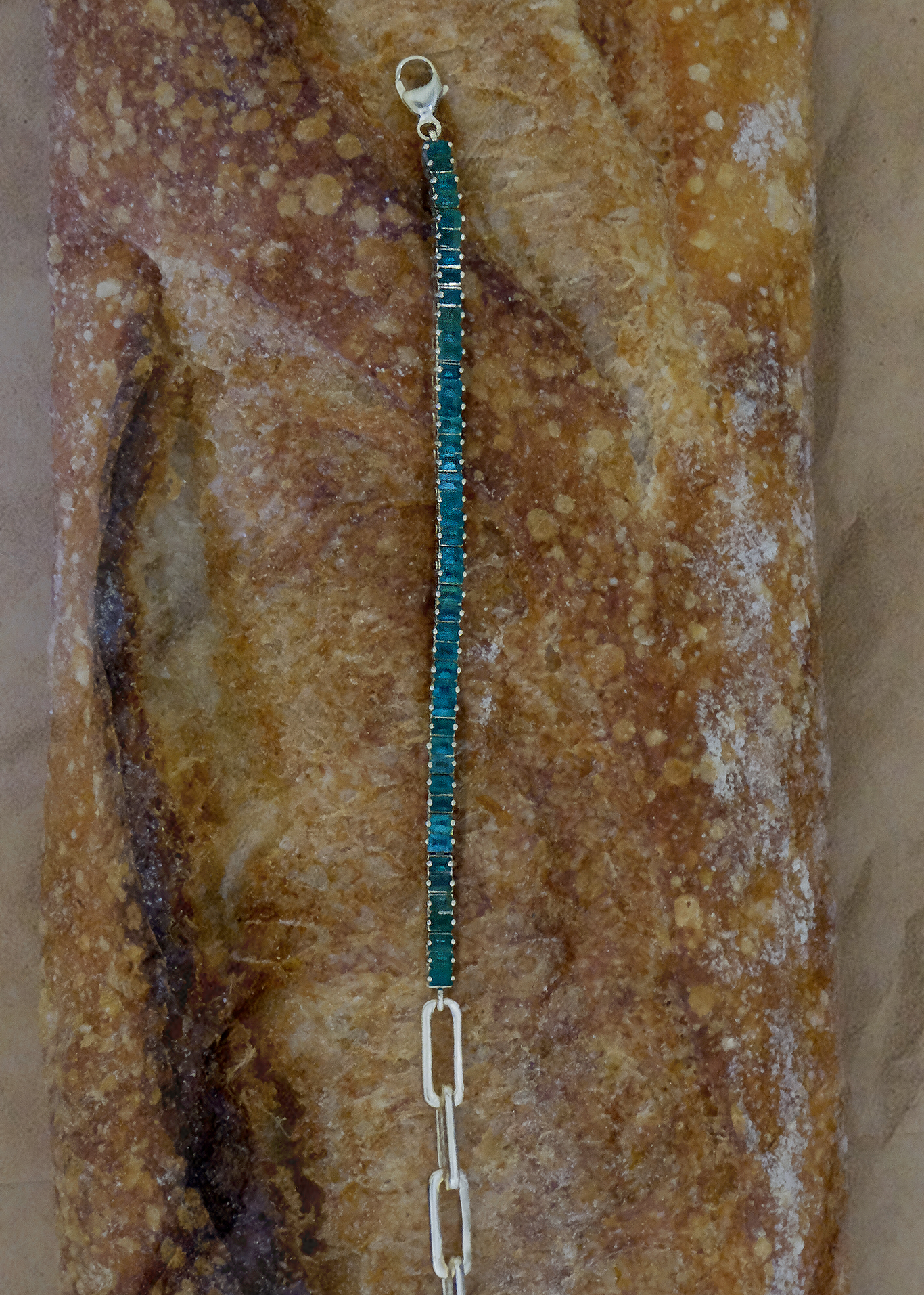 The TWO / ONE Collection features contrasting materials for textural interest and elegant balance. Half paperclip-style classic link chain in 14k yellow gold, half vertical baguette tennis bracelet in vivid emeralds. Let this distinctive piece become your new signature, worn alone or adding dimension to a stack.