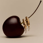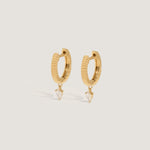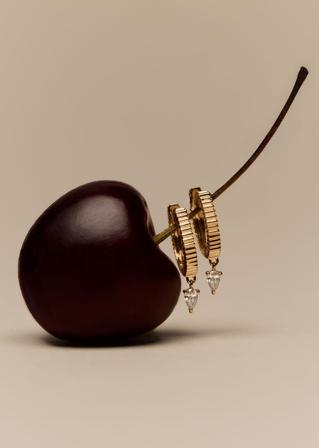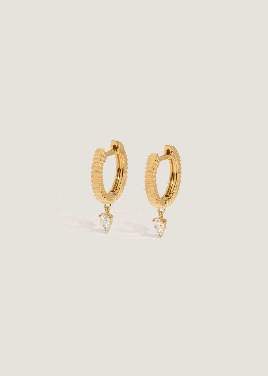 Inspired by our signature ribbed ring, our Solis huggies feature solid gold fluting and elegantly suspended pear-shaped diamonds. Full of texture and interest to stand alone in your first piercing or stand out in your second.