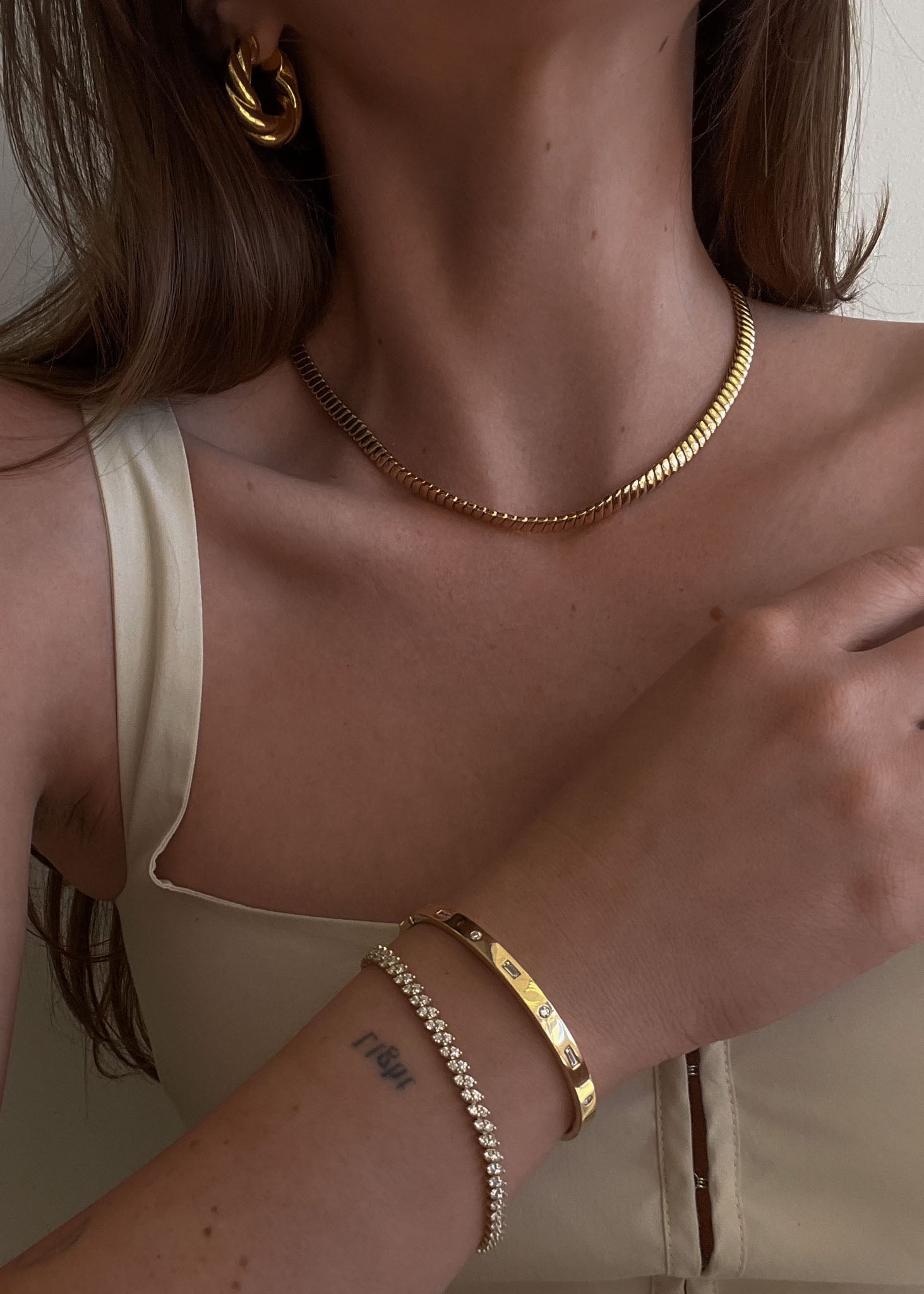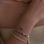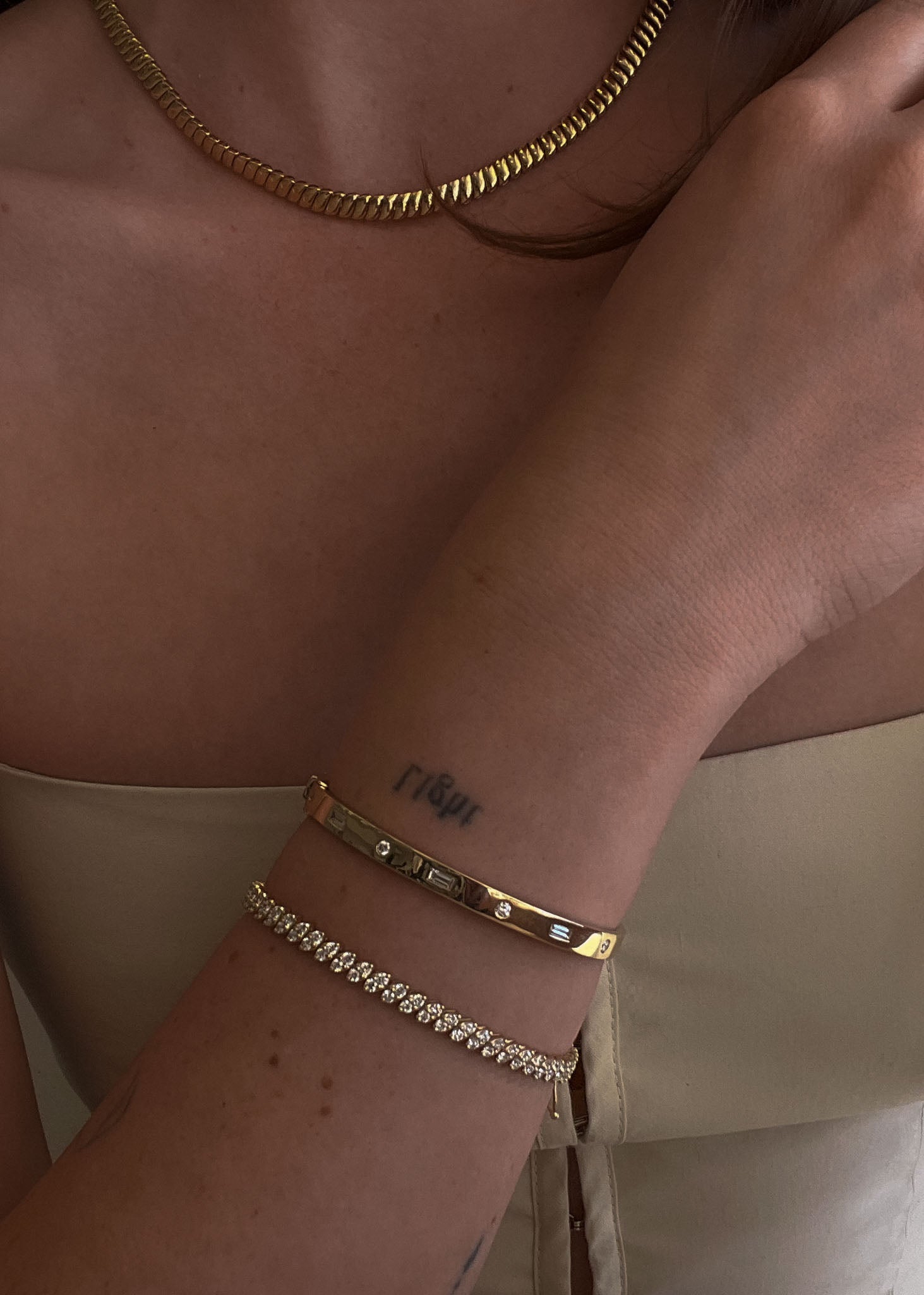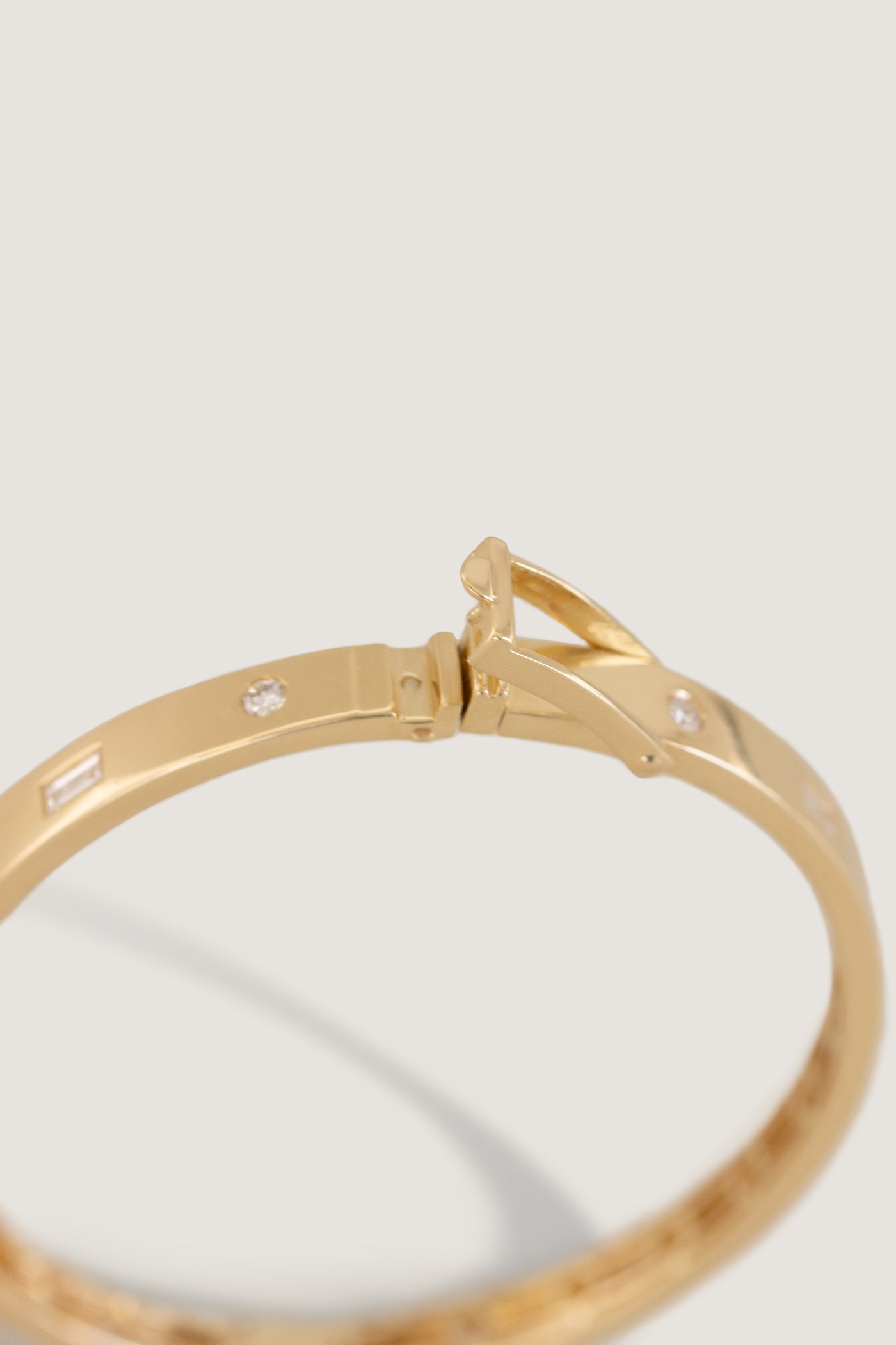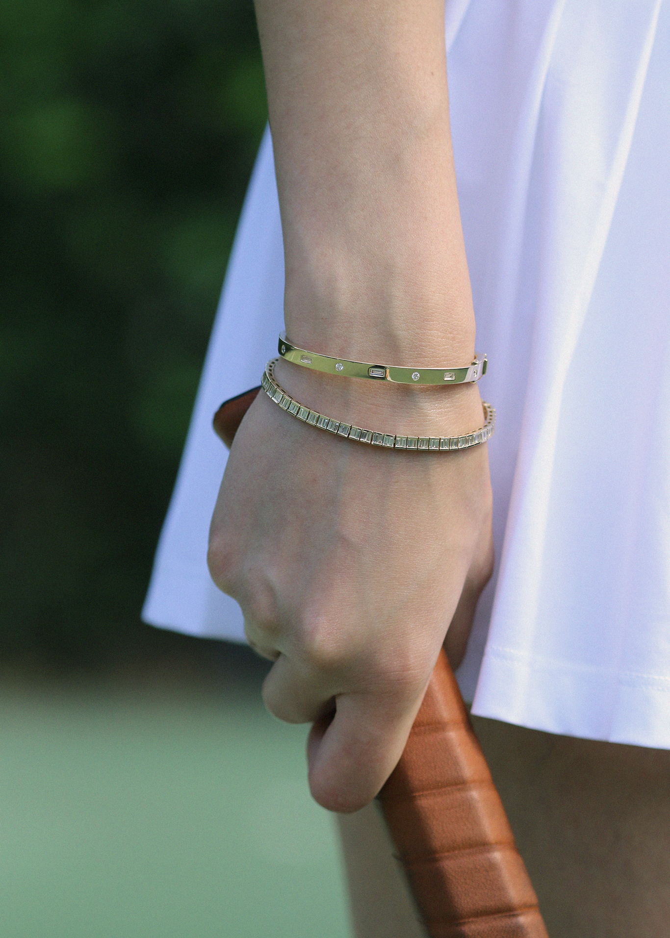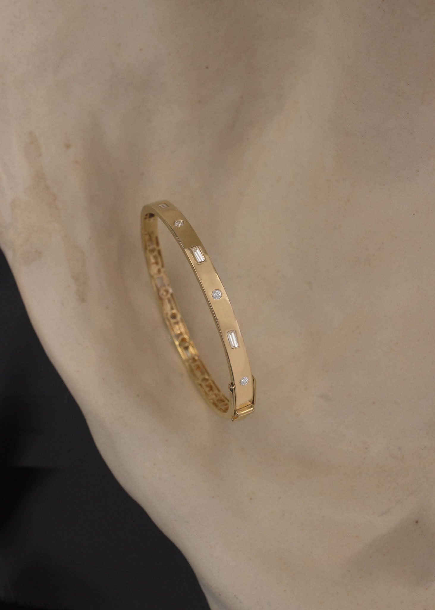The Tara Bangle Bracelet is a classic and modern gold bangle with alternating round and baguette diamonds for texture and elegance—designed to be worn throughout your lived moments. Stack with a tennis bracelet.