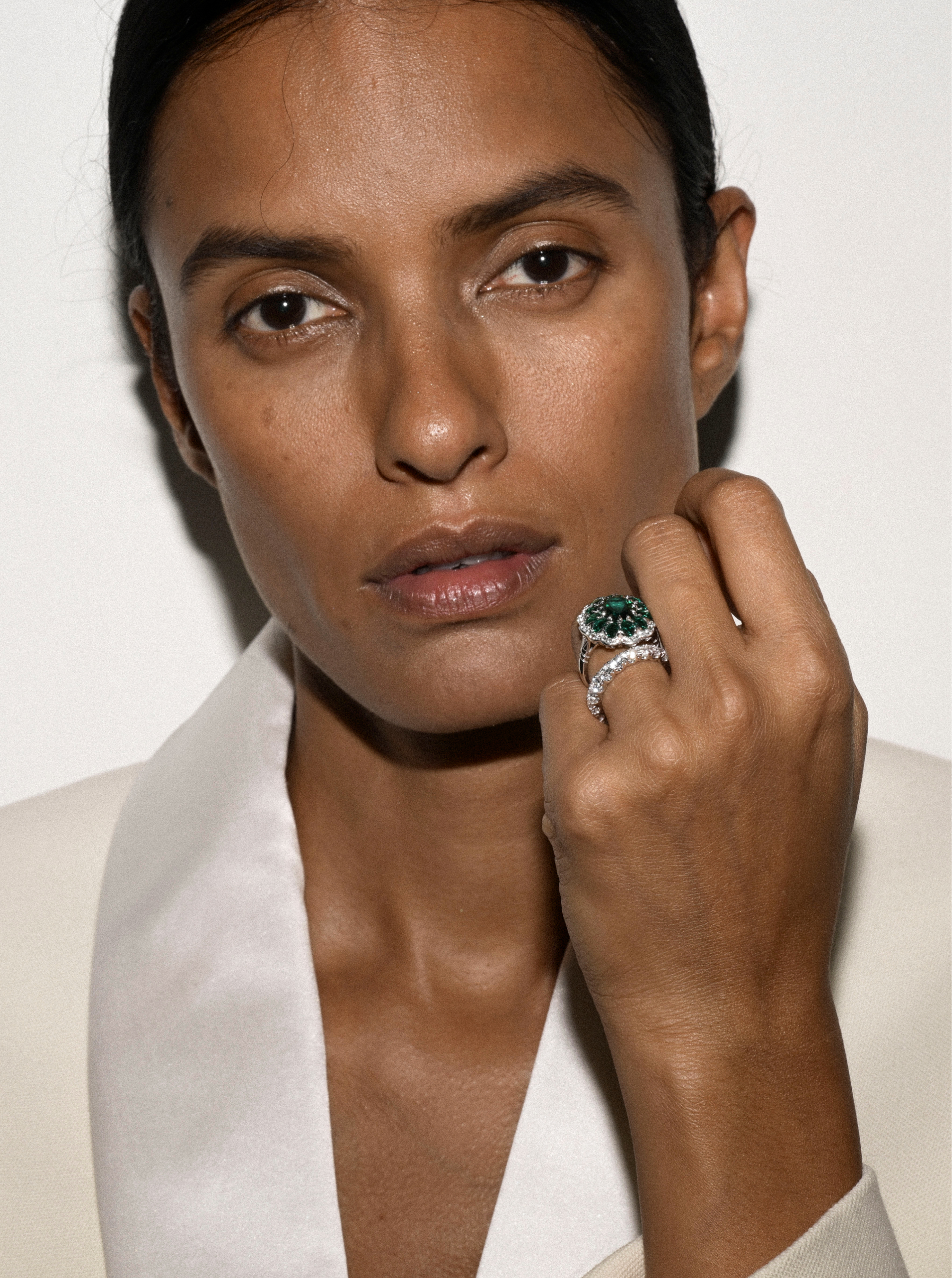 • Outer halo: Lab-grown white sapphire or diamond