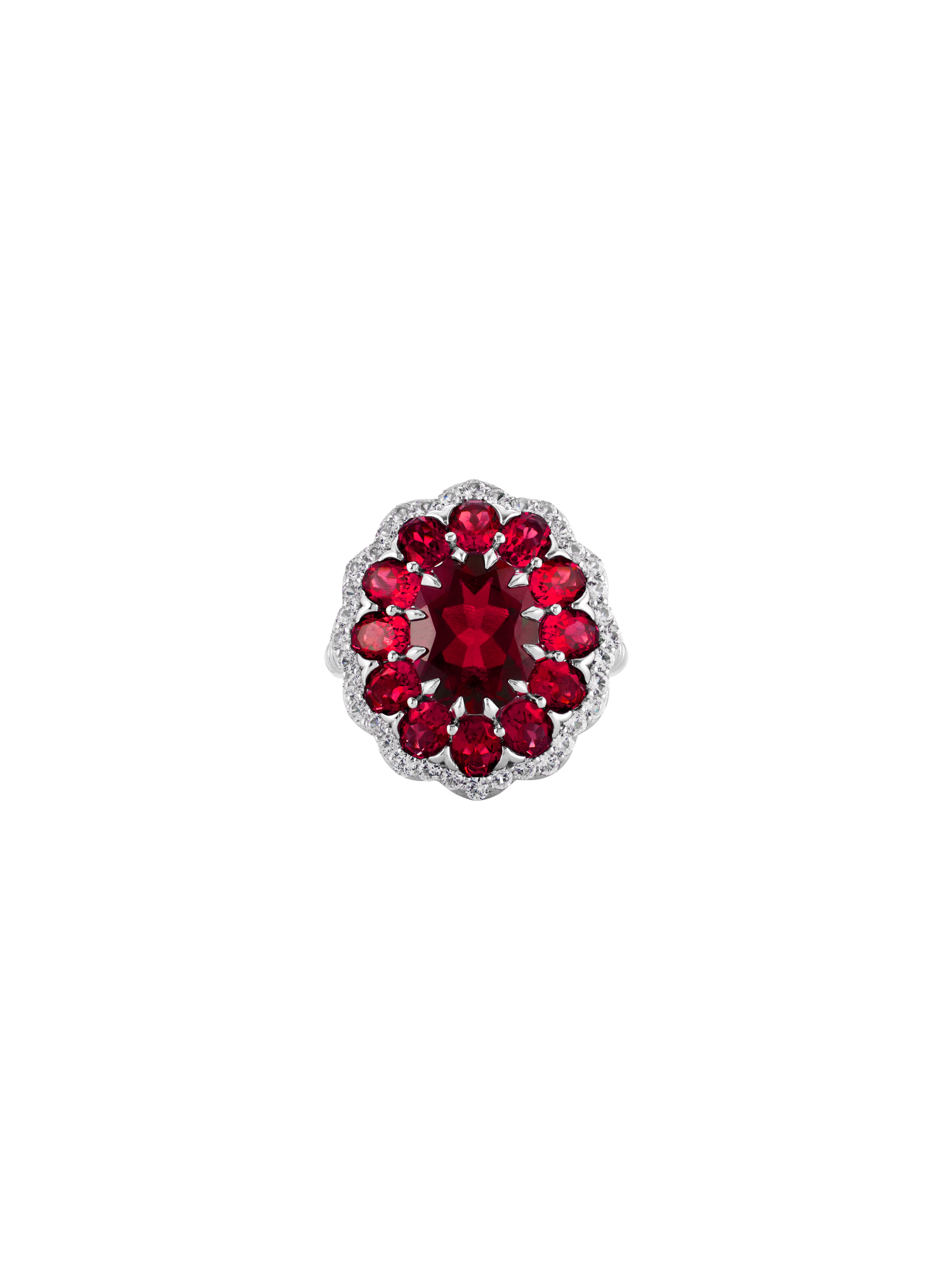 The Tate Cocktail Ring features a 2.5-carat oval lab-grown red sapphire, encircled by oval red sapphires and round white sapphires or diamonds.