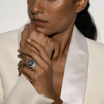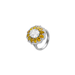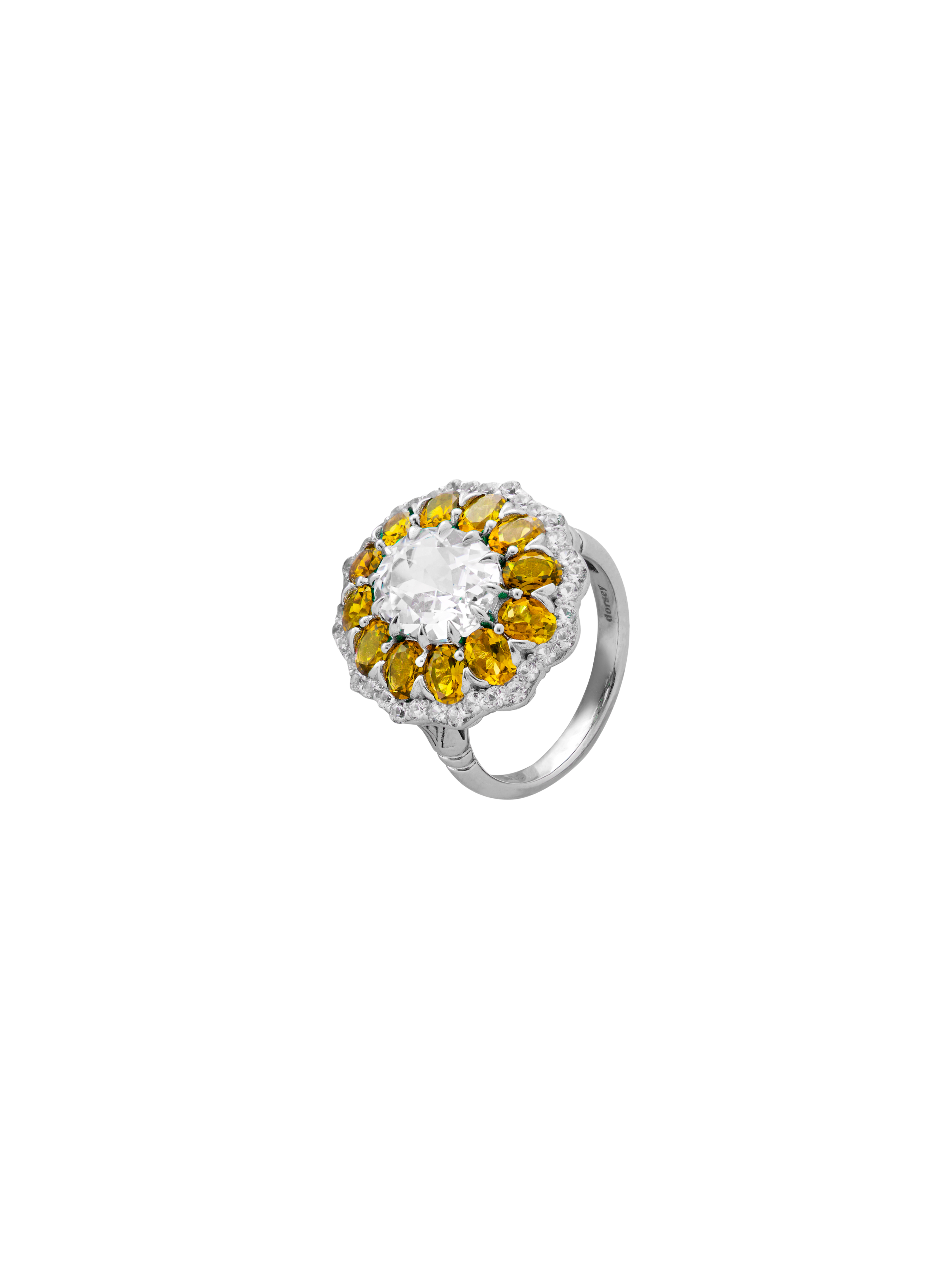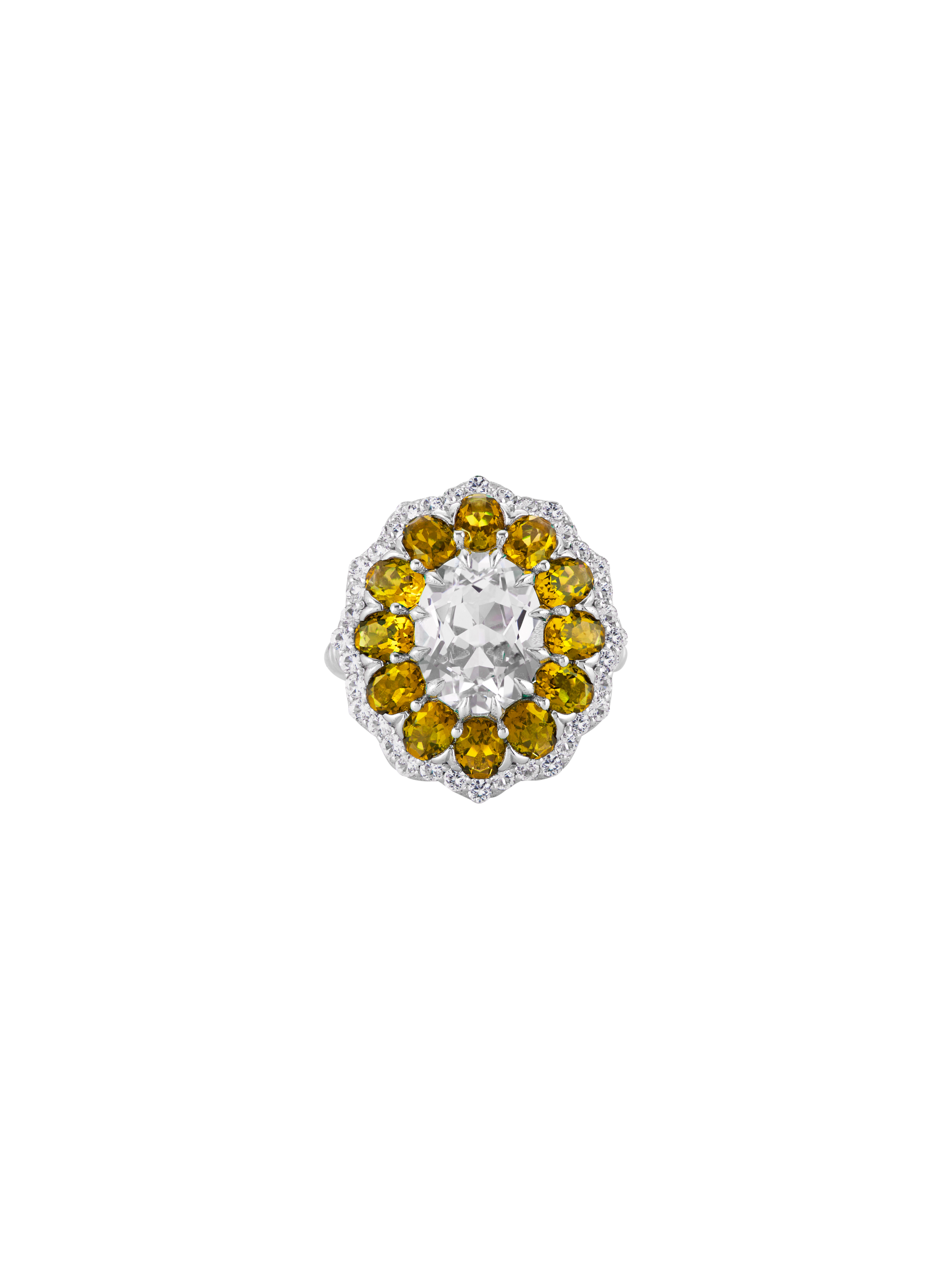 The Tate Cocktail Ring features a 2.5-carat oval lab-grown white sapphire, encircled by oval yellow sapphires and round white sapphires or diamonds.