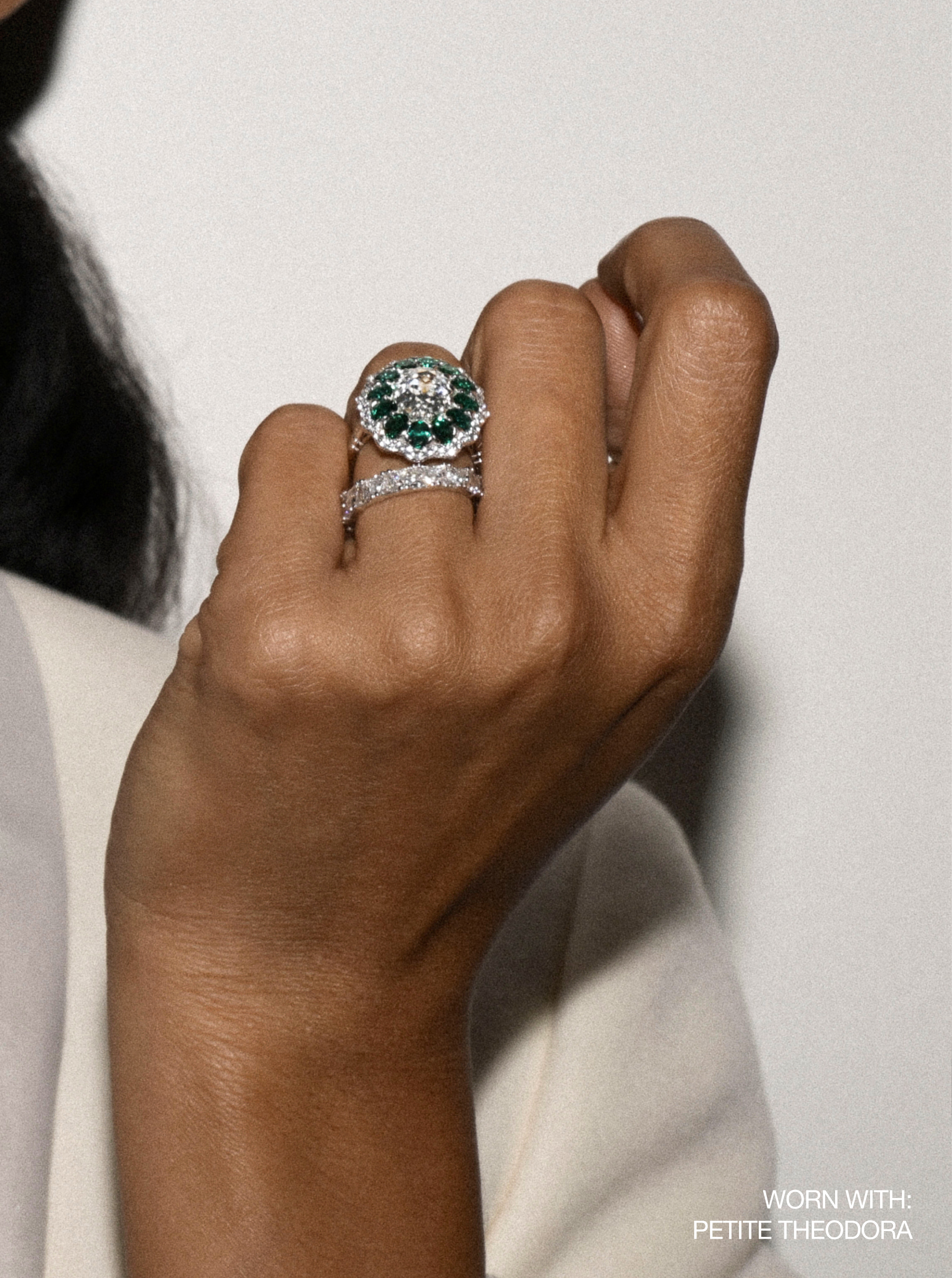 The Tate Cocktail Ring features a 2.5-carat oval center, encircled by a halo of oval and round gemstones. Choose from lab-grown white sapphire or diamond.