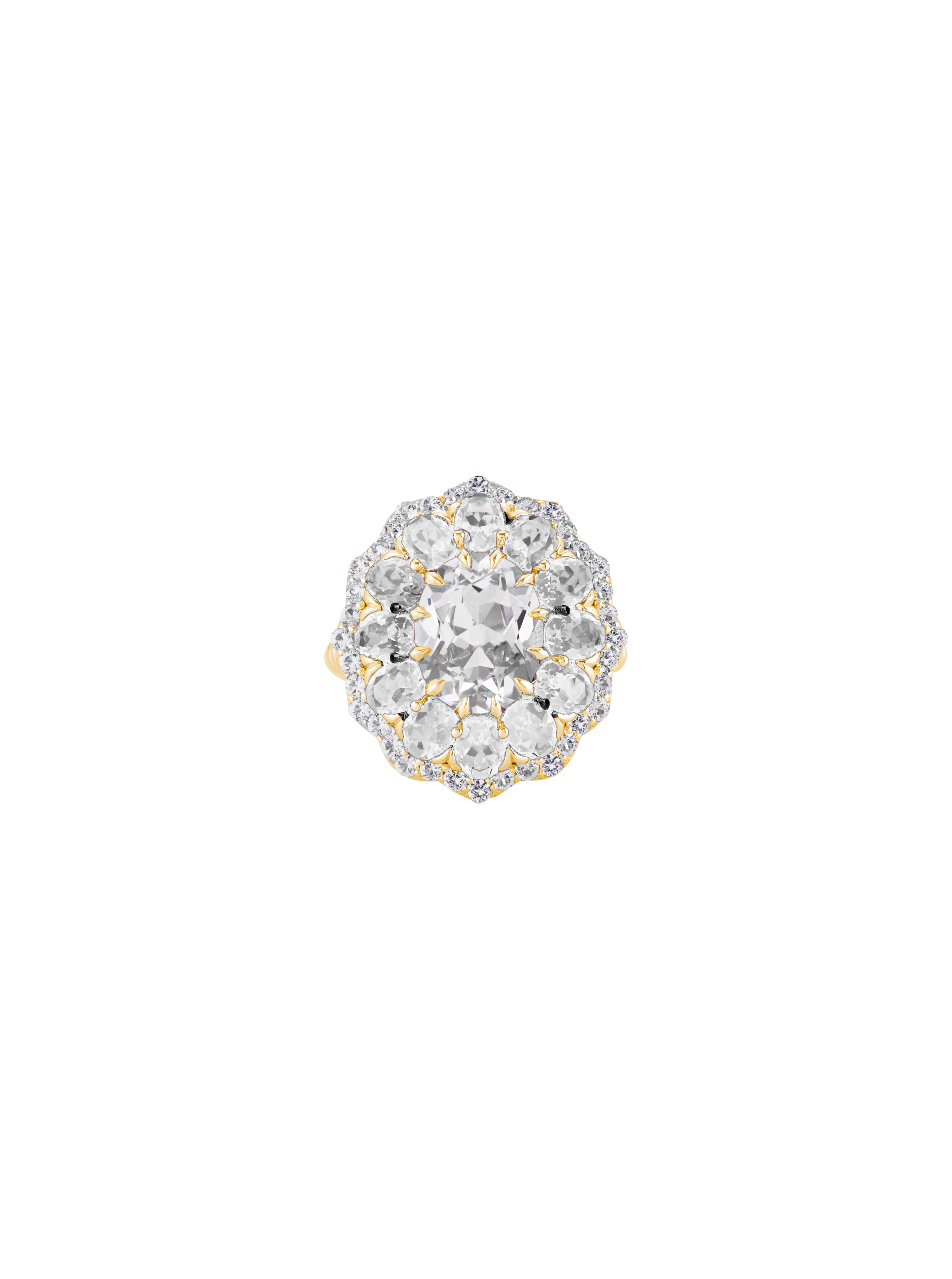 • Stone shape: Oval cut center and inner halo, round cut outer halo