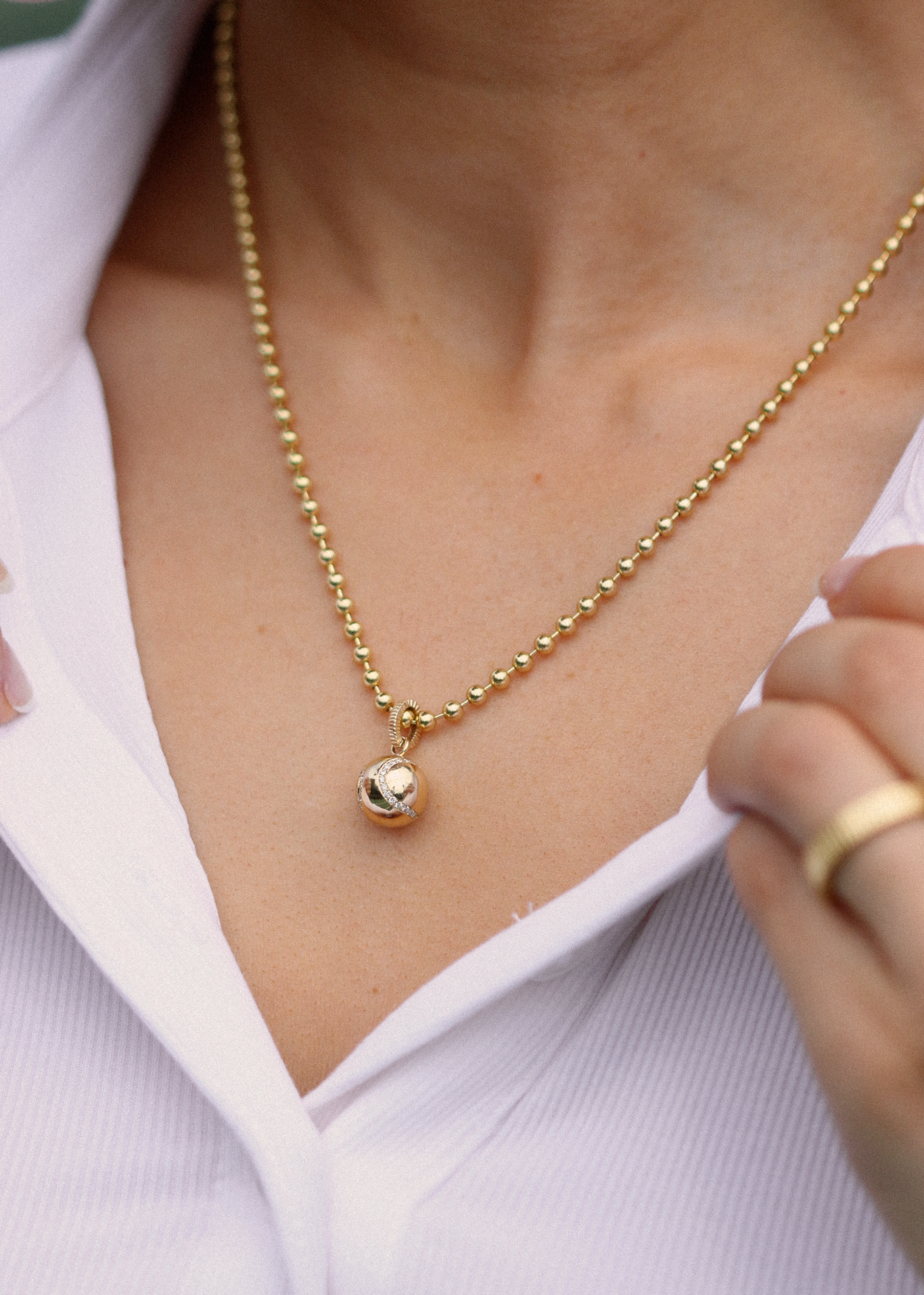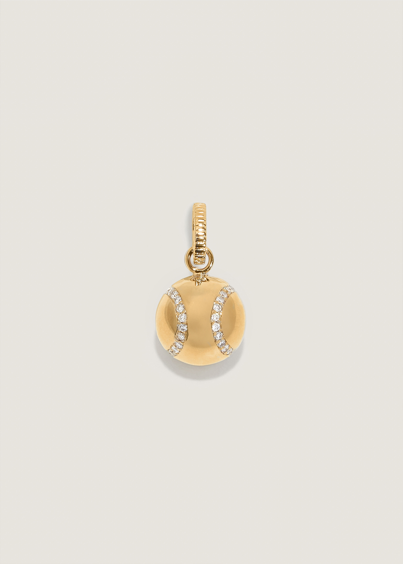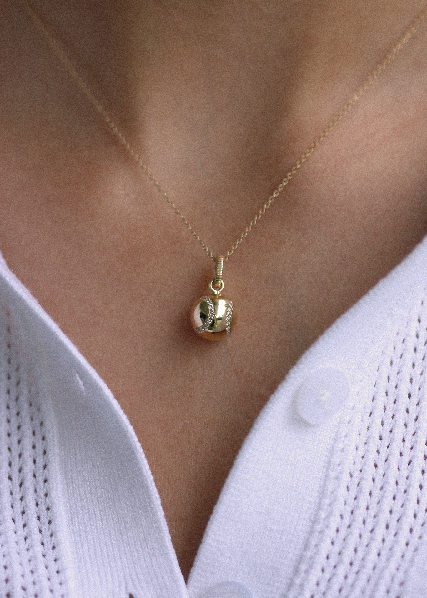 Eye on the prize. Our courtside-ready tennis ball pendant is crafted in 14k solid yellow gold with sparkling pavé diamond seams. A whimsical yet timeless charm with a vintage aesthetic. Designed to layer on your favorite chain and pass down to those who share your passion.