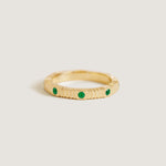 Inspired by the classic ribbing in our best selling Solis Ring—The Inés eternity band is a timeless piece, featuring eight round emeralds flush set in a 14k gold band.