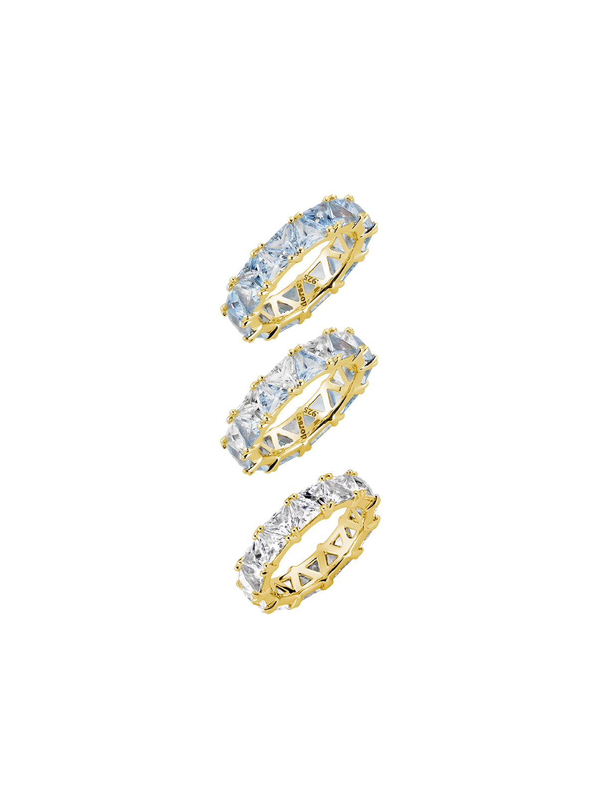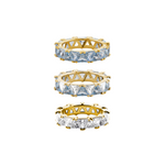 3 double trillion bands crafted with lab-grown aqua spinel and white sapphires. Designed to be mixed and stacked, seamlessly layering together. The Theodora Stack is a fresh take on the singular statement ring.