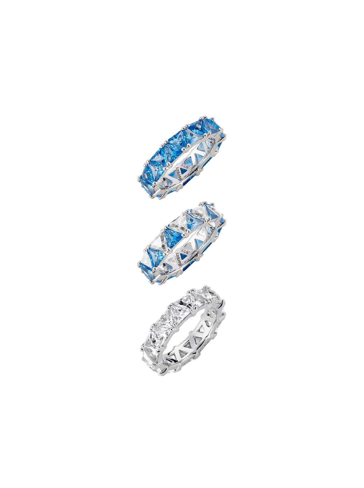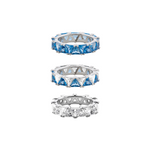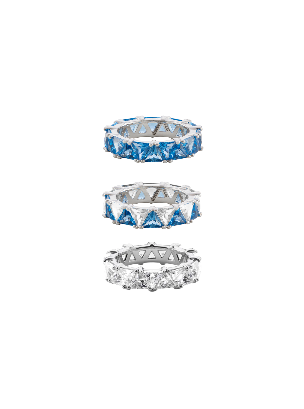 3 double trillion bands crafted with lab-grown blue topaz and white sapphires. Designed to be mixed and stacked, seamlessly layering together. The Theodora Stack is a fresh take on the singular statement ring.