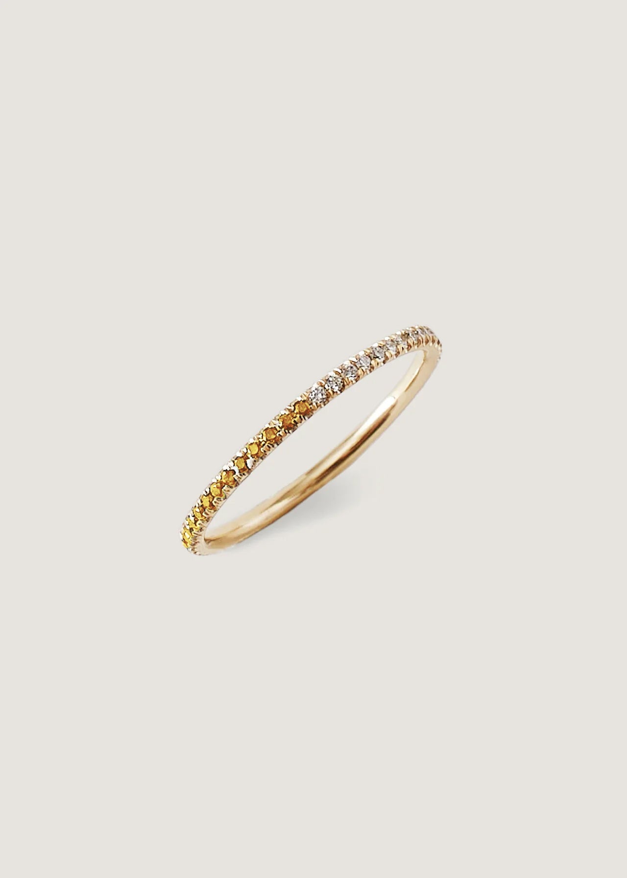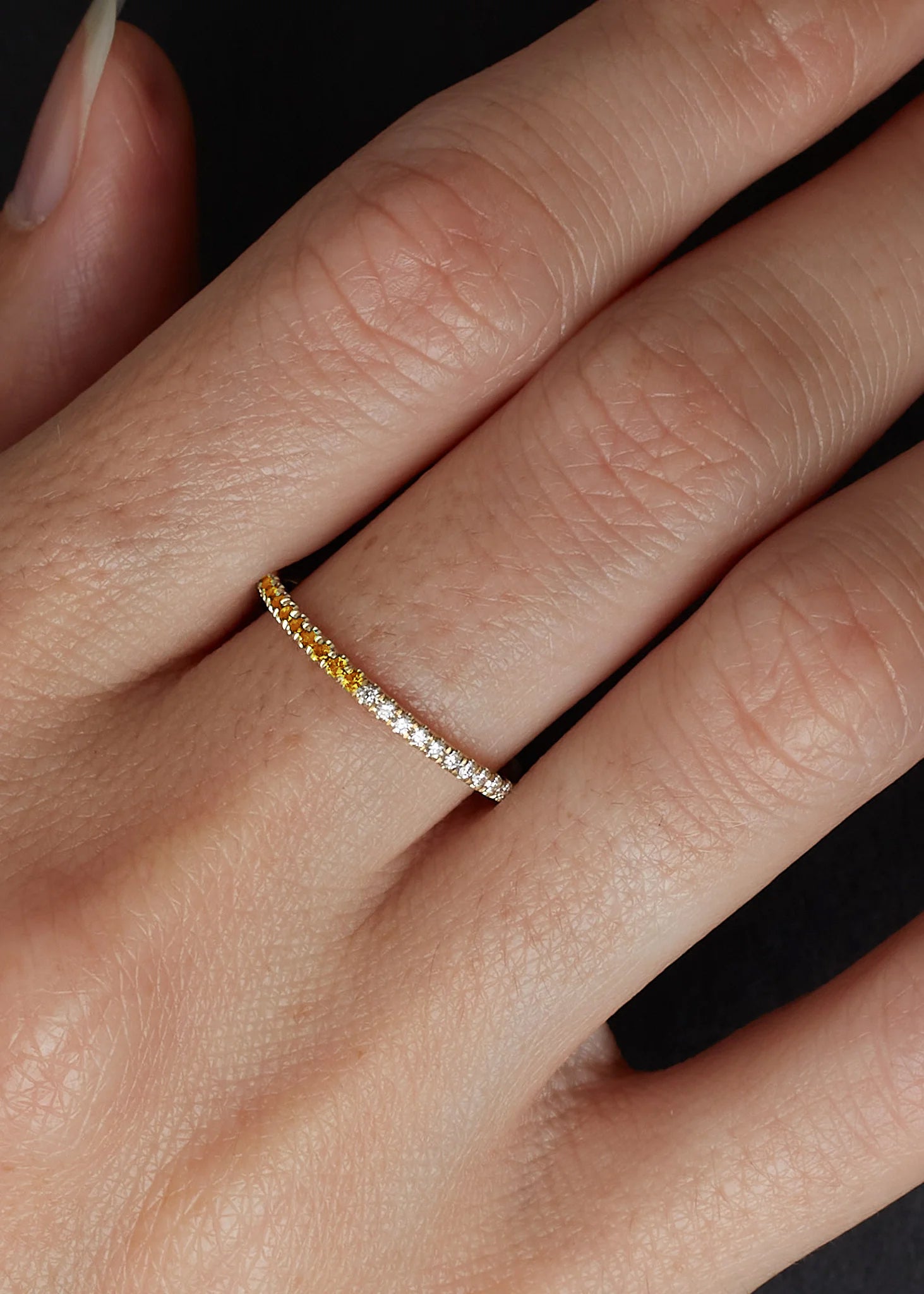 Like the harmonious contrast of Yin and Yang, our TWO / ONE Collection features contrasting gemstones that create elegant balance. This classic eternity ring is designed on one half with pavé diamonds and the other half with pavé citrines. Worn to showcase the split or favor one side depending on the day and aesthetic, it’s a dynamic piece to add to your collection.