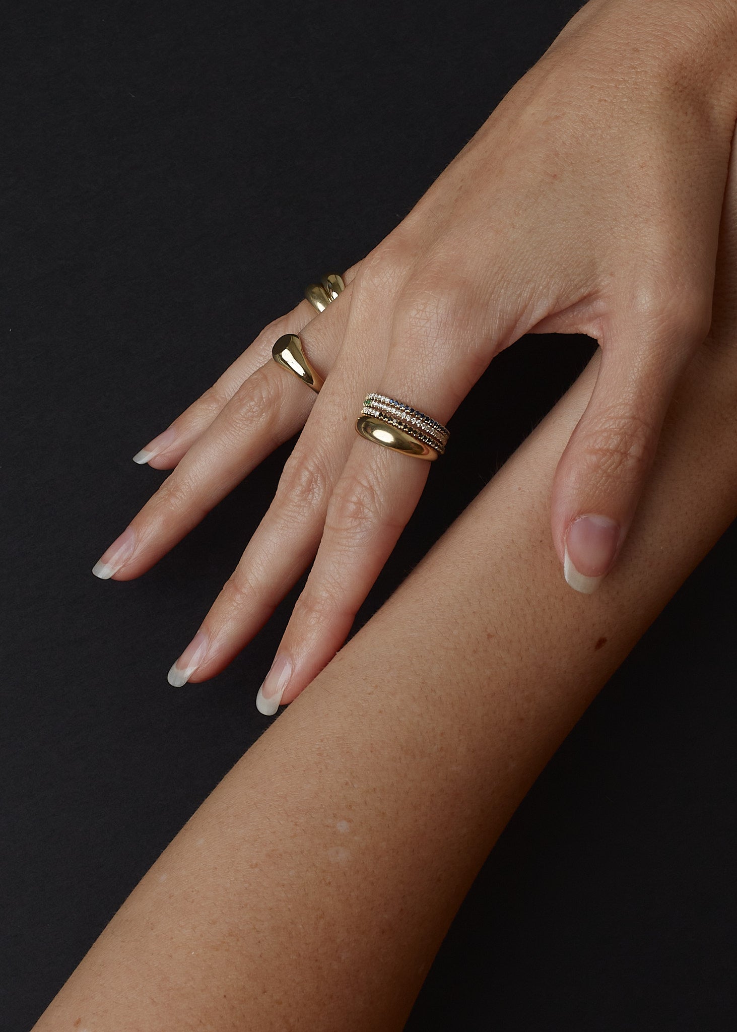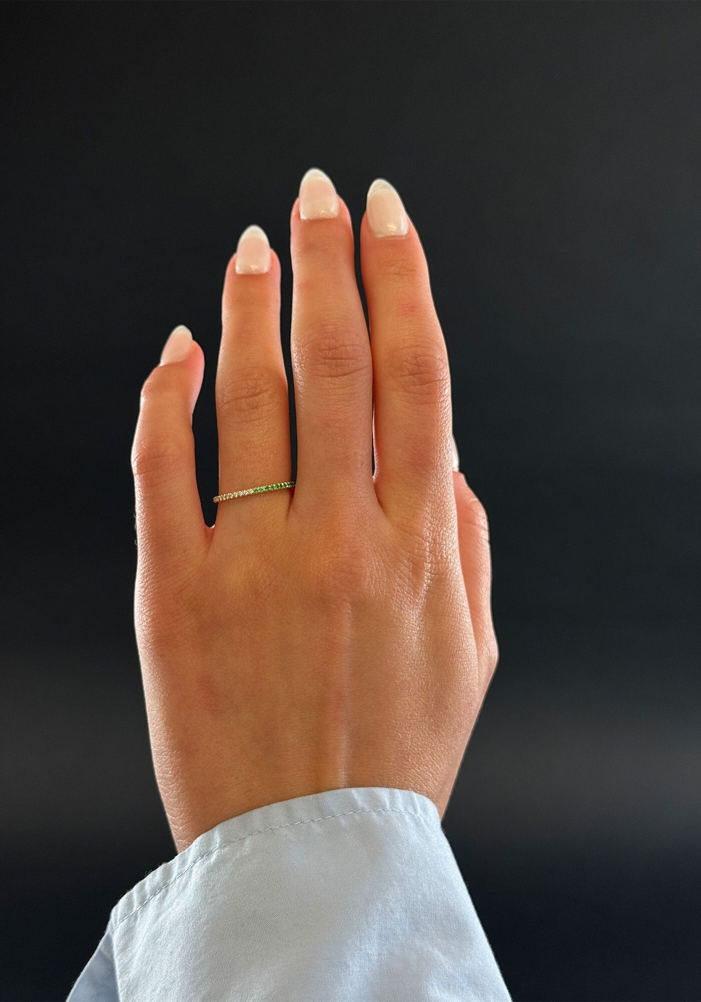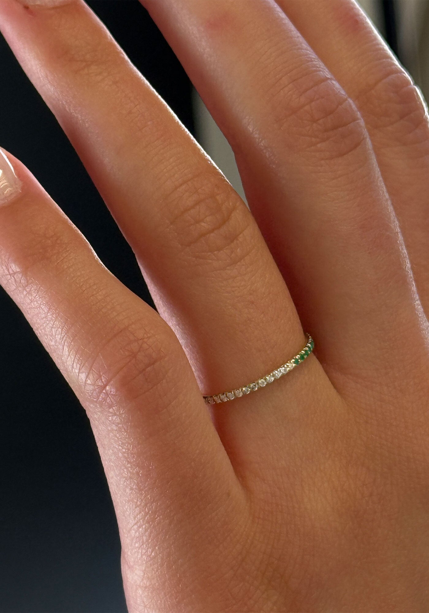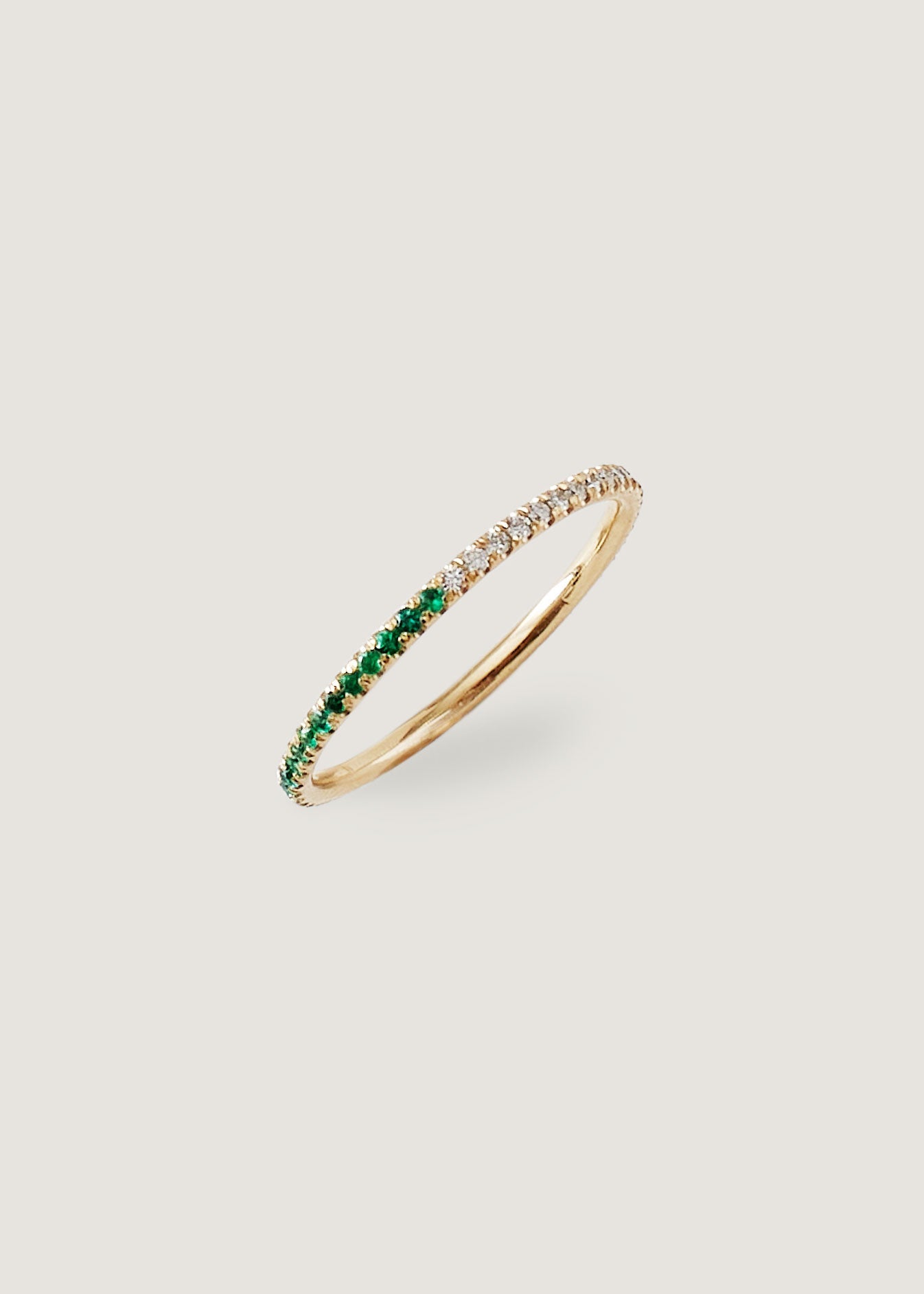Like the harmonious contrast of Yin and Yang, our TWO / ONE Collection features contrasting gemstones that create elegant balance. This classic eternity ring is designed on one half with pavé diamonds and the other half with pavé emeralds. Worn to showcase the split or favor one side depending on the day and aesthetic, it’s a dynamic piece to add to your collection.