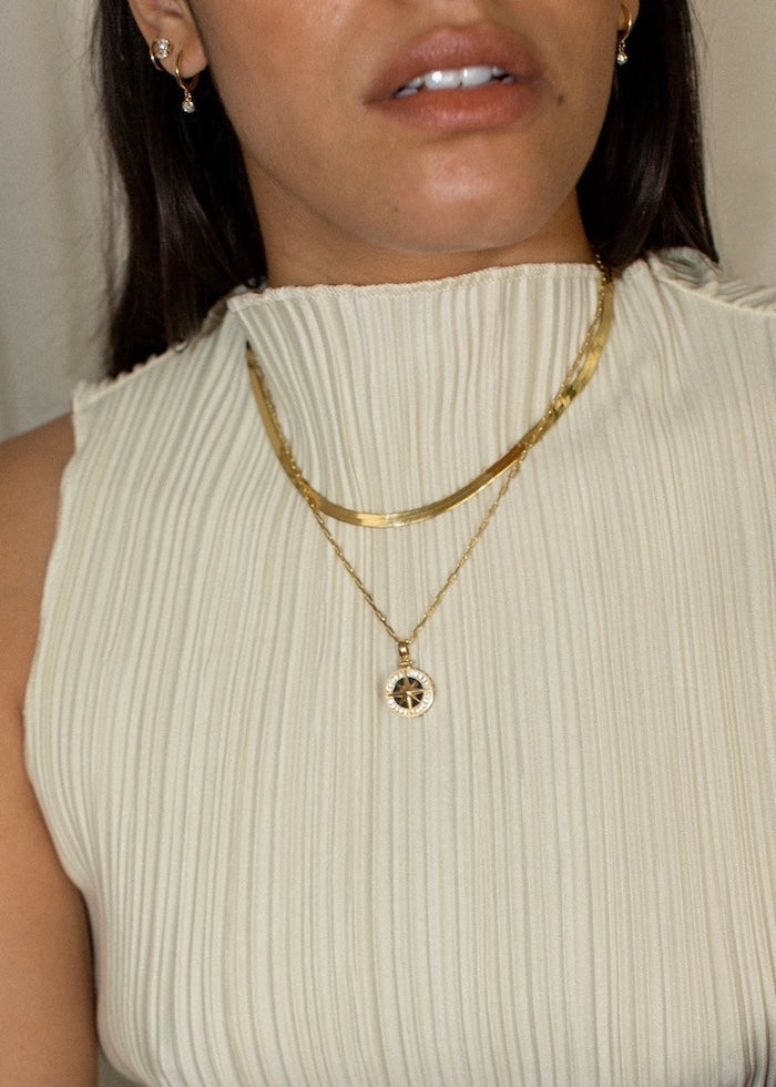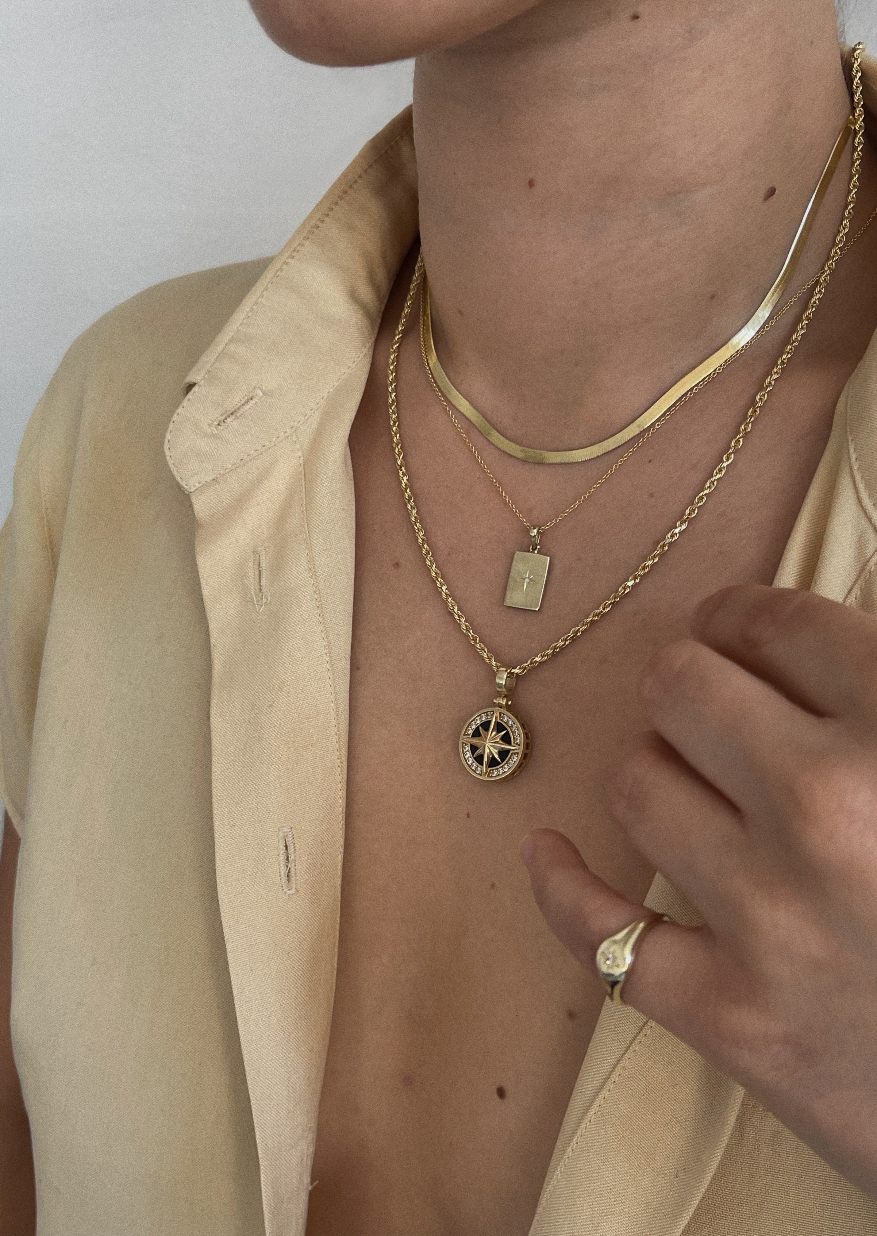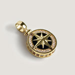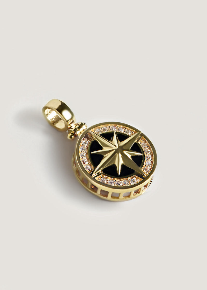 A new member of the North Star Collection, this pendant features a gold north star on an onyx backdrop, bordered by cubic zirconia or diamond stones.